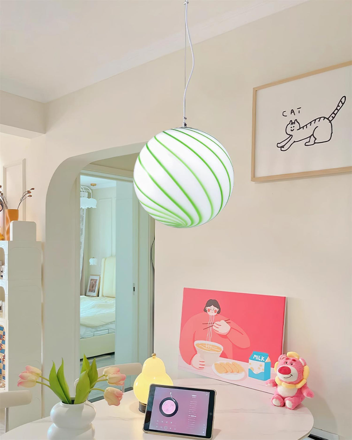 - Add a touch of playful charm to your space with our Lollipop Pendant Lighting. Featuring a whimsical strip glass lampshade that resembles a lollipop, this light fixture creates a cute and cozy atmosphere. The unique design is perfect for adding a touch of personality to any room, from bedrooms to living areas. Illuminate your space with a burst of colorful light and enjoy the cheerful ambiance that our Lollipop Pendant Lighting brings.