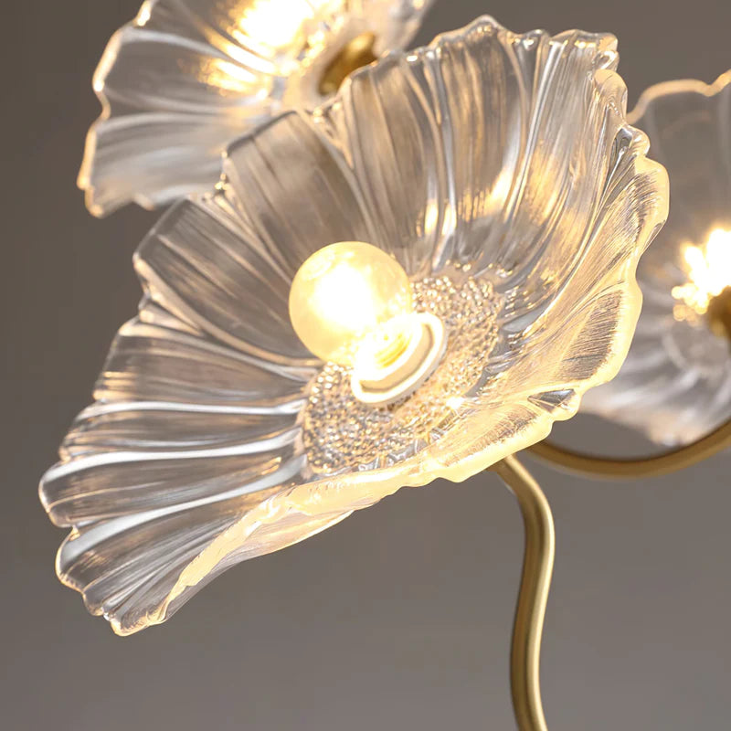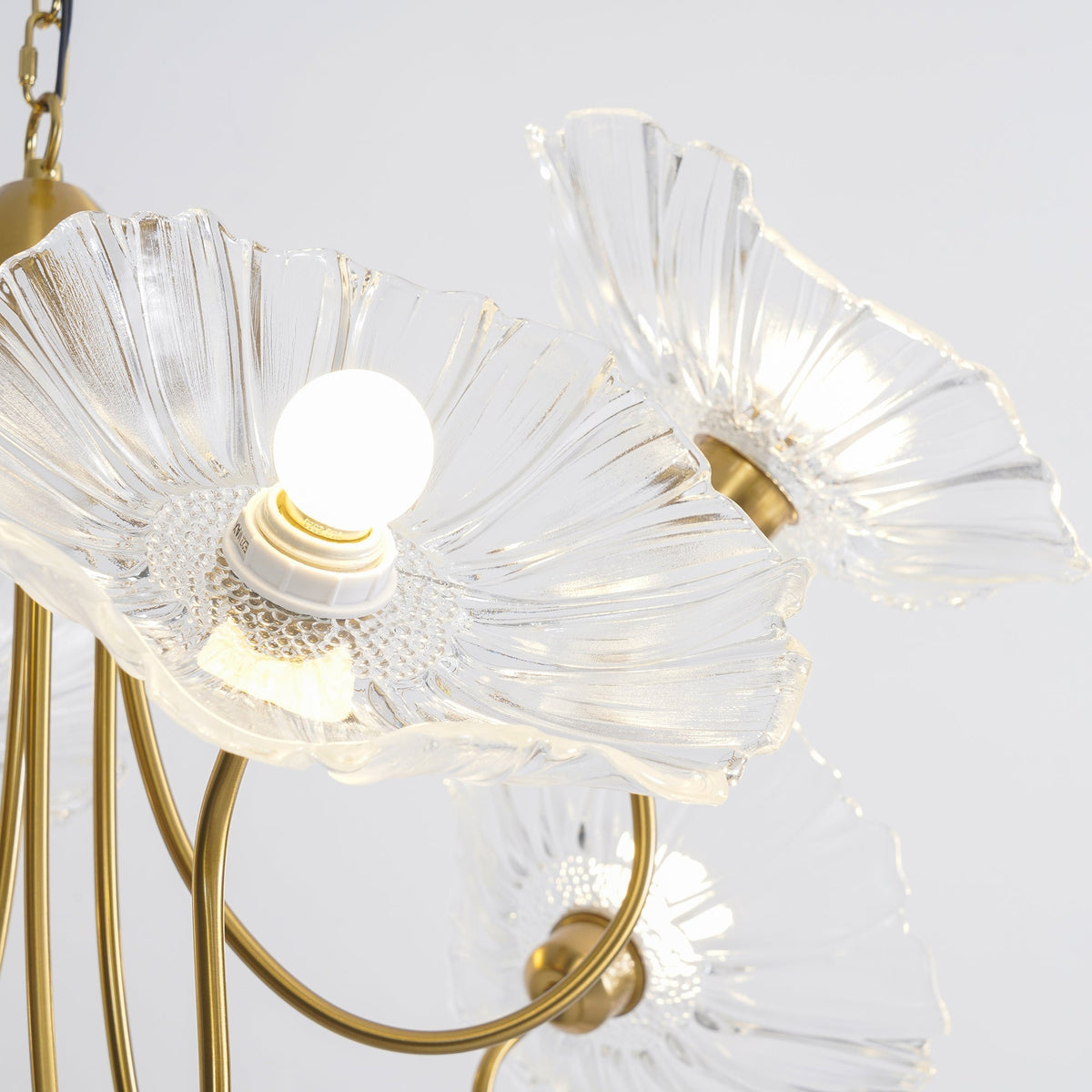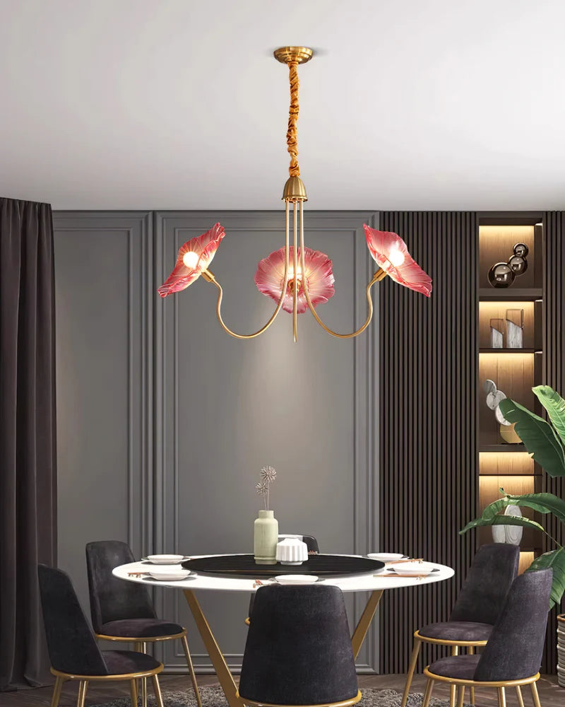 - Elevate your interior with the exquisite Luisa Flower Chandelier. This stunning piece features delicate hand-blown glass shades that shimmer with a soft, ethereal glow. The vintage-inspired hanging chains and curved arms add a touch of timeless elegance to any space. Choose from a three- or six-shade configuration to suit your room’s size and desired ambiance.