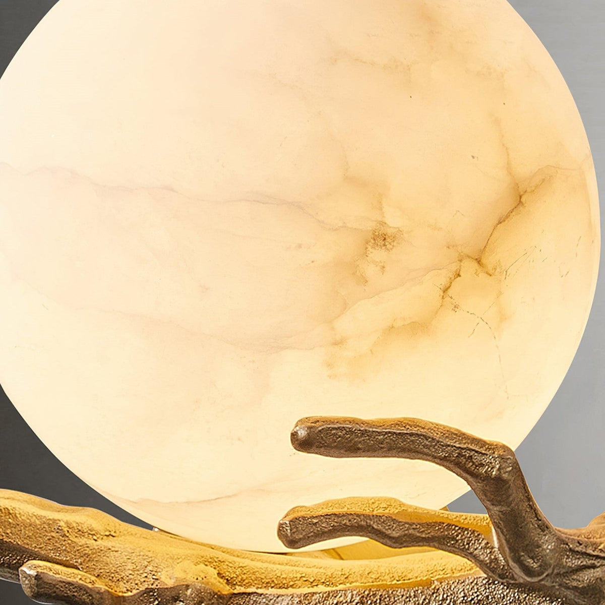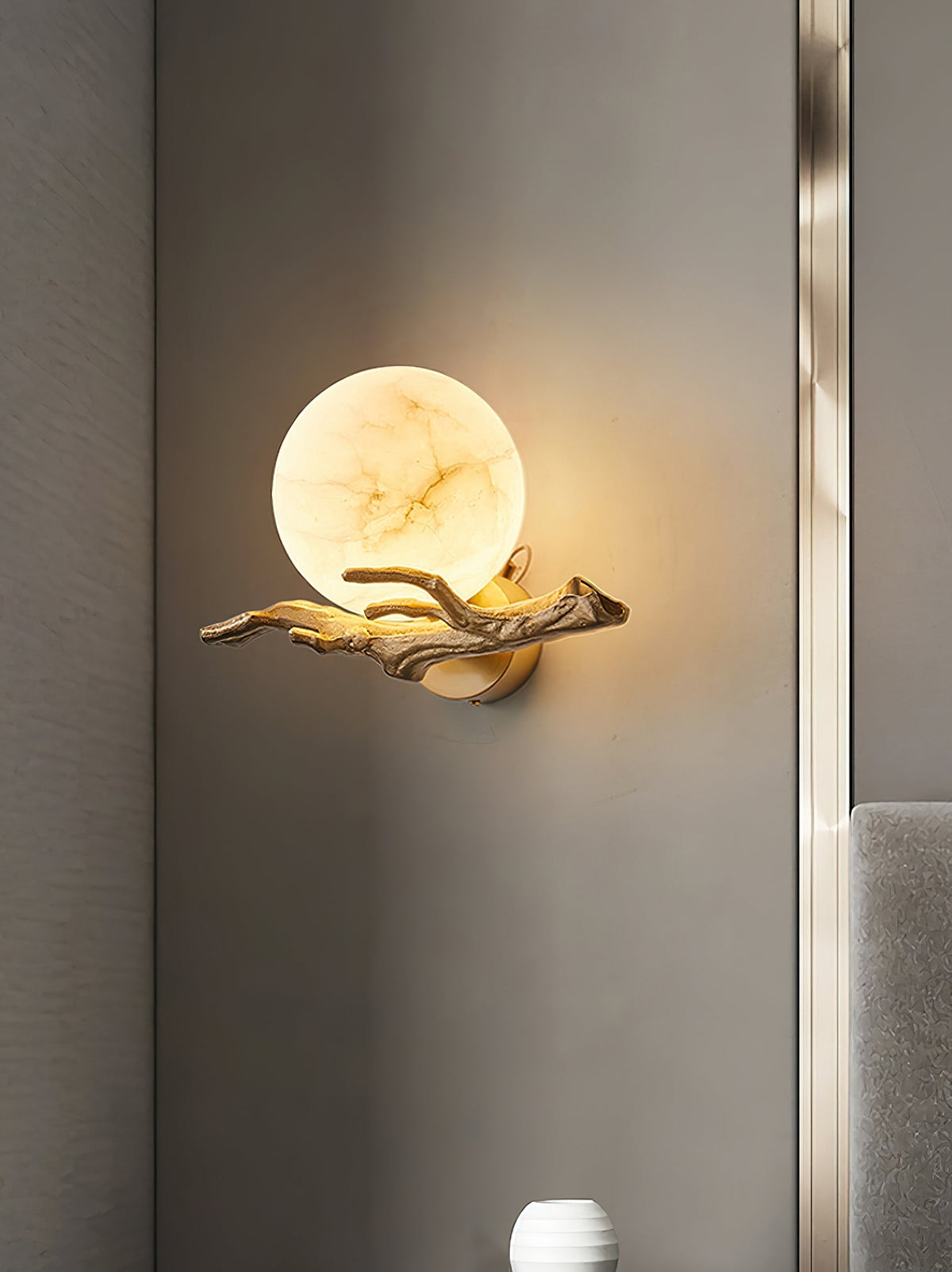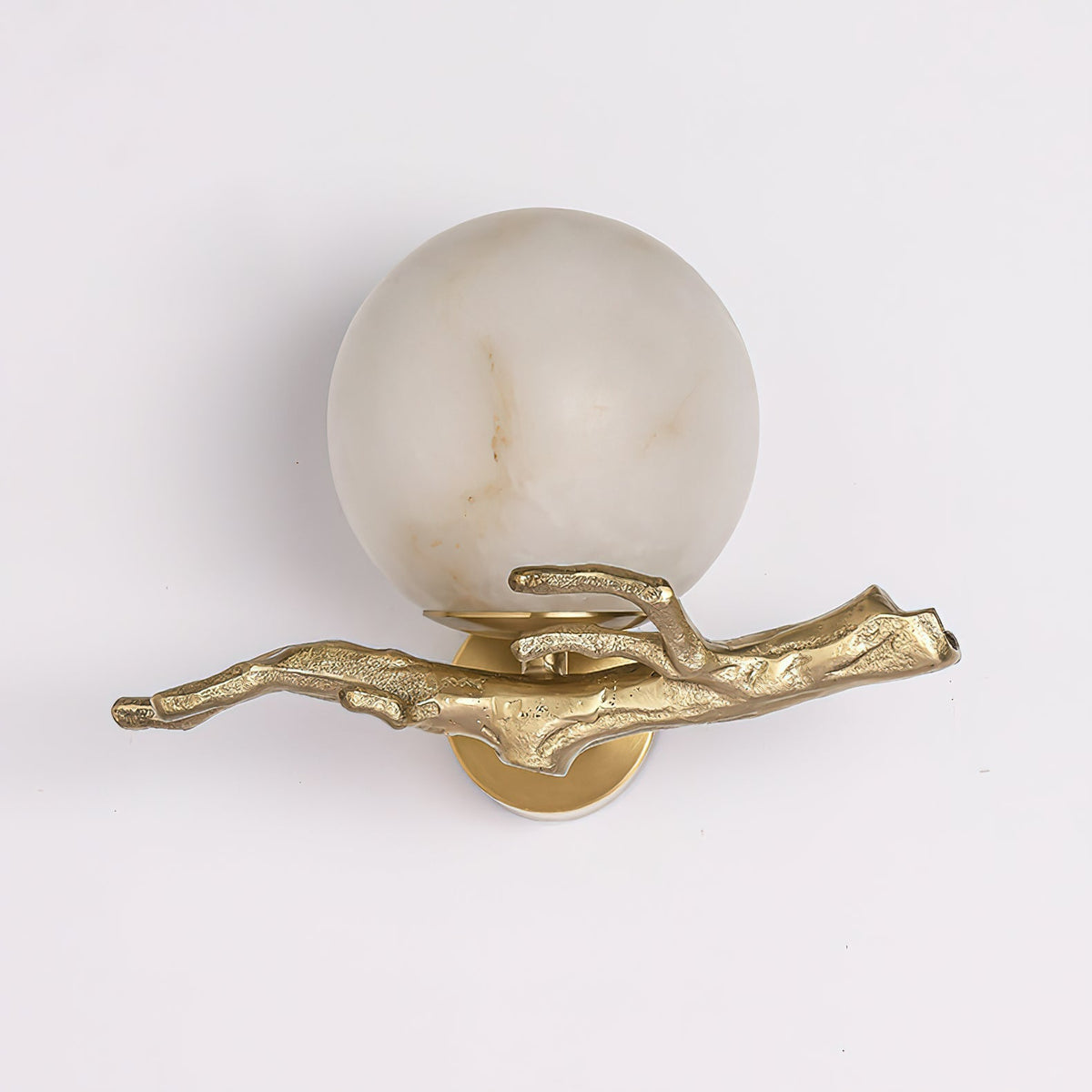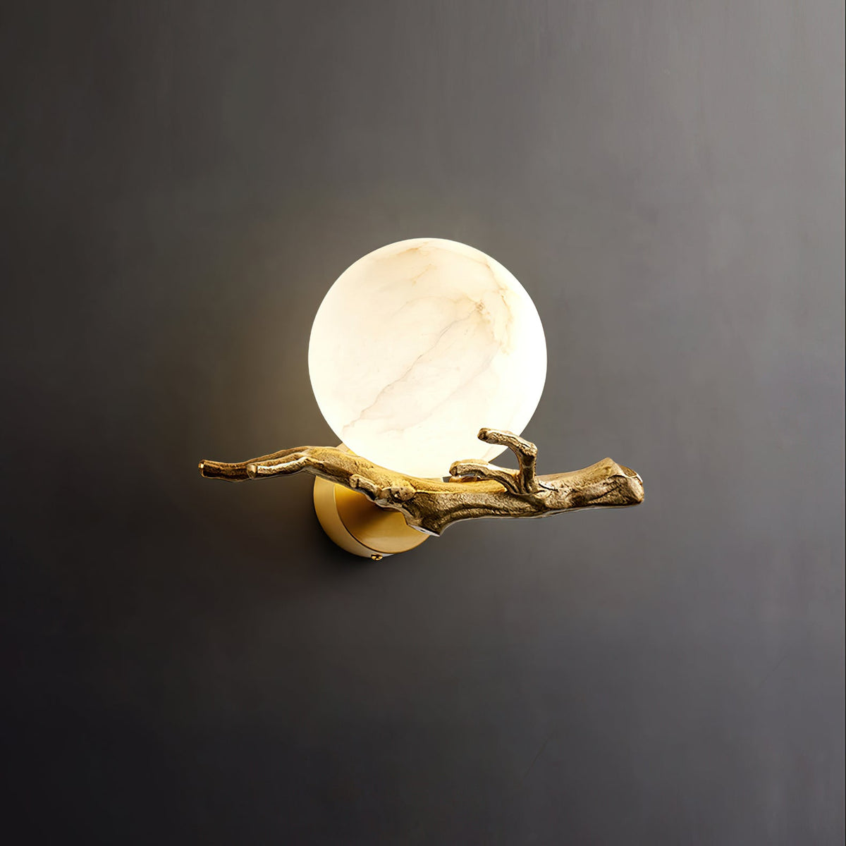 - Illuminate your space with the ethereal beauty of the Lunar Alabaster Wall Sconce. This captivating piece features a chaotic pattern of alabaster, reminiscent of the moon's surface. The intricate tree branch moldings, crafted from shimmering brass, add a touch of fancy. When lit in a dimly lit room, the sconce casts a soft, moonlit glow, creating a serene and enchanting ambiance.