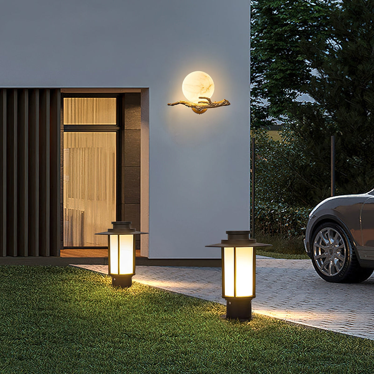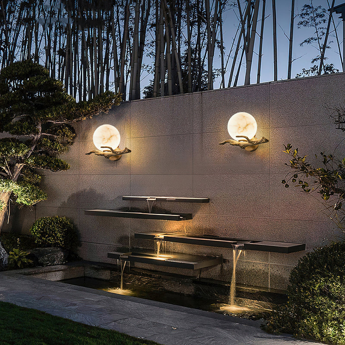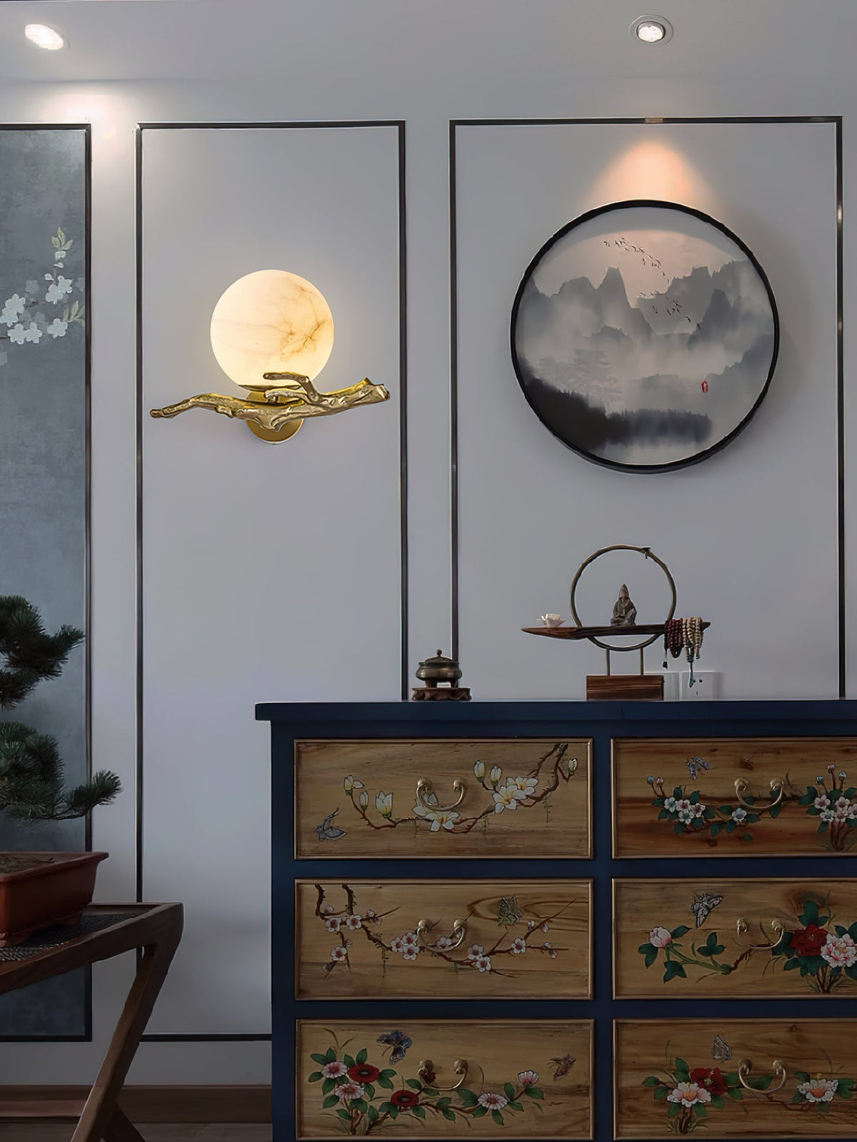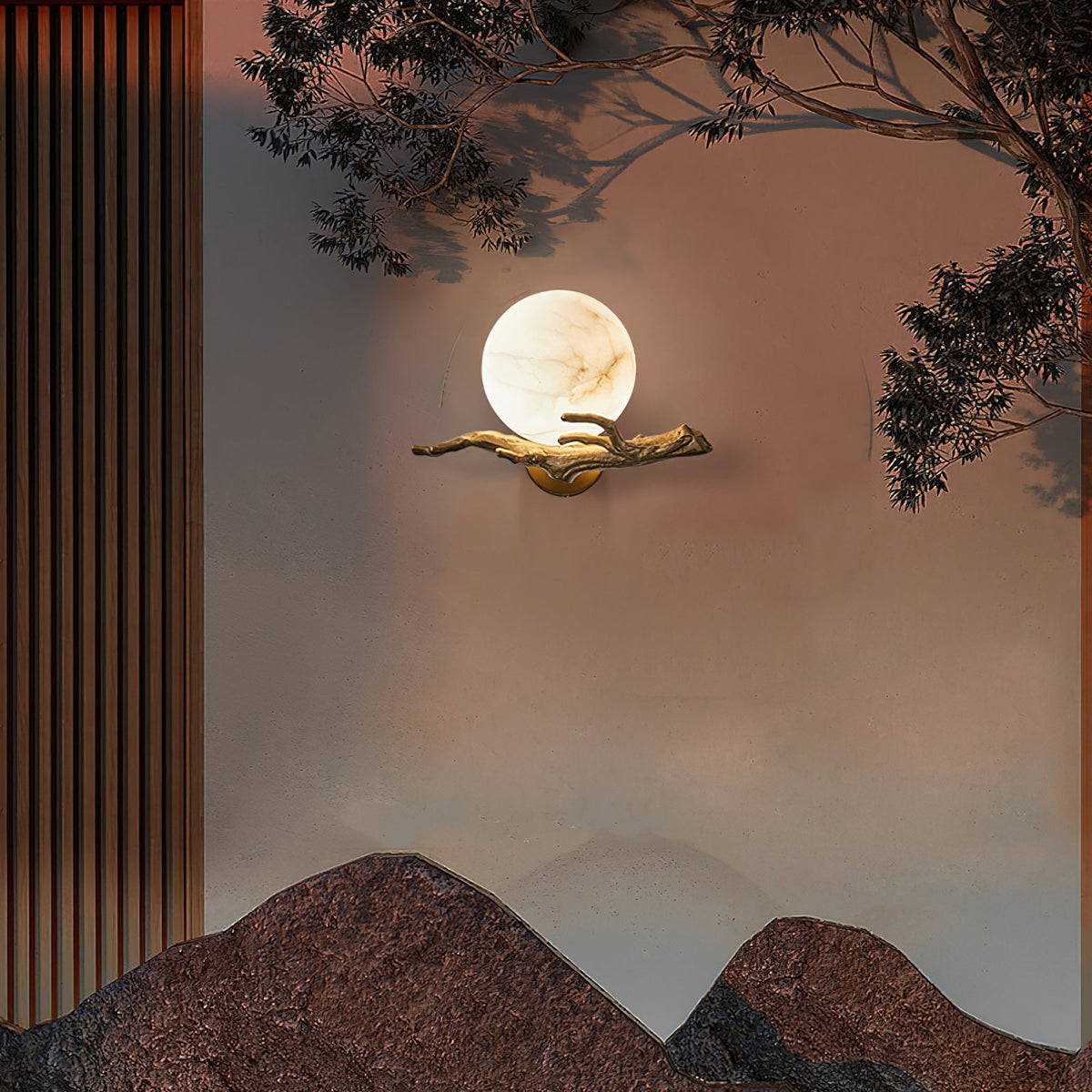 - Illuminate your space with the ethereal beauty of the Lunar Alabaster Wall Sconce. This captivating piece features a chaotic pattern of alabaster, reminiscent of the moon's surface. The intricate tree branch moldings, crafted from shimmering brass, add a touch of fancy. When lit in a dimly lit room, the sconce casts a soft, moonlit glow, creating a serene and enchanting ambiance.