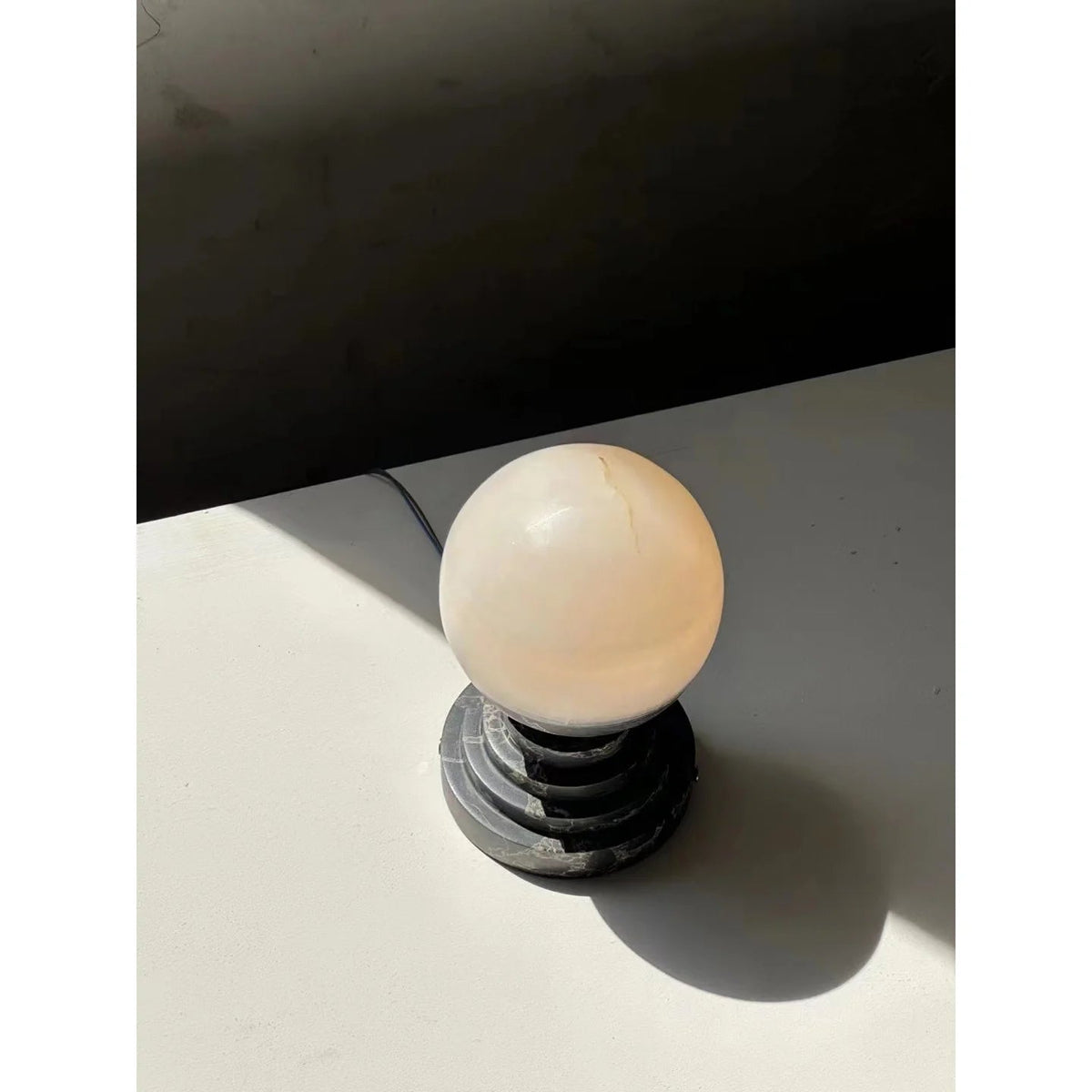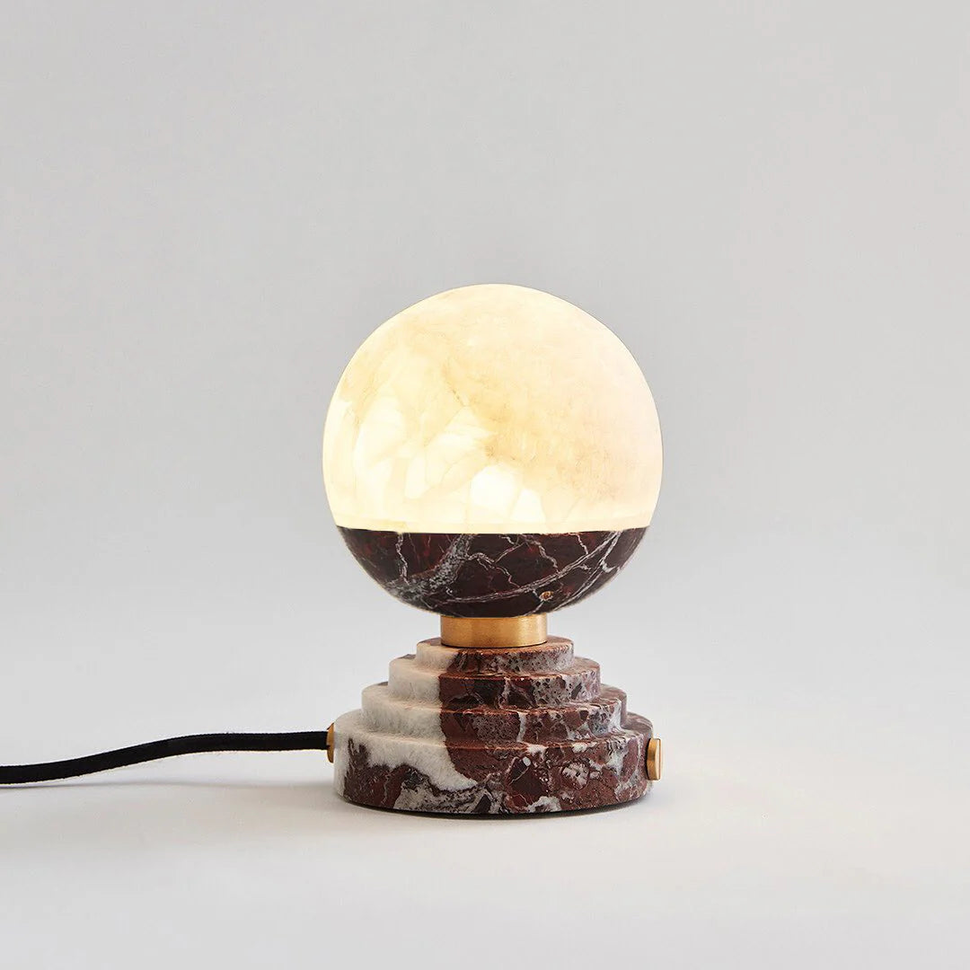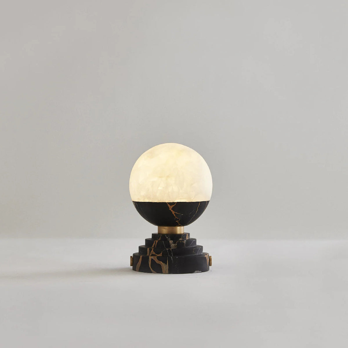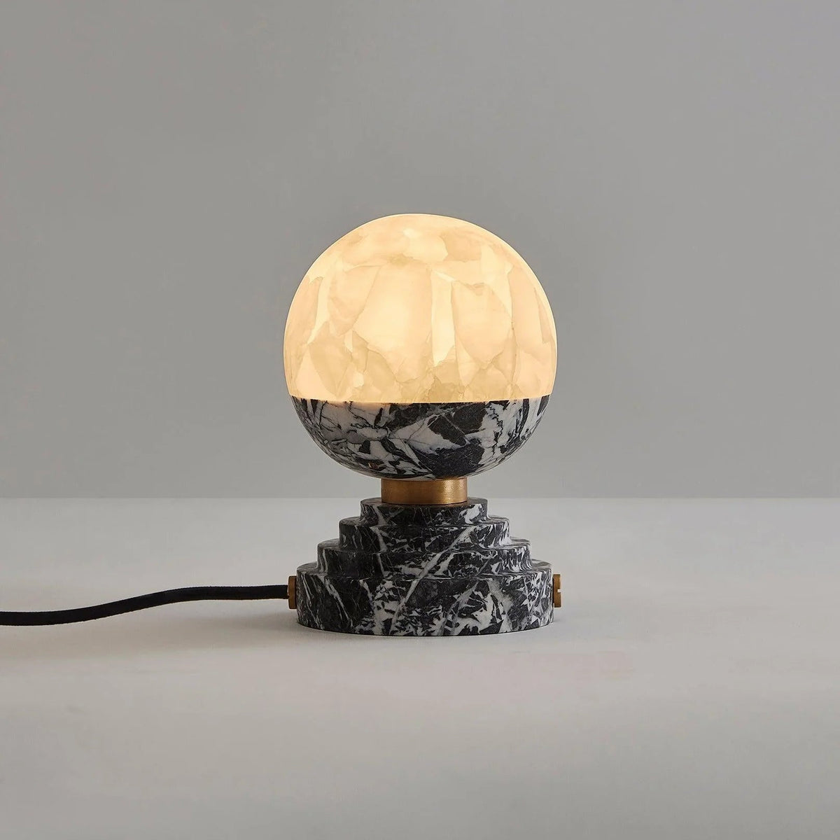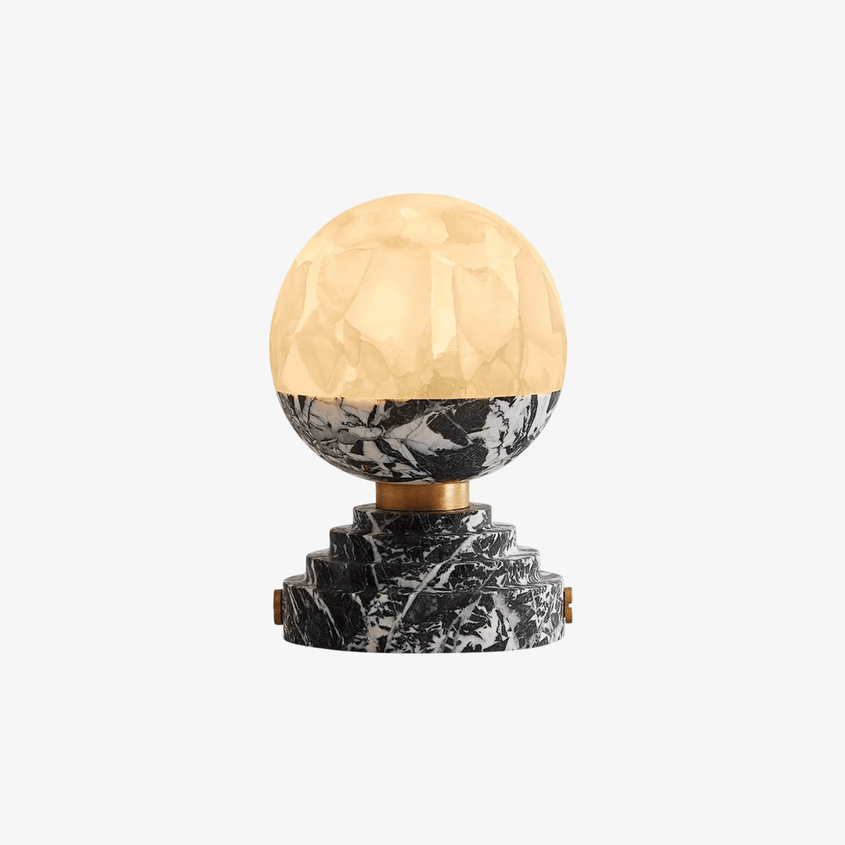 - Elevate your space with the Lunar Table Lamp, a stunning fusion of artistry and illumination. Rising gracefully from a circular, tiered base crafted from luxurious marble, this lamp captures the enchanting allure of a warm moon suspended in a night sky.