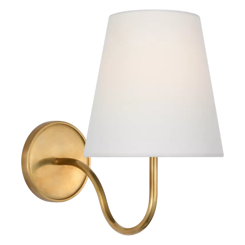 - The foundation of its design is the elegant interplay between the enduring beauty of brass and the organic, breathable texture of natural linen. The warm, polished brass frame is meticulously formed into gentle, curved lines that catch the light softly throughout the day. This structure cradles a drum shade of premium, natural linen, whose subtle variations and soft weave ensure each sconce is uniquely its own.