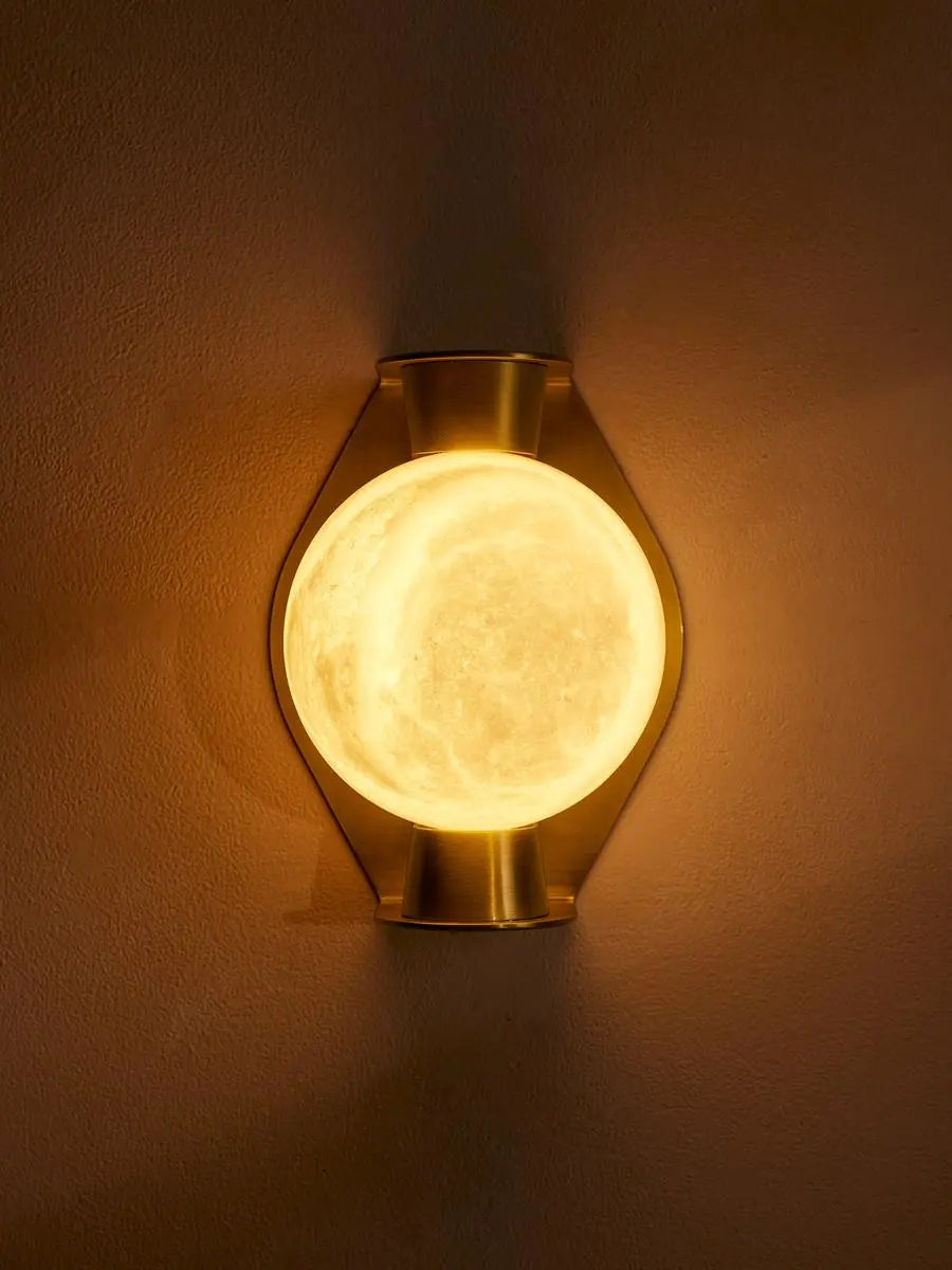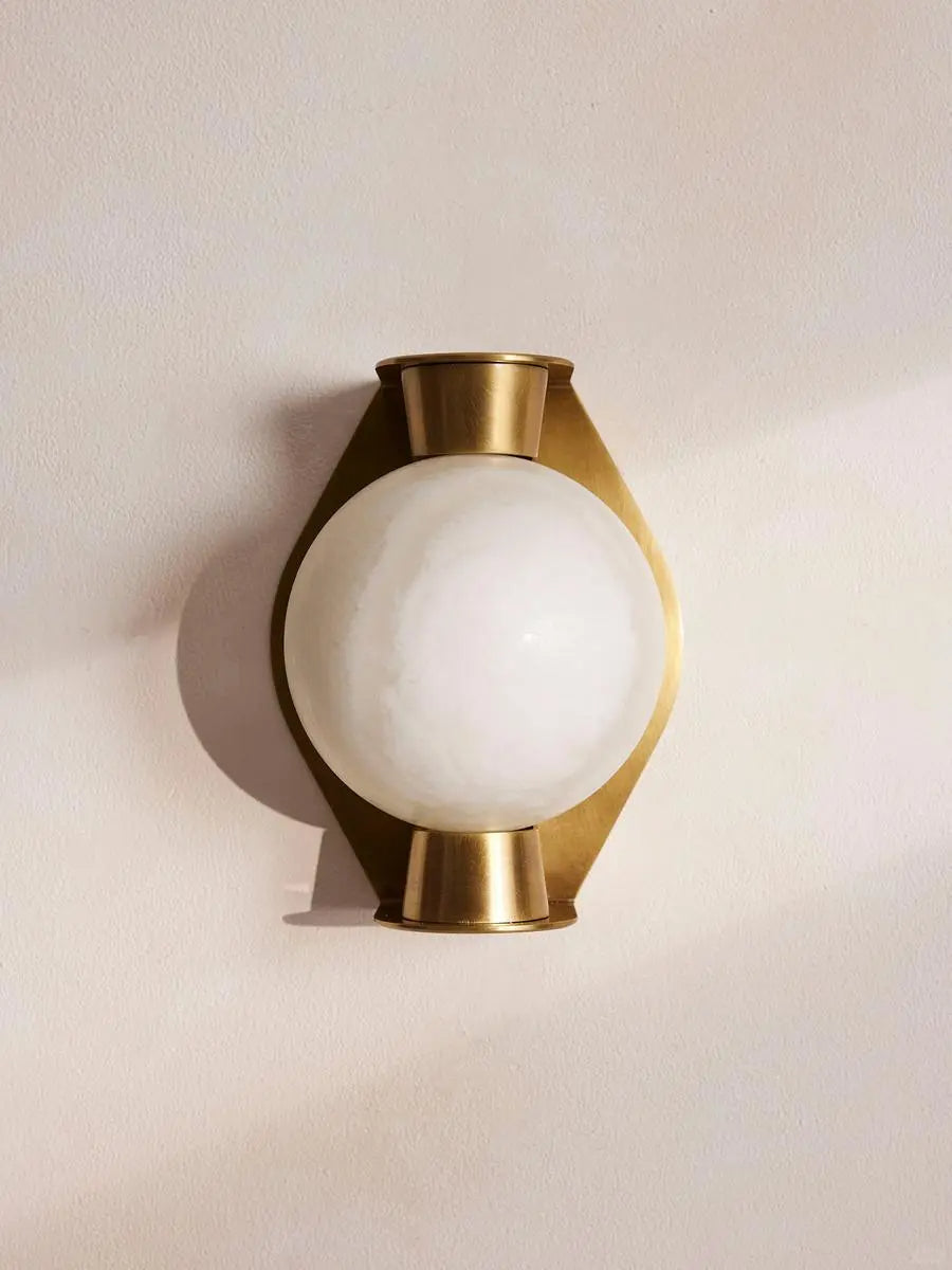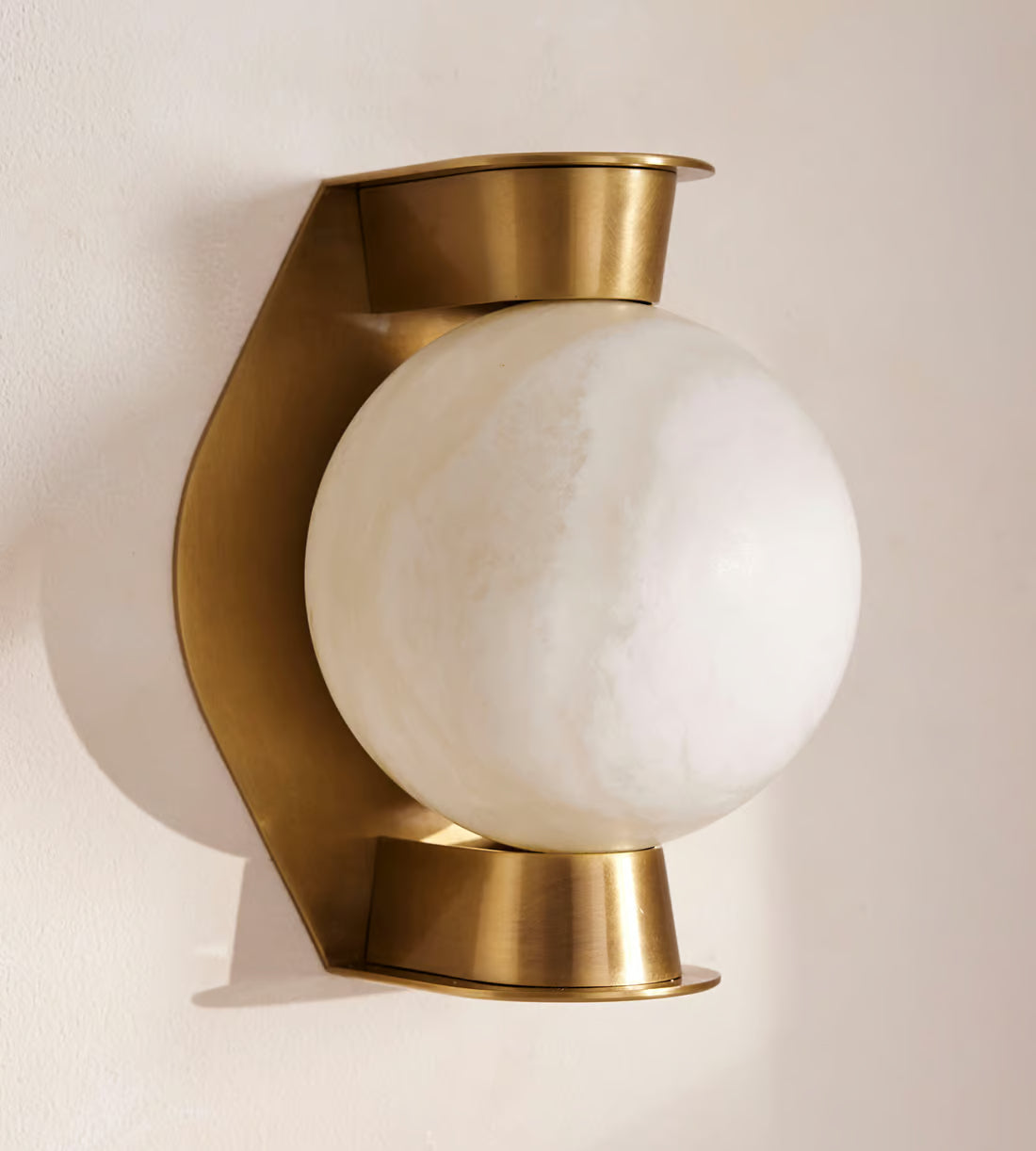 - Each Broege Alabaster Sconce is a one-of-a-kind masterpiece, featuring a stunning orb-shaped alabaster globe with delicate natural veining that ripples across its surface. The warm, translucent glow of the alabaster creates a soft, inviting ambiance, while its smooth, rounded form sits seamlessly against an elegantly antiqued brass frame.