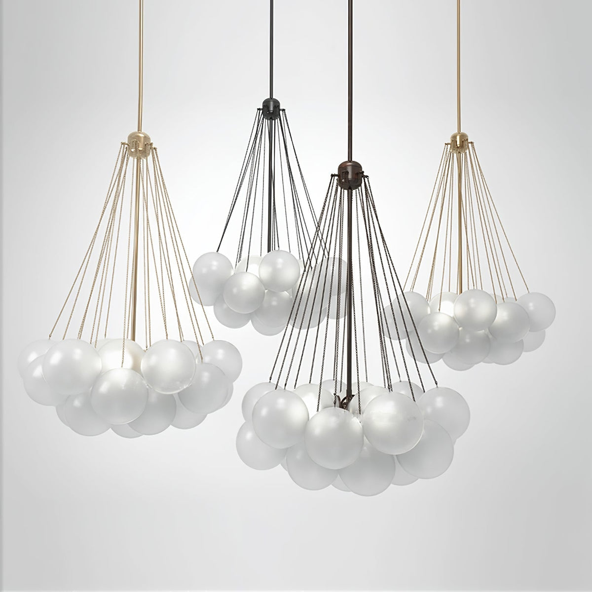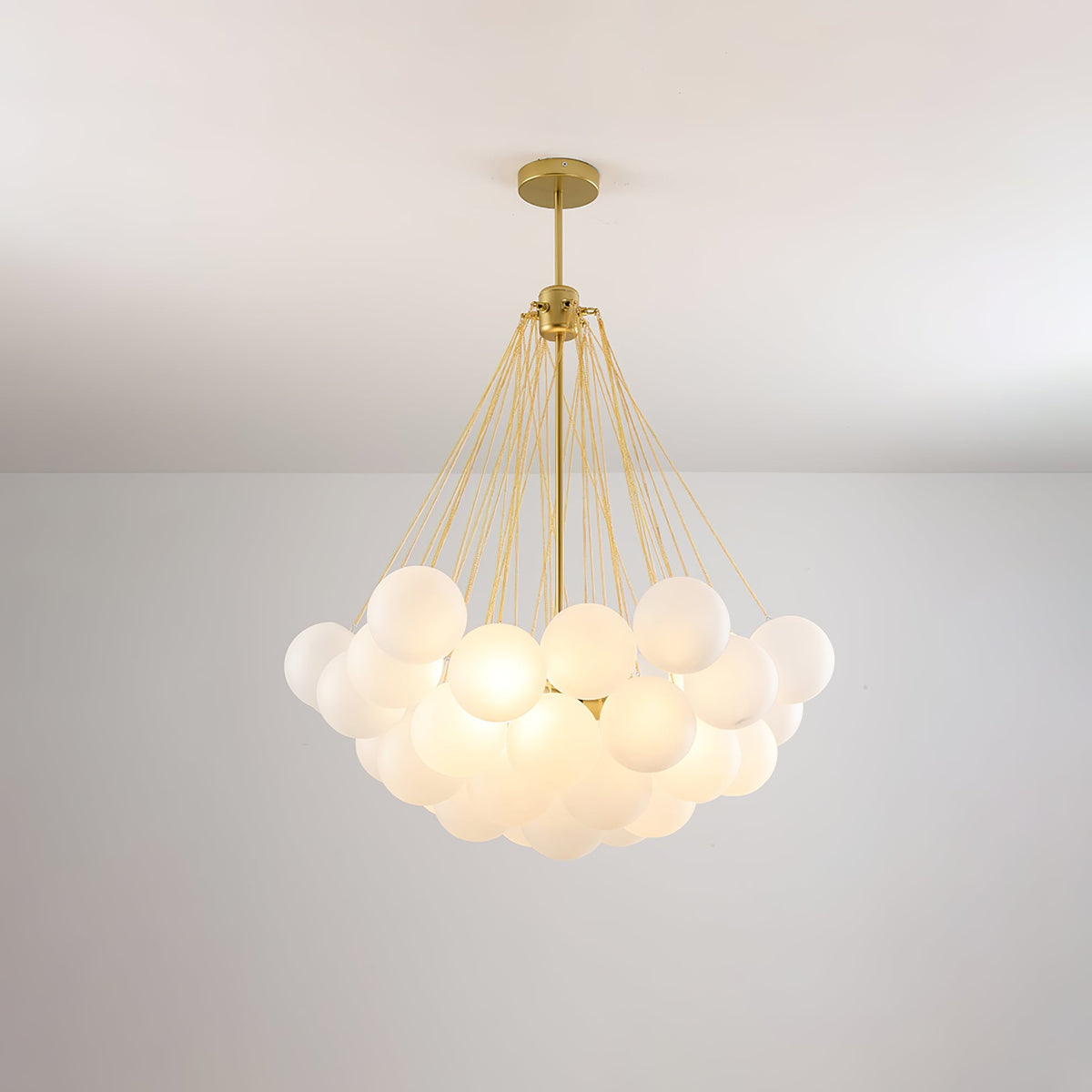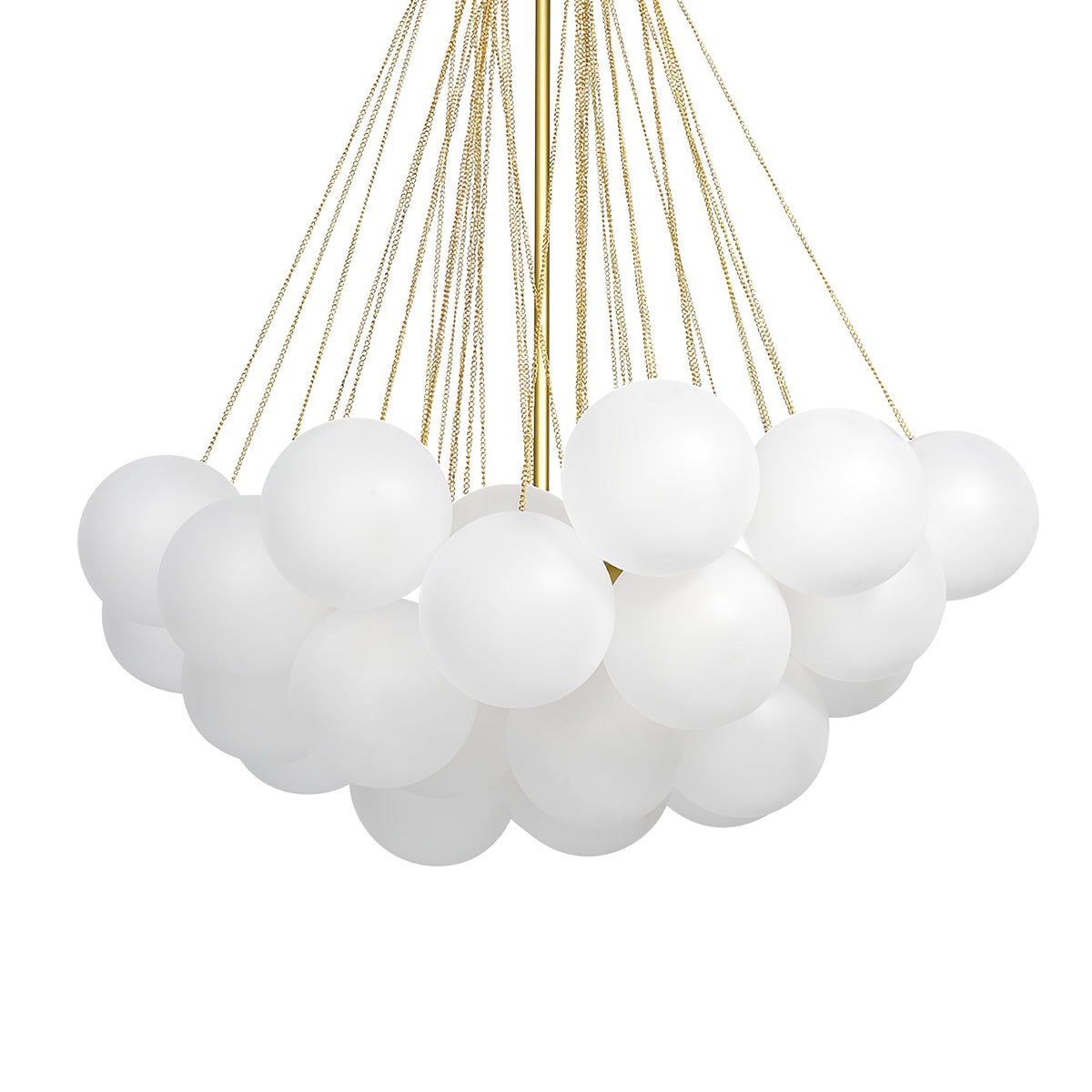 - Many glass frosted orbs are suspended together, refracting the light from the central light source to all corners with a gentle, bright light. The center light body is made of aluminum, maintaining strength while being lighter in weight.