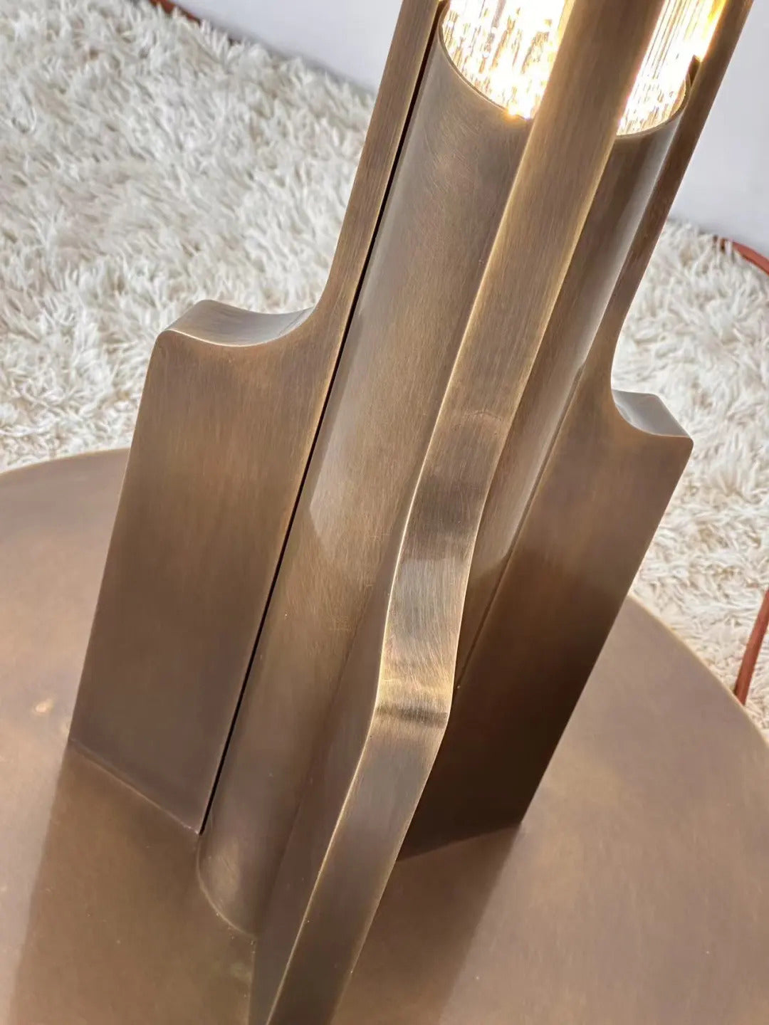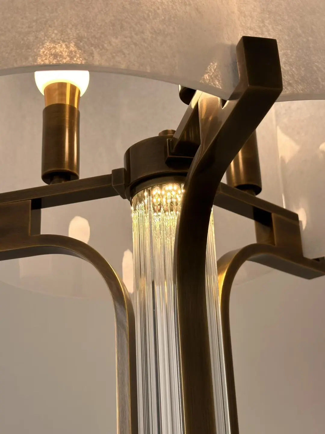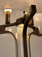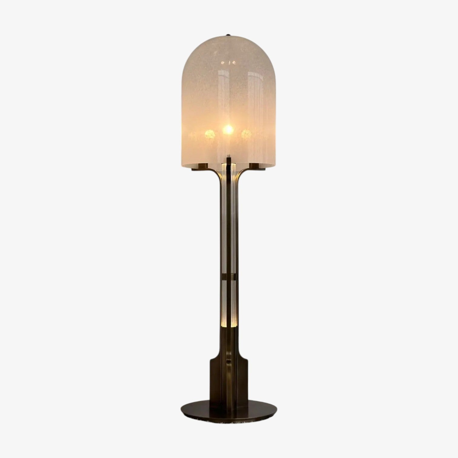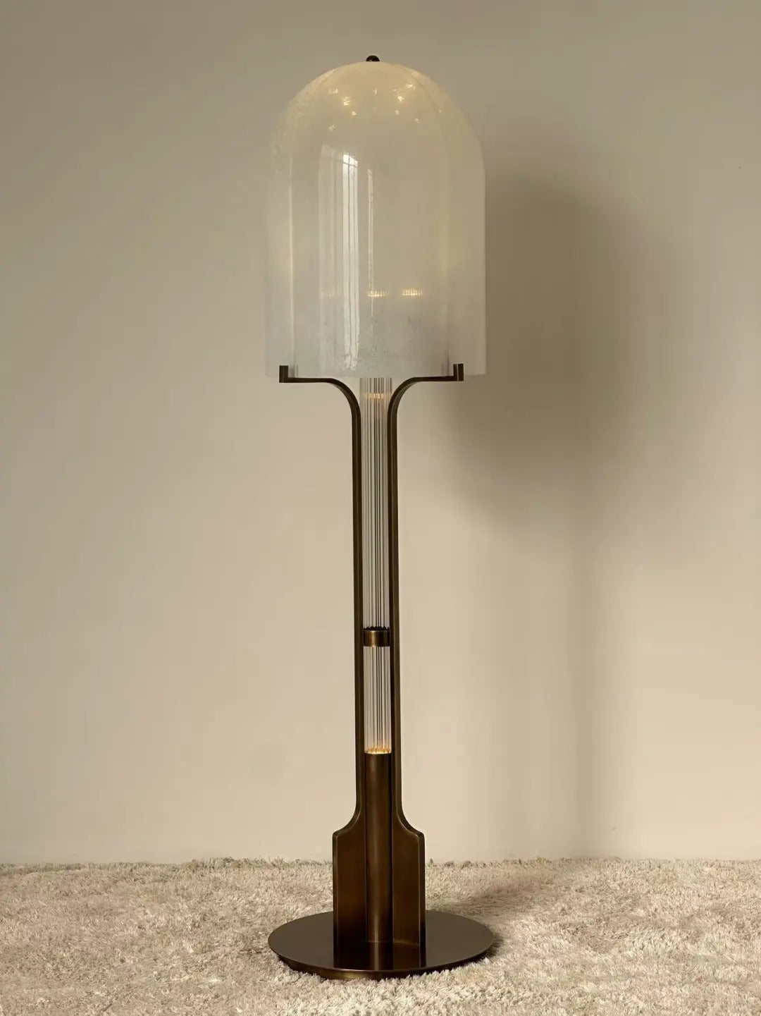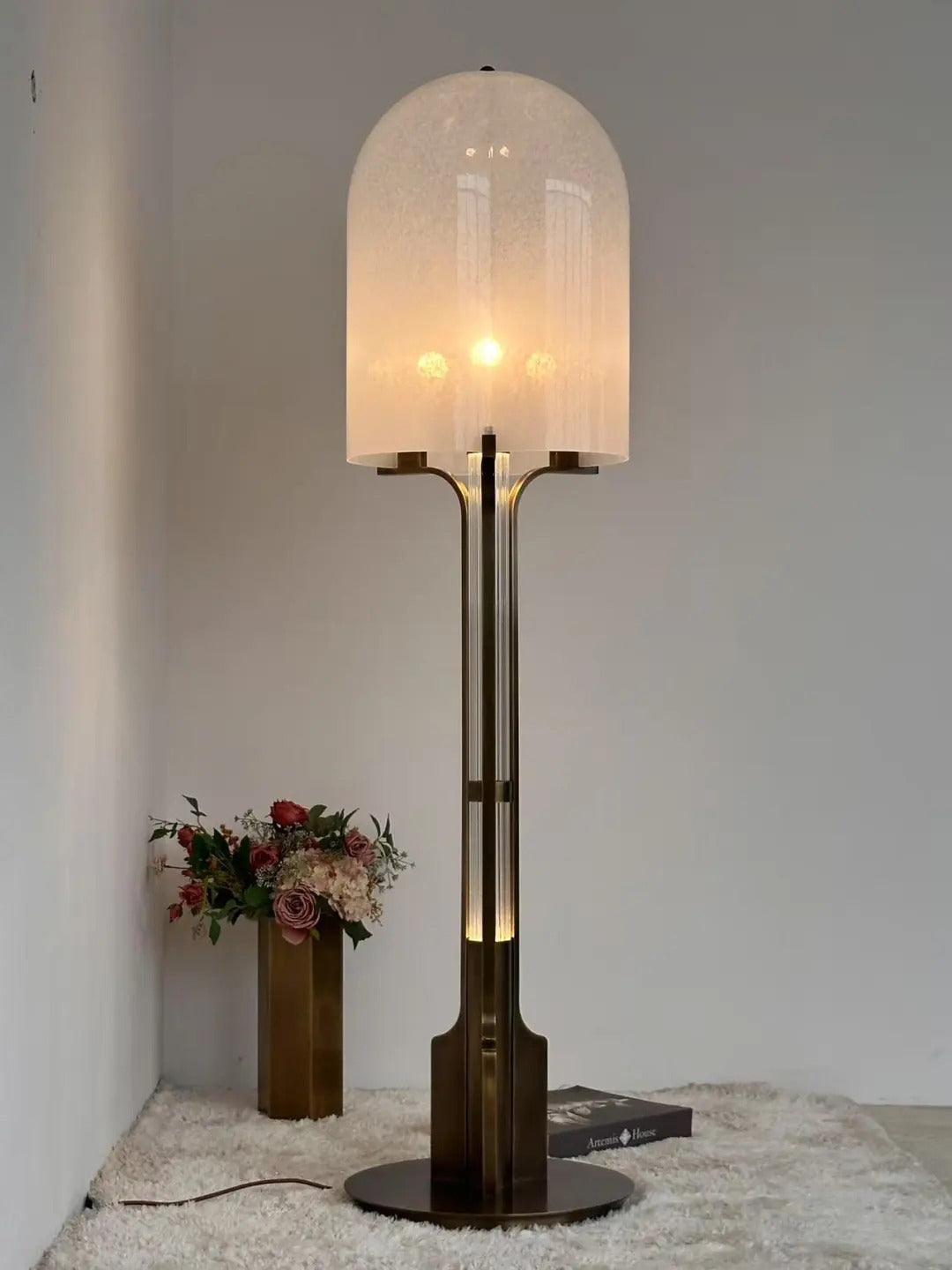 • Bring sophisticated Art Deco glamour to your home with the Aura Dome Floor Lamp, an exquisite lighting piece that offers innovative, dual-layer illumination. Its beautiful cloud-glass dome is subtly detailed with natural grains, resting atop a solid, anodised brass base finished in a rich, dark chocolate patina. The elegance continues up the vertical post, its vertical post that is built with a second light source that allows its inner fluted glass tube to glow in three lux levels.