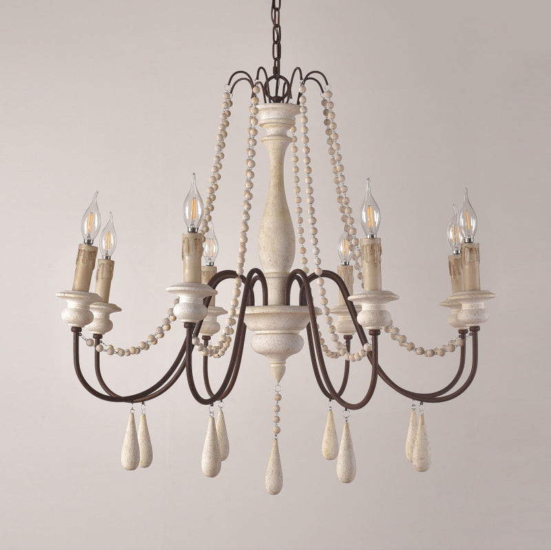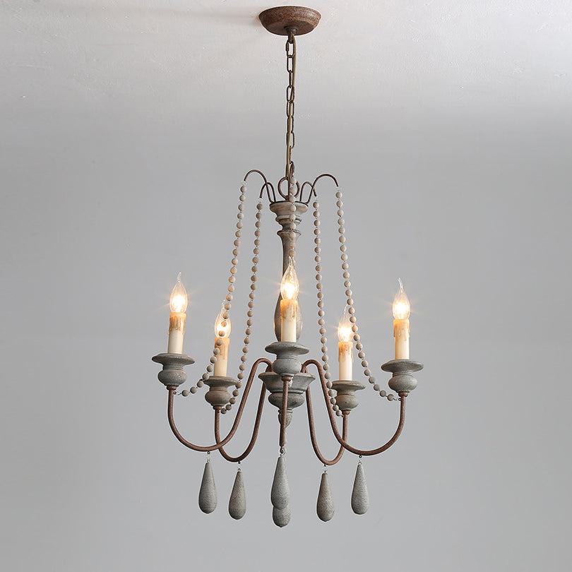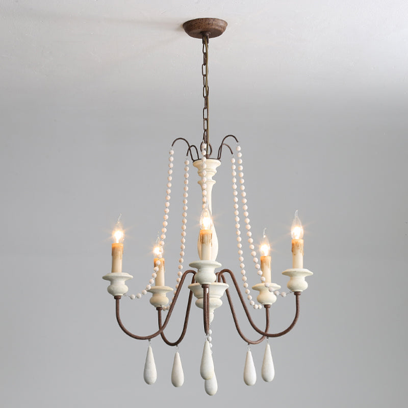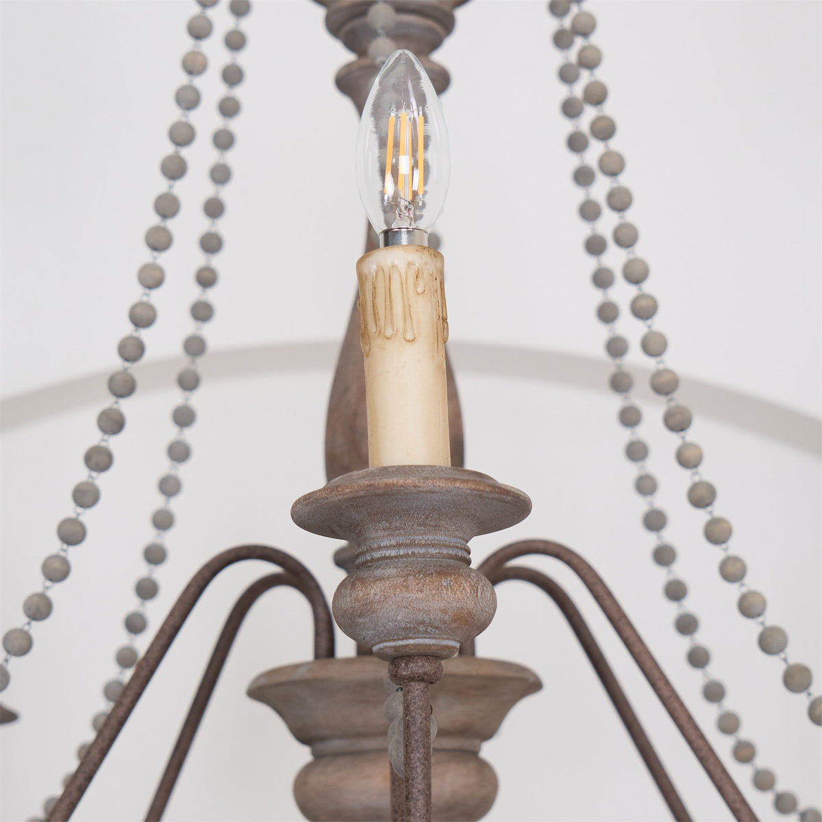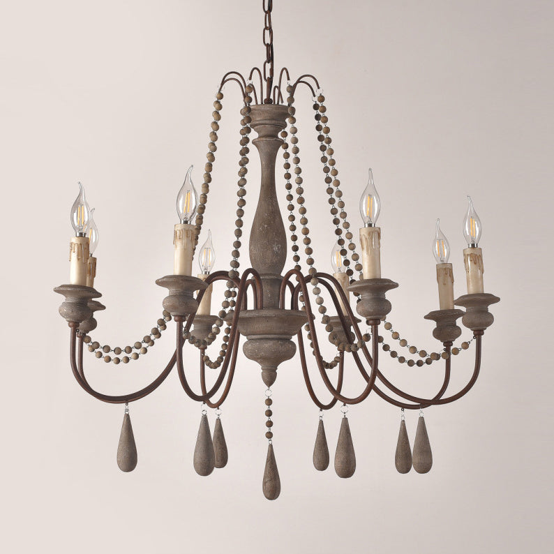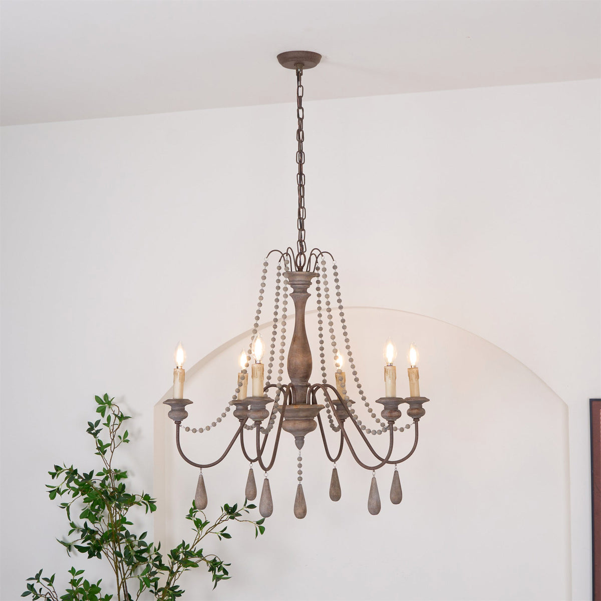 - This elegant Farmhouse Beaded Chandelier adds a touch of timeless charm to any space. Featuring gracefully scrolling arms adorned with strands of wooden beads, this chandelier creates a captivating and inviting atmosphere. Dangling teardrop ornaments echo the natural theme, completing the look with a touch of rustic elegance. The combination of heavy, rust-toned metal and distressed wood creates a warm and inviting contrast that perfectly complements farmhouse, rustic, and cottage-style decor.