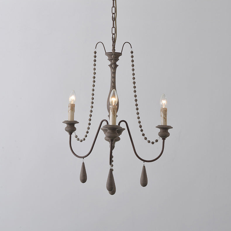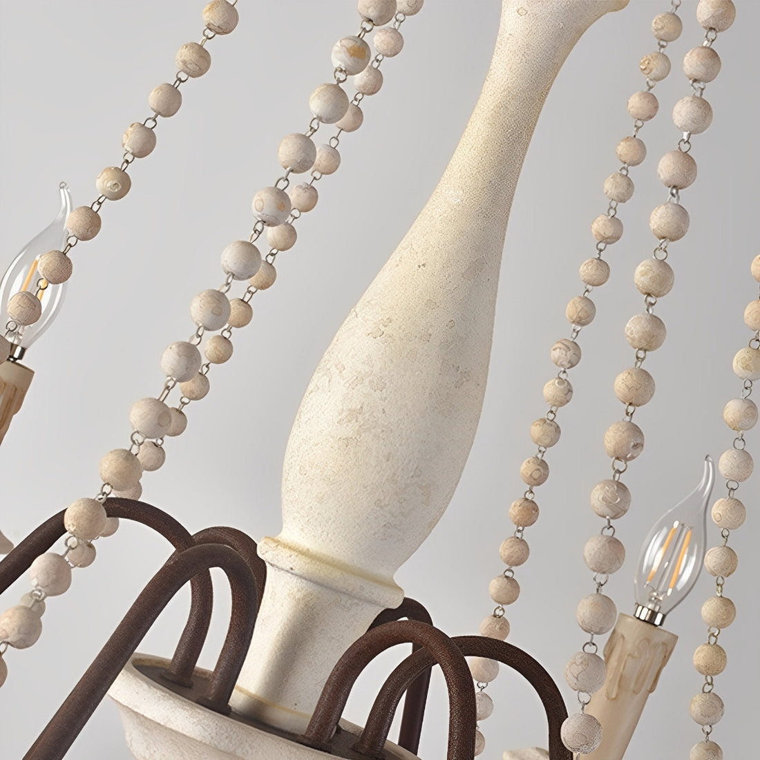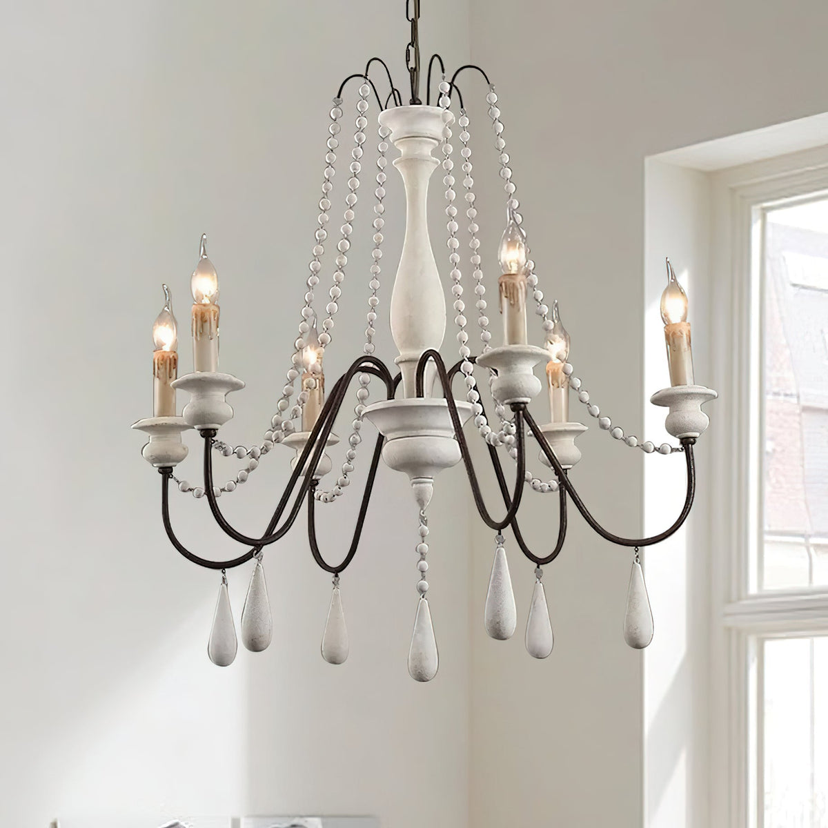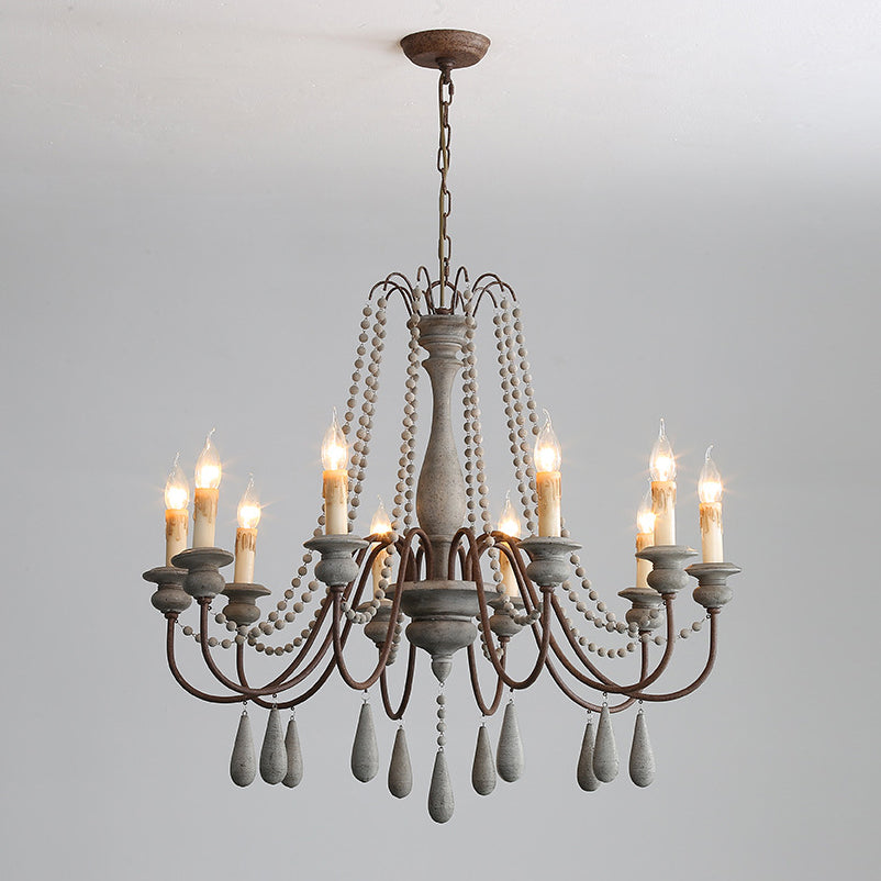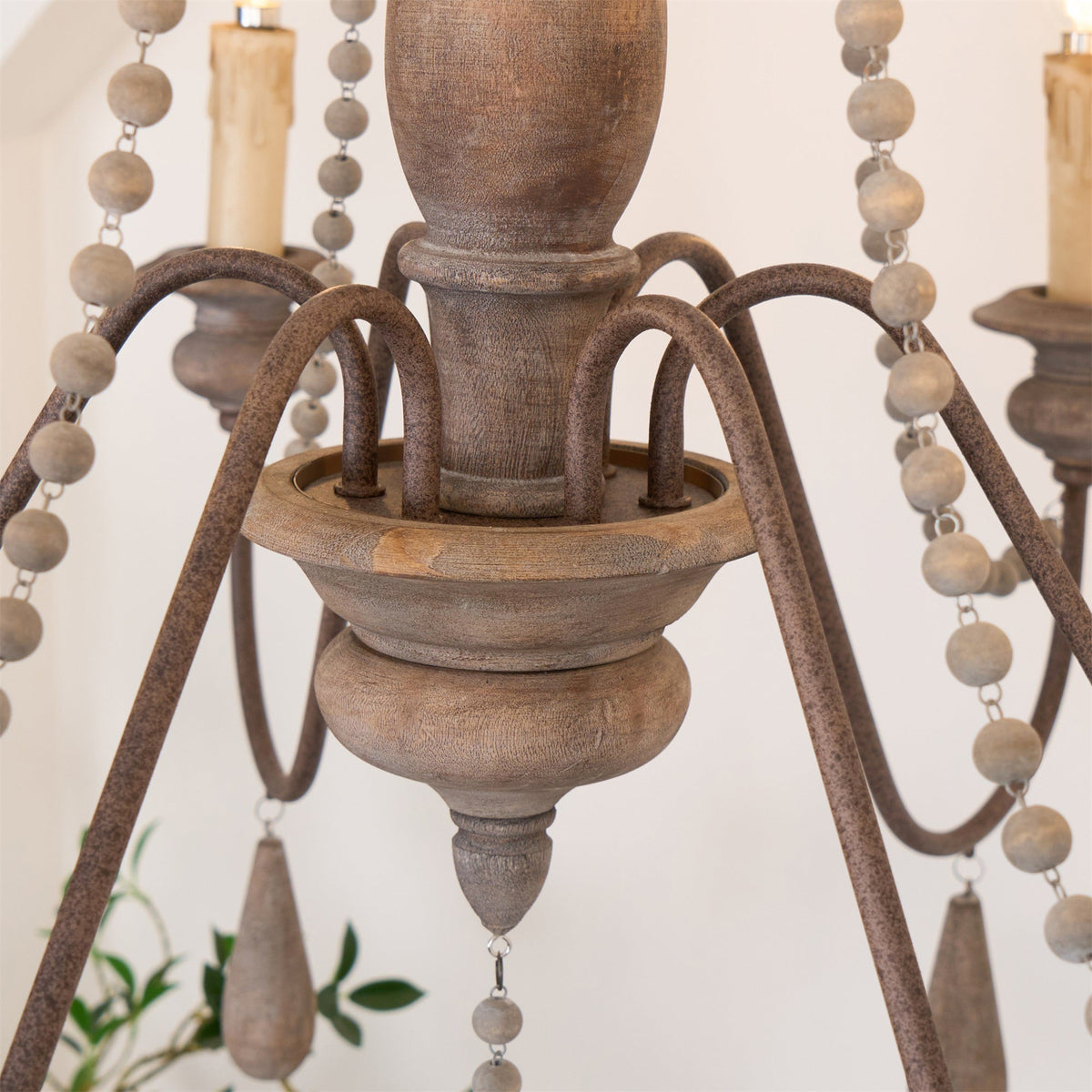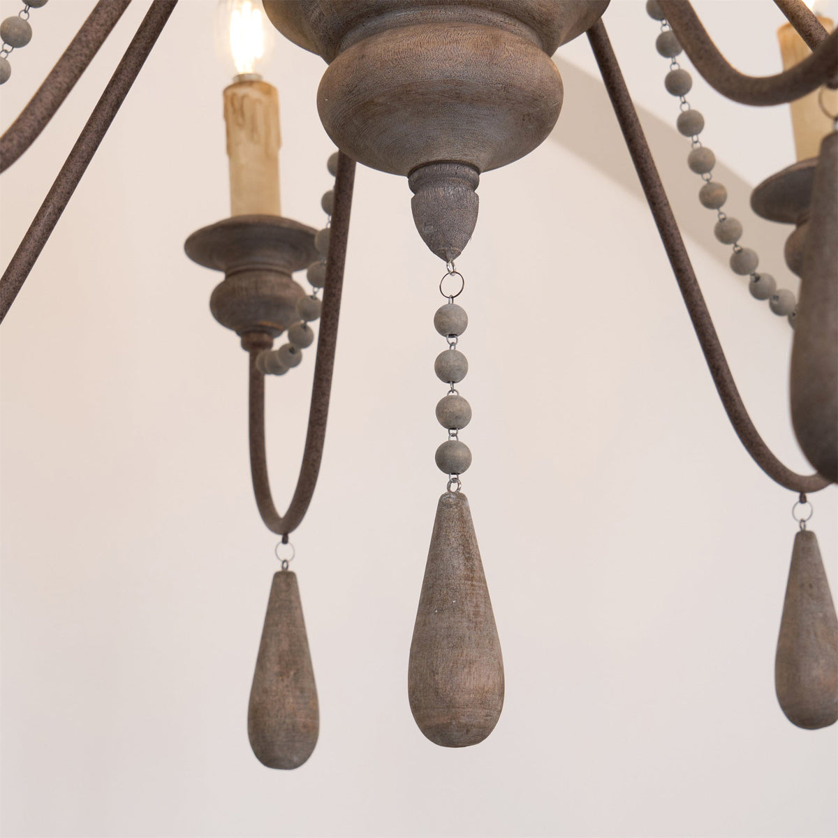 - This elegant Farmhouse Beaded Chandelier adds a touch of timeless charm to any space. Featuring gracefully scrolling arms adorned with strands of wooden beads, this chandelier creates a captivating and inviting atmosphere. Dangling teardrop ornaments echo the natural theme, completing the look with a touch of rustic elegance. The combination of heavy, rust-toned metal and distressed wood creates a warm and inviting contrast that perfectly complements farmhouse, rustic, and cottage-style decor.