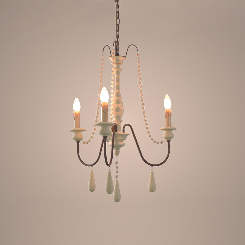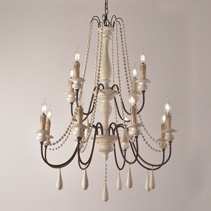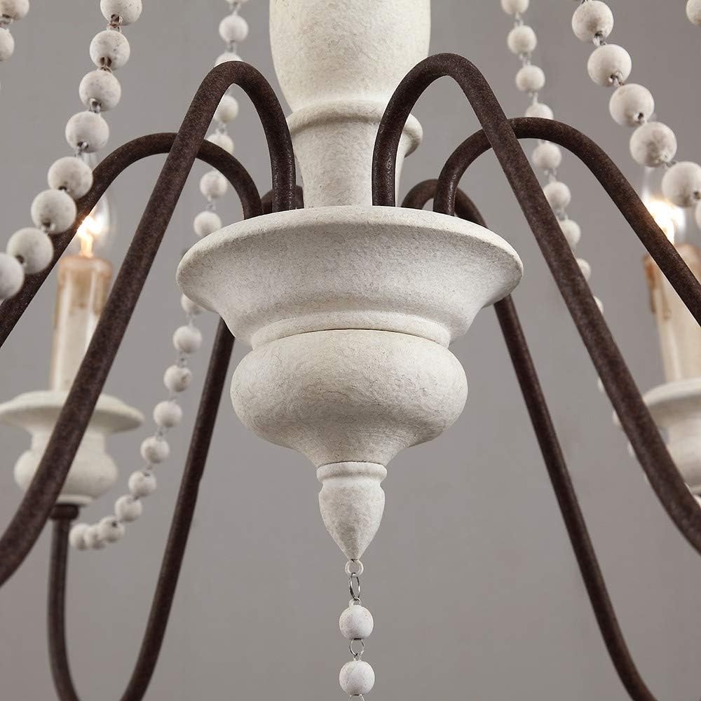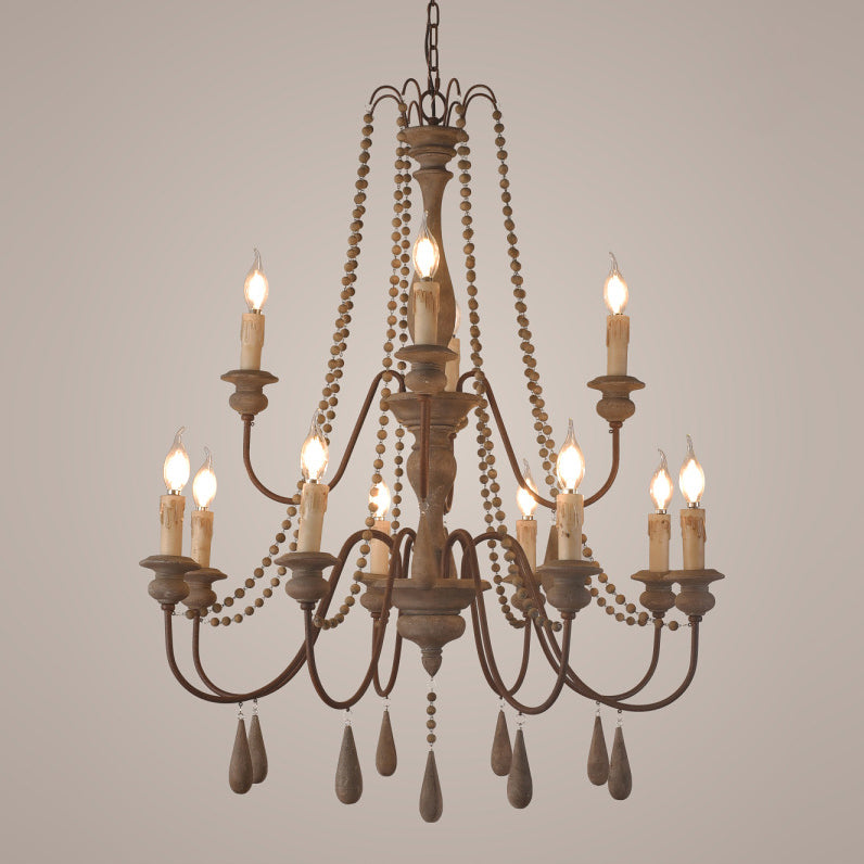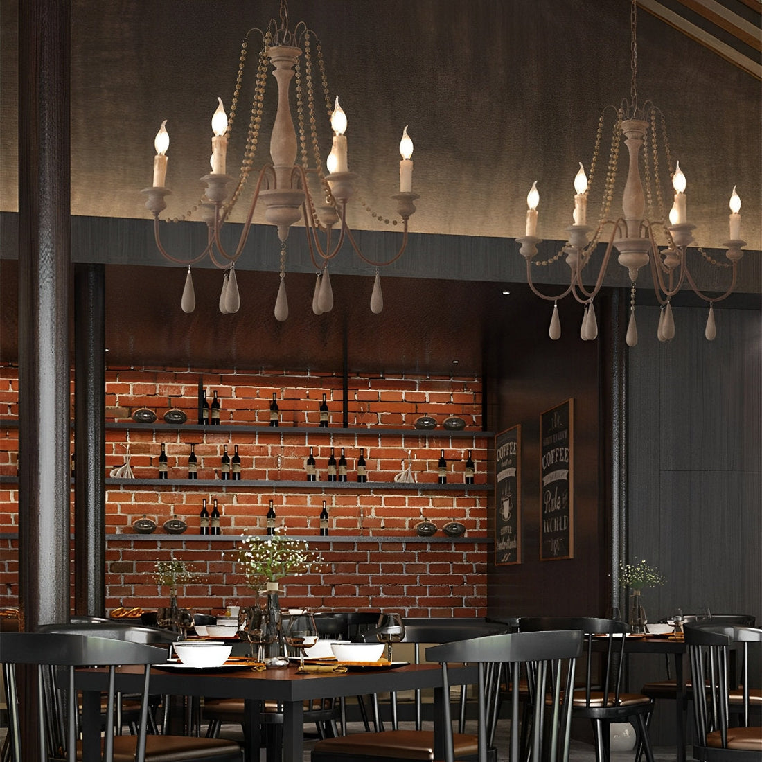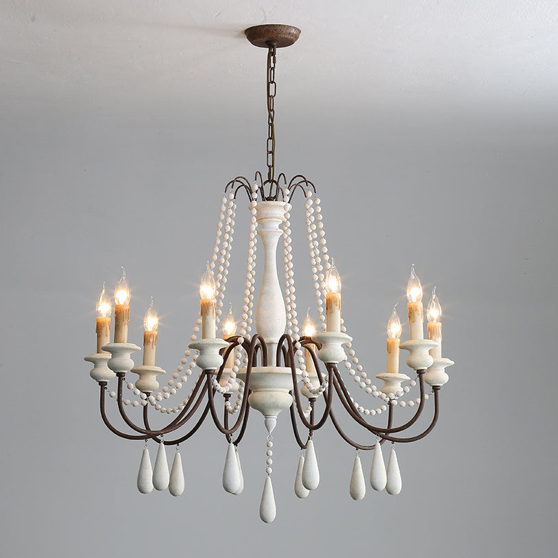 - This elegant Farmhouse Beaded Chandelier adds a touch of timeless charm to any space. Featuring gracefully scrolling arms adorned with strands of wooden beads, this chandelier creates a captivating and inviting atmosphere. Dangling teardrop ornaments echo the natural theme, completing the look with a touch of rustic elegance. The combination of heavy, rust-toned metal and distressed wood creates a warm and inviting contrast that perfectly complements farmhouse, rustic, and cottage-style decor.