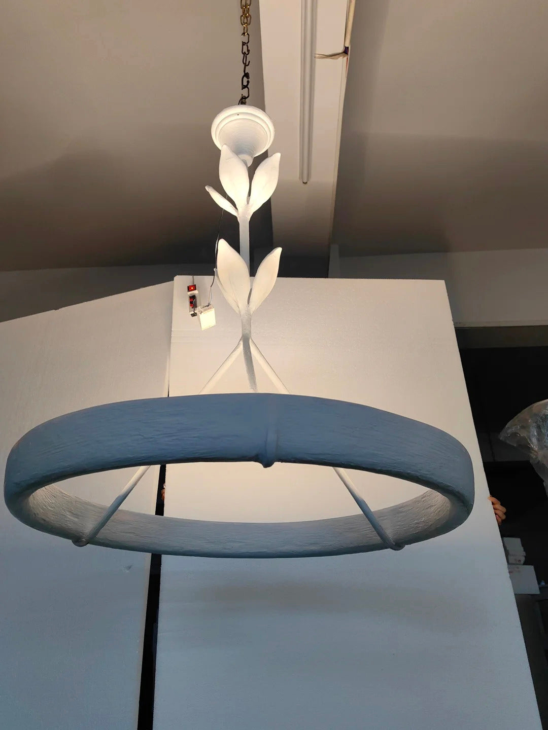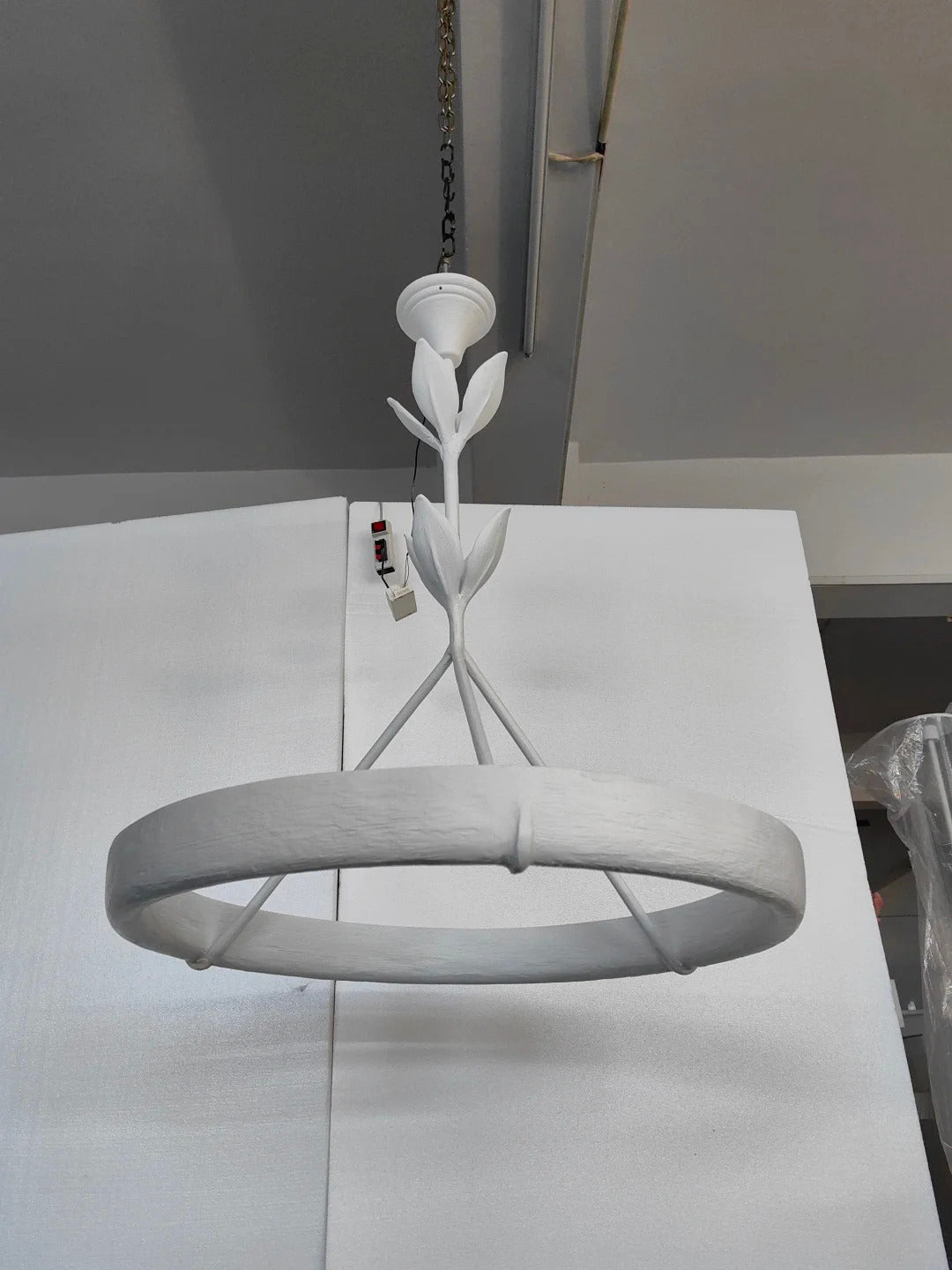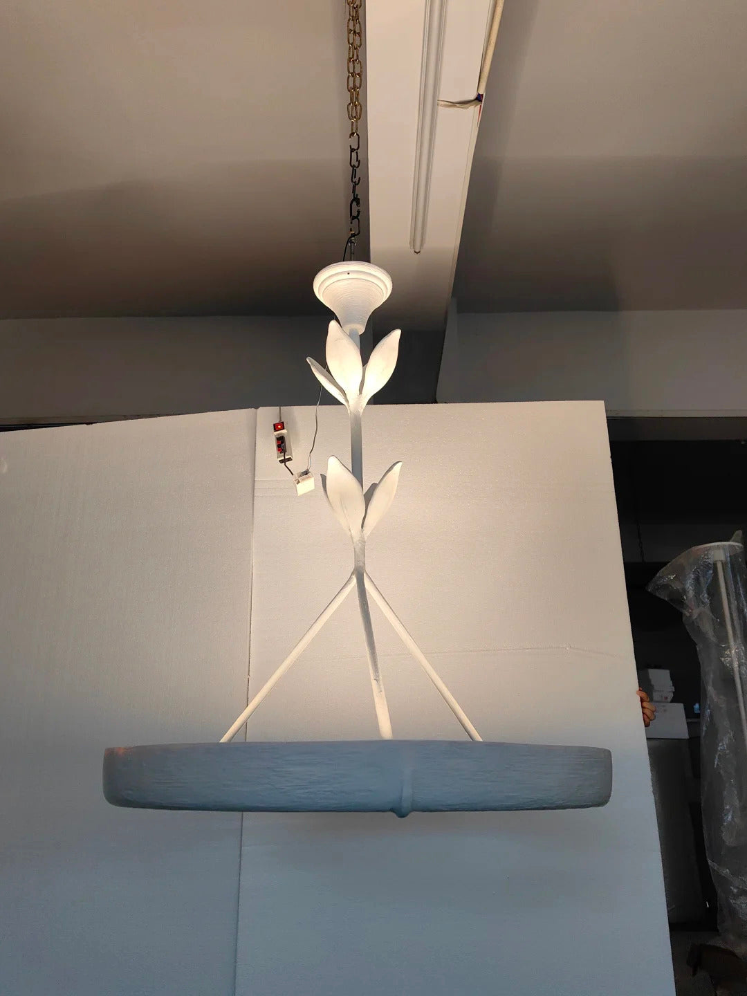 - Crafted from natural plaster, the Flora Ottilia Chandelier boasts a beautifully rough, organic texture that enhances its artisanal charm. The material's low light transmittance creates a soft, diffused glow, while the integrated LED strip on the back casts a gentle upward reflection on the ceiling, adding ambient warmth to any space.
