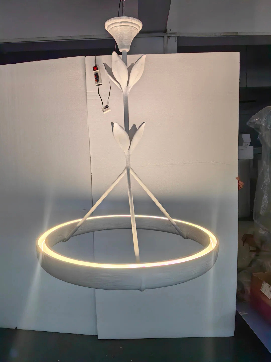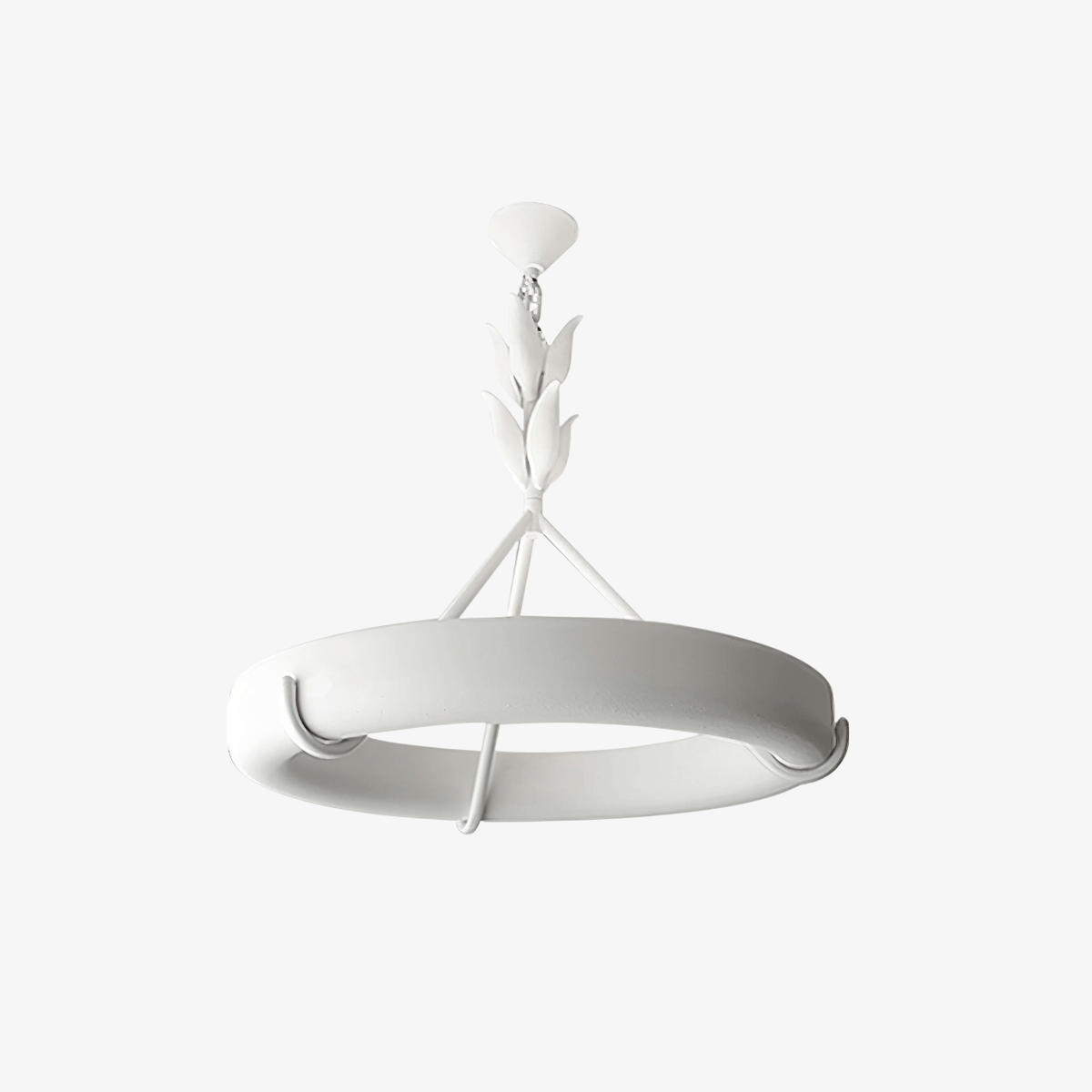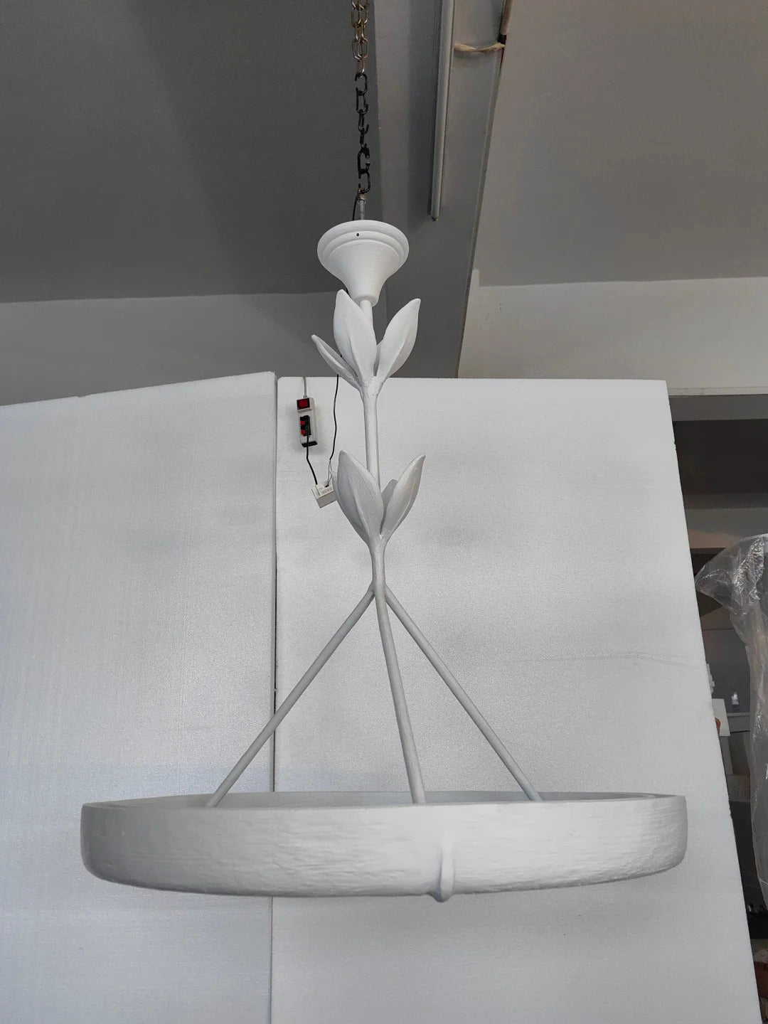 - Crafted from natural plaster, the Flora Ottilia Chandelier boasts a beautifully rough, organic texture that enhances its artisanal charm. The material's low light transmittance creates a soft, diffused glow, while the integrated LED strip on the back casts a gentle upward reflection on the ceiling, adding ambient warmth to any space.