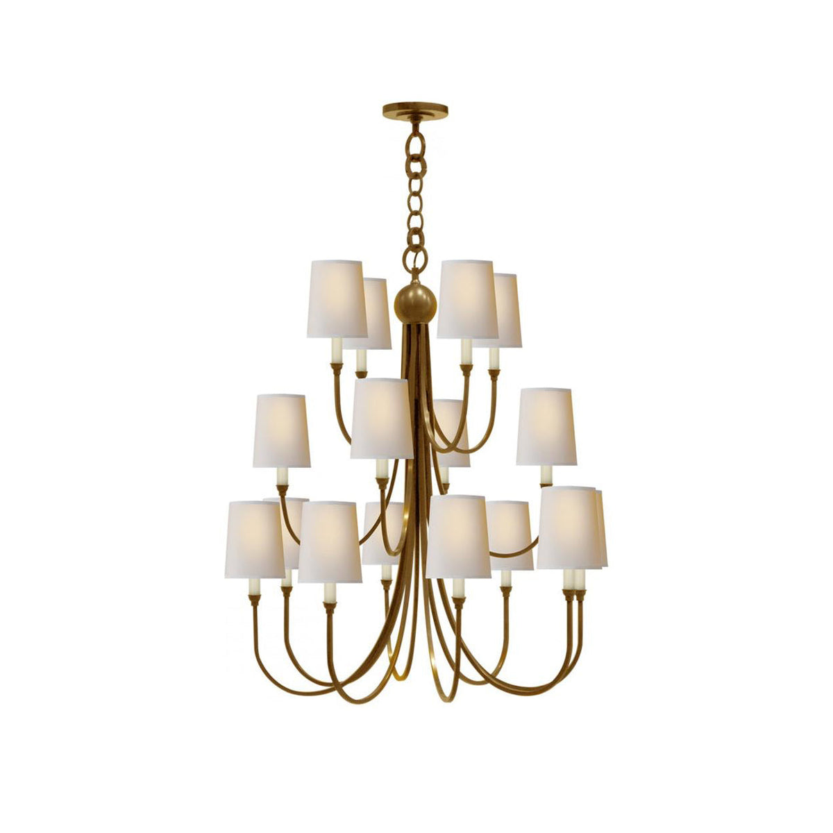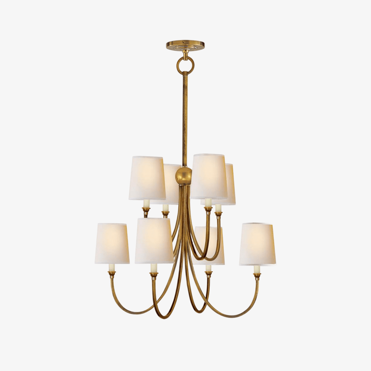 - The Harderman Chandelier is a sophisticated lighting fixture that effortlessly blends form and function. Crafted with a sleek metal frame featuring gracefully curved arms, this chandelier offers a minimalist aesthetic with a touch of personality. A distinctive decorative emblem adorns the frame, adding a touch of luxury near the soft, diffused glow of the linen shades.