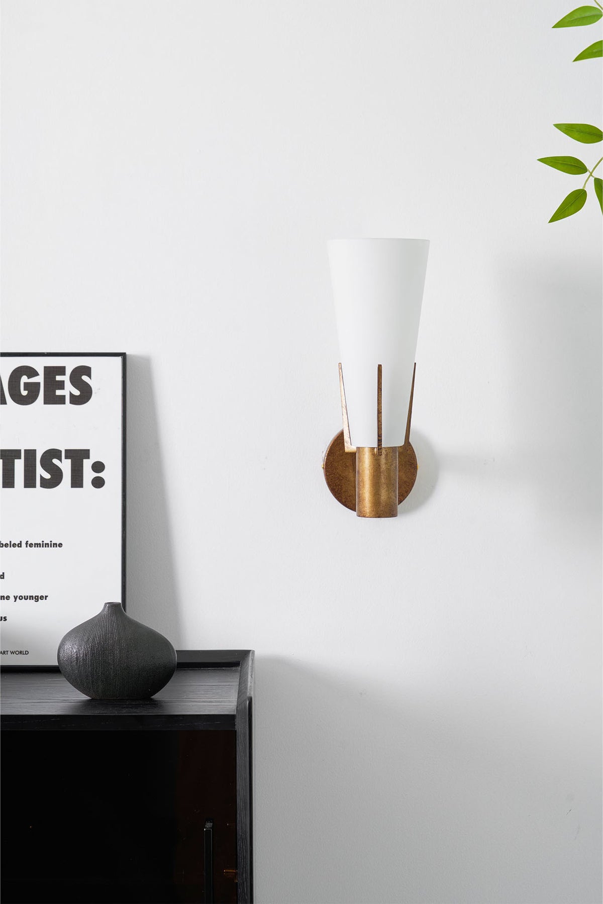 - Enhance your space with the Isidra Wall Sconce, a perfect blend of timeless design and contemporary appeal. Crafted with a solid brass body, this sconce features a vintage, aged texture that adds durability and a touch of classic sophistication. The warm metallic sheen creates a unique, eye-catching allure, making it a standout piece in any room.
