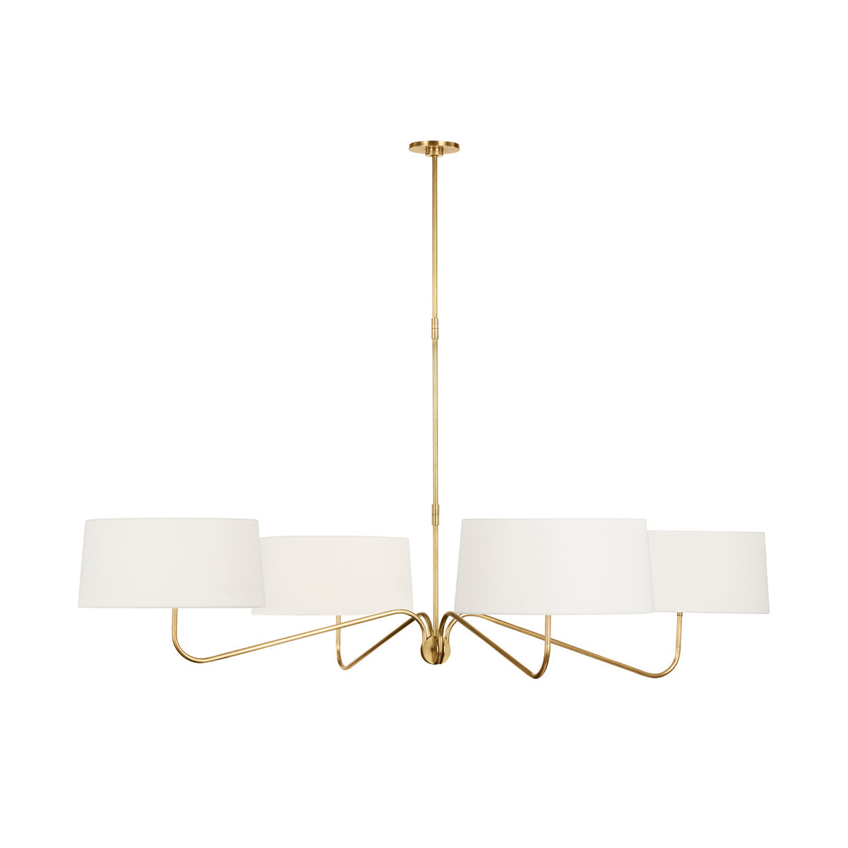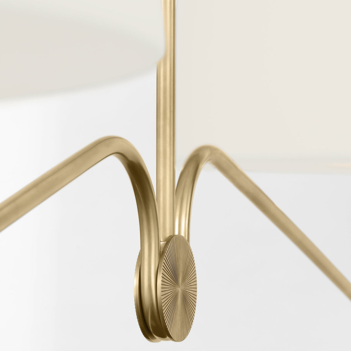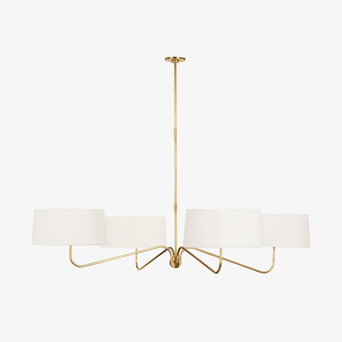 - The Loyce Chandelier features a minimalist design that prioritizes clean lines and a streamlined aesthetic. The all-brass lampbody adds a touch of warmth and luxury, while the gracefully curved arms and white linen shades create a balanced and inviting atmosphere.