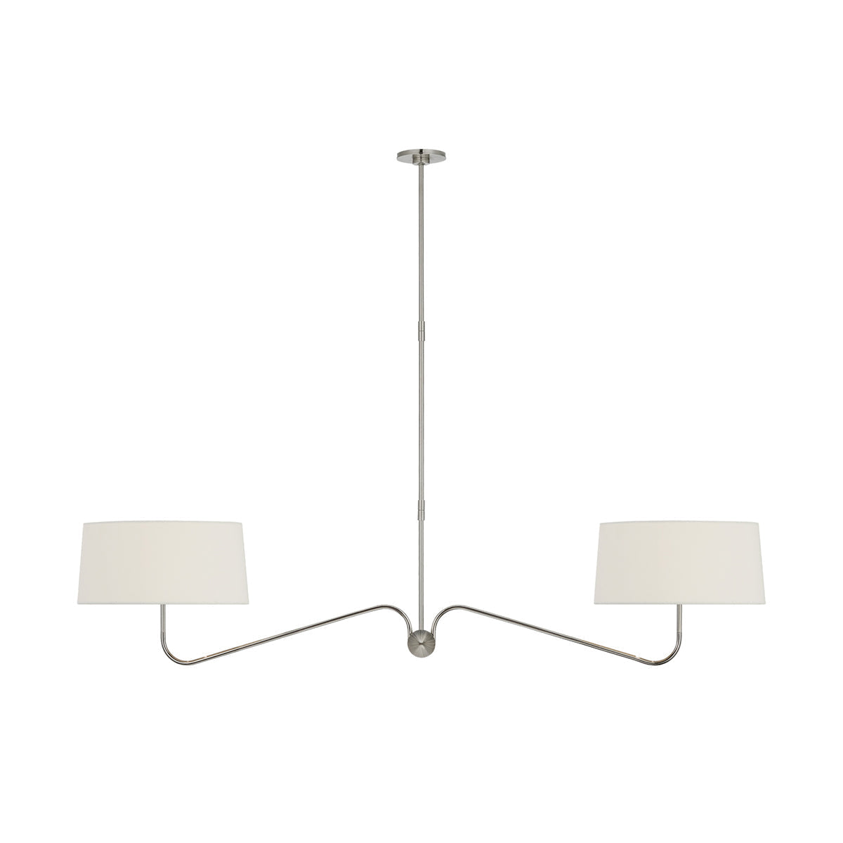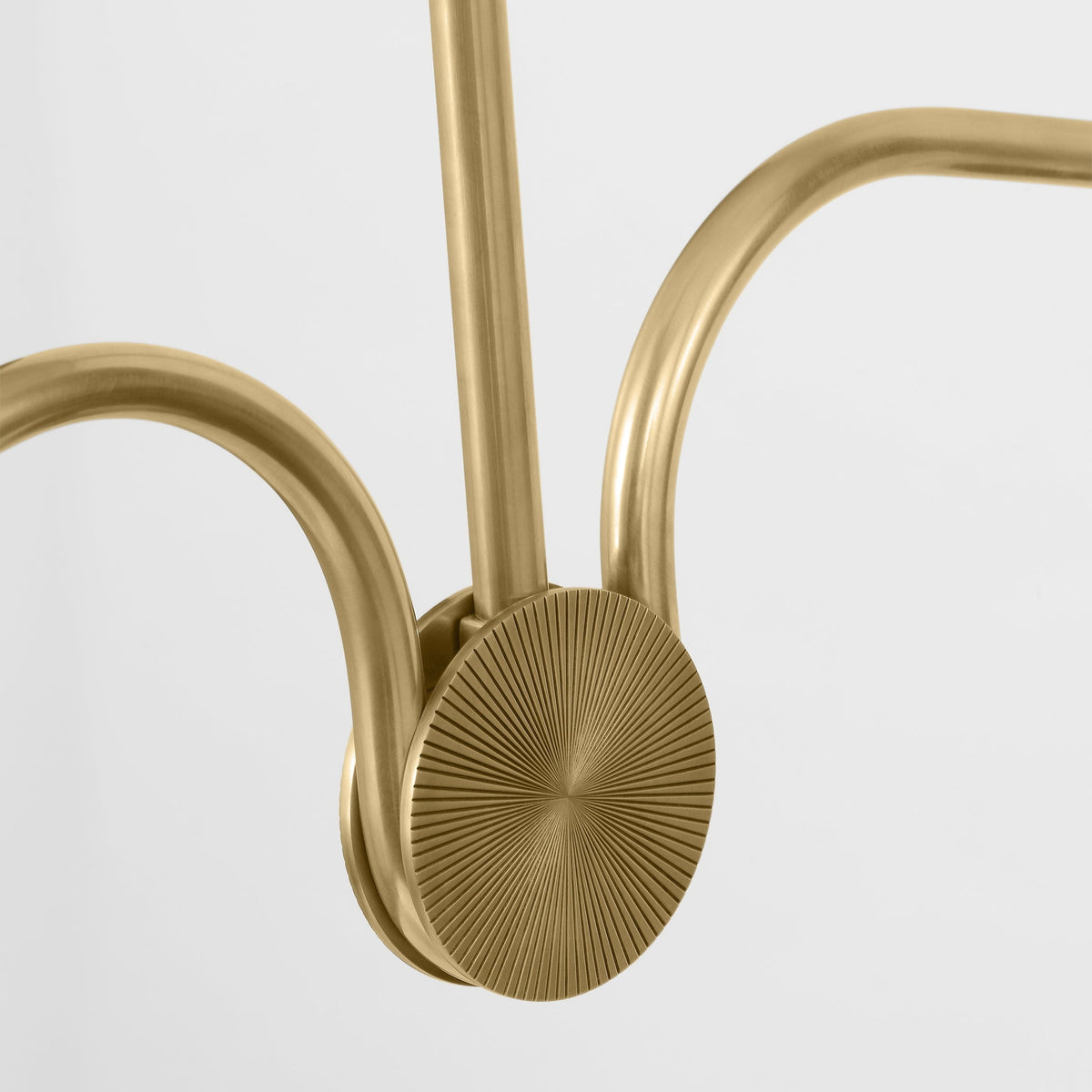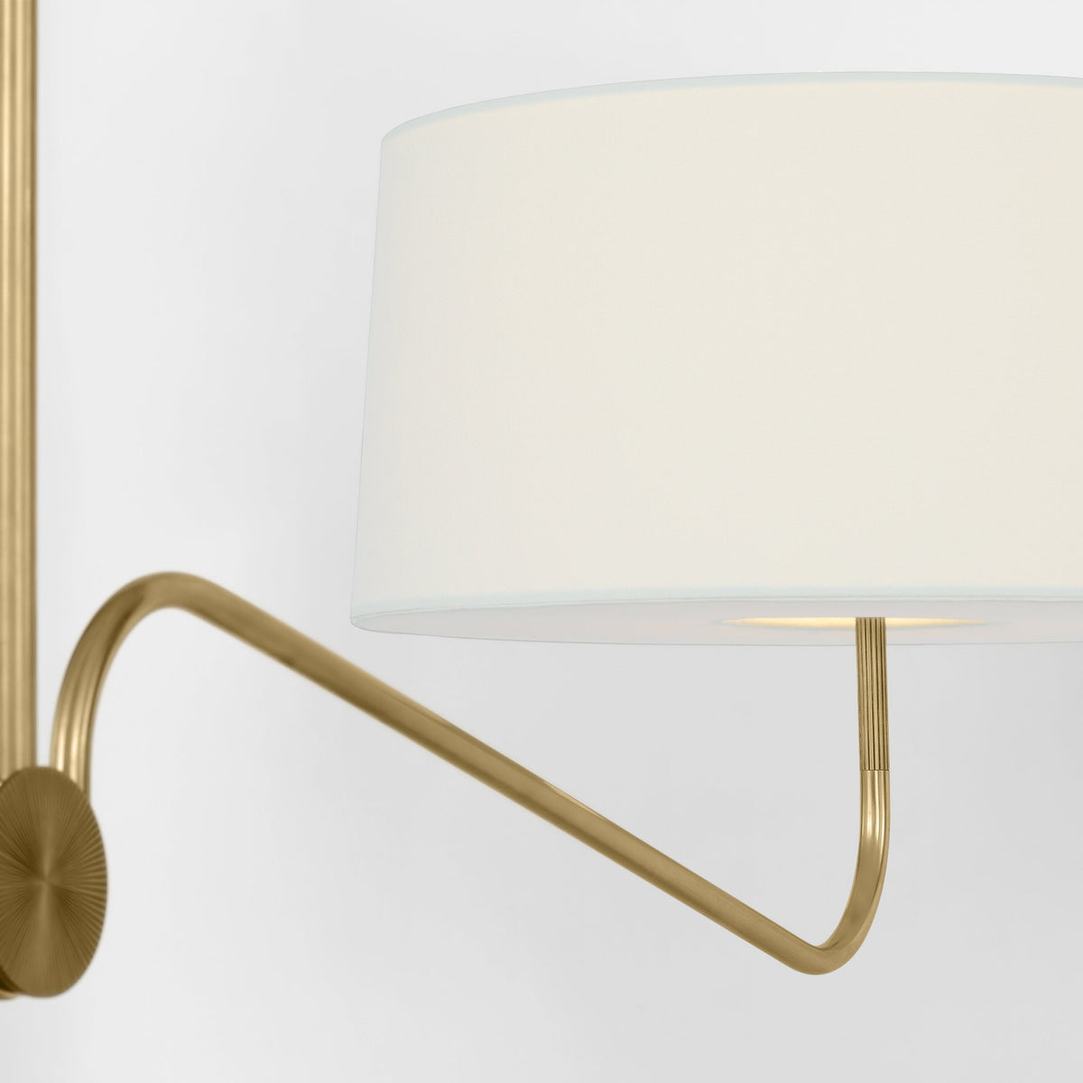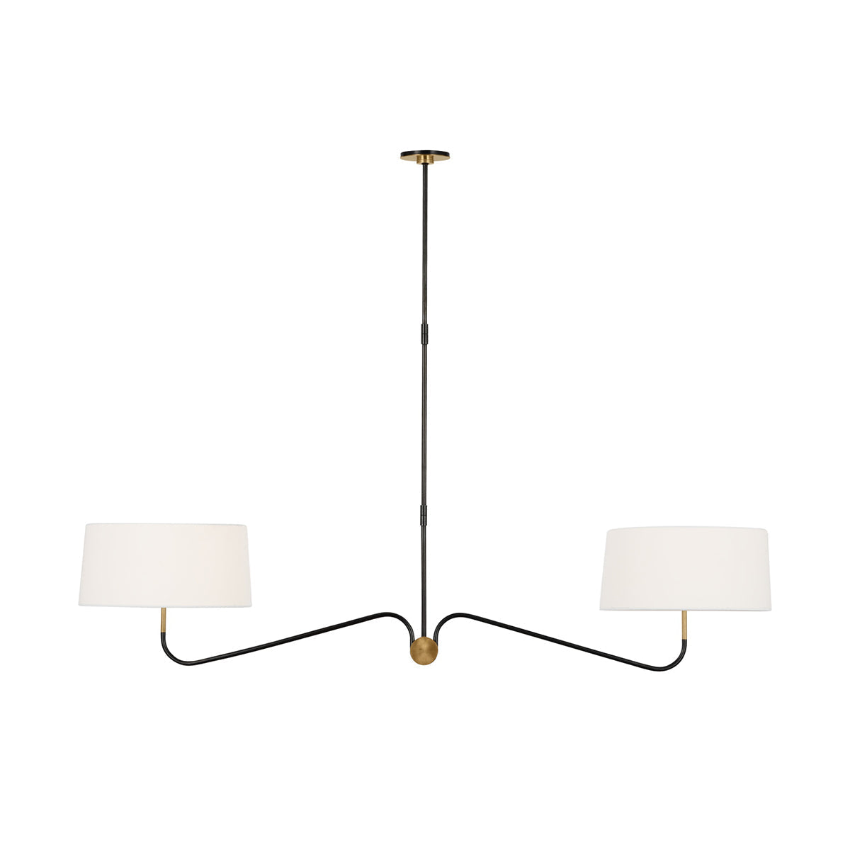 - The Loyce Chandelier features a minimalist design that prioritizes clean lines and a streamlined aesthetic. The all-brass lampbody adds a touch of warmth and luxury, while the gracefully curved arms and white linen shades create a balanced and inviting atmosphere.