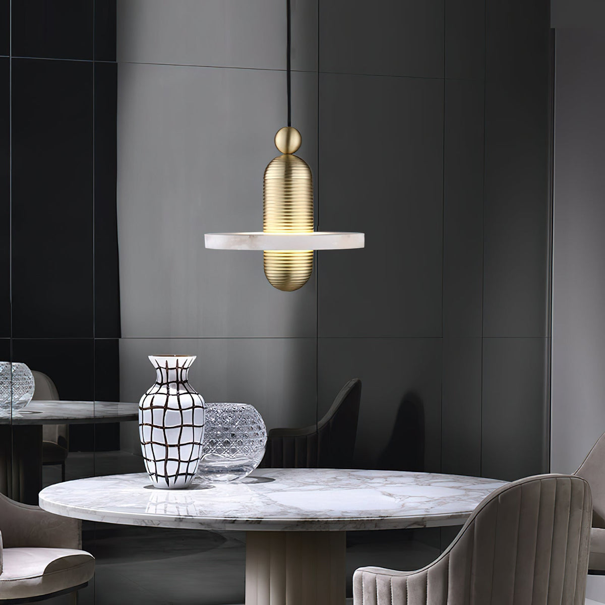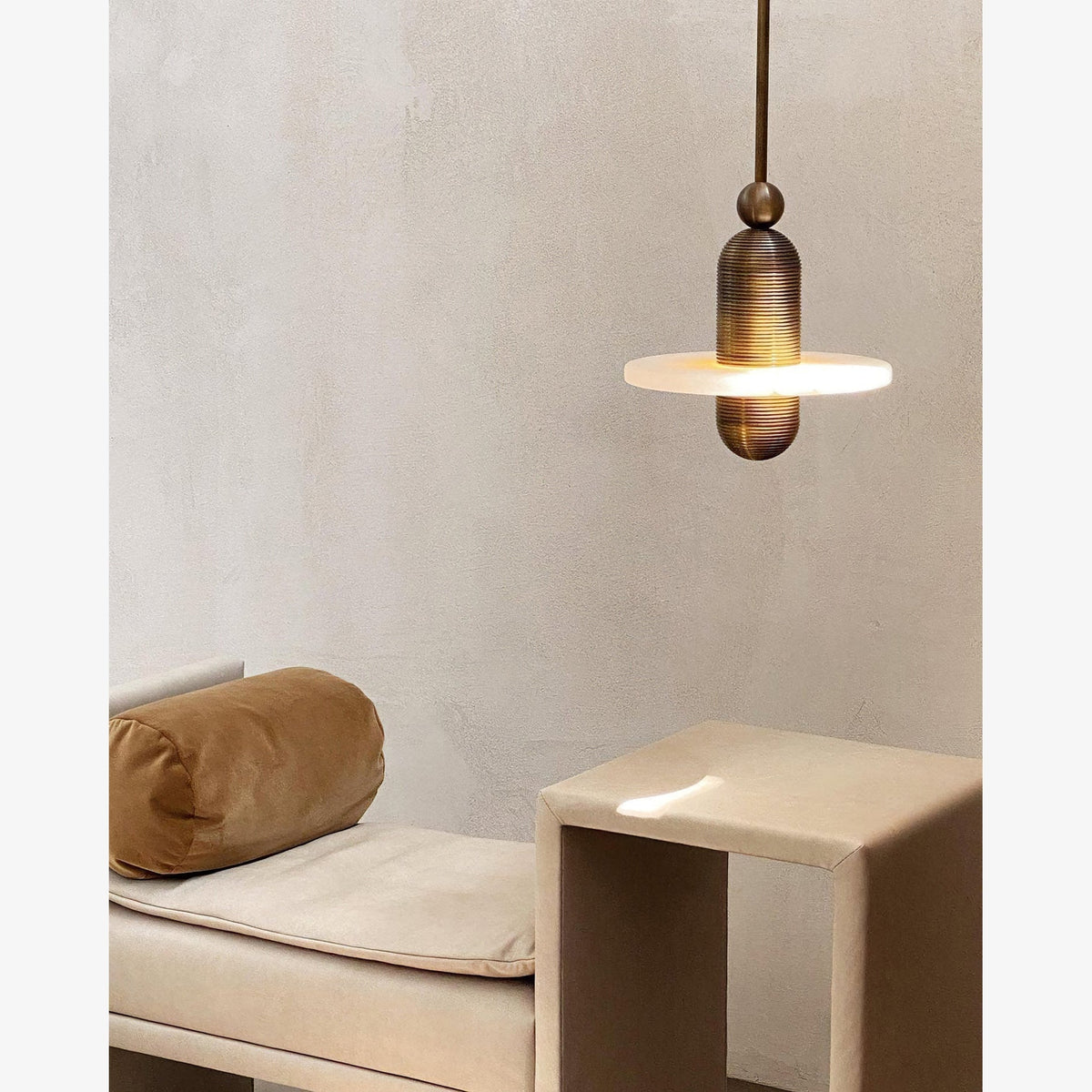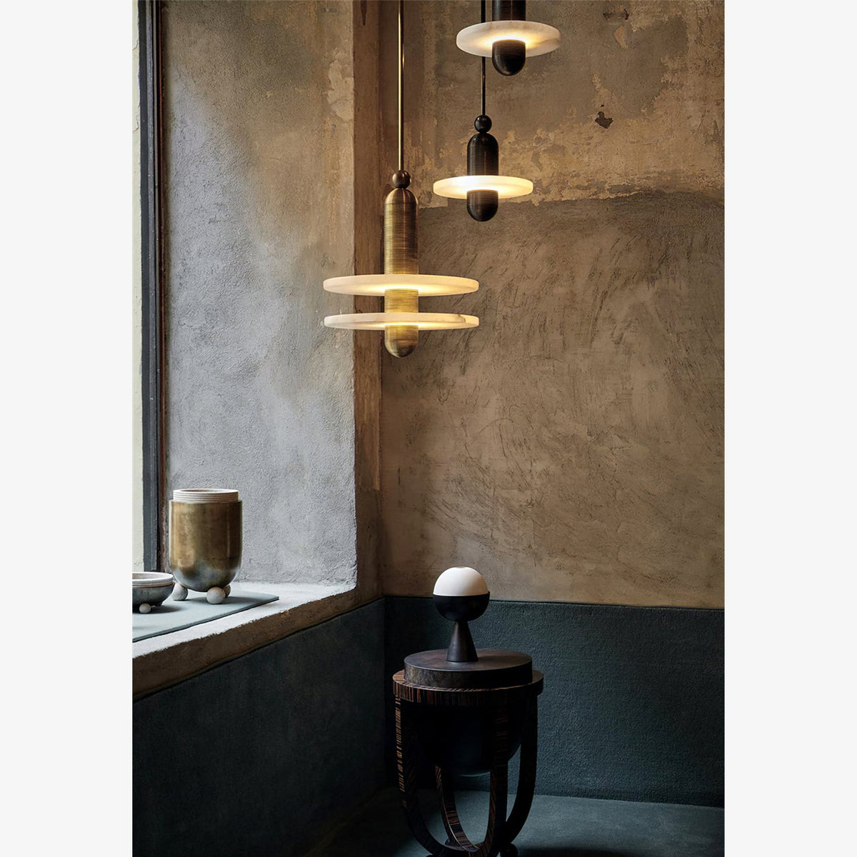 - The Median 1 Pendant Lamp is a captivating blend of ancient artistry and futuristic design. Inspired by traditional Middle Eastern jewelry, this unique piece features translucent alabaster planes dramatically intersected by a fluted brass form. A hidden light source gently illuminates the stone, casting a warm glow that subtly reveals the interplay between solid and permeable. This mesmerizing lamp is a statement piece that will add a touch of ethereal elegance to any modern interior.