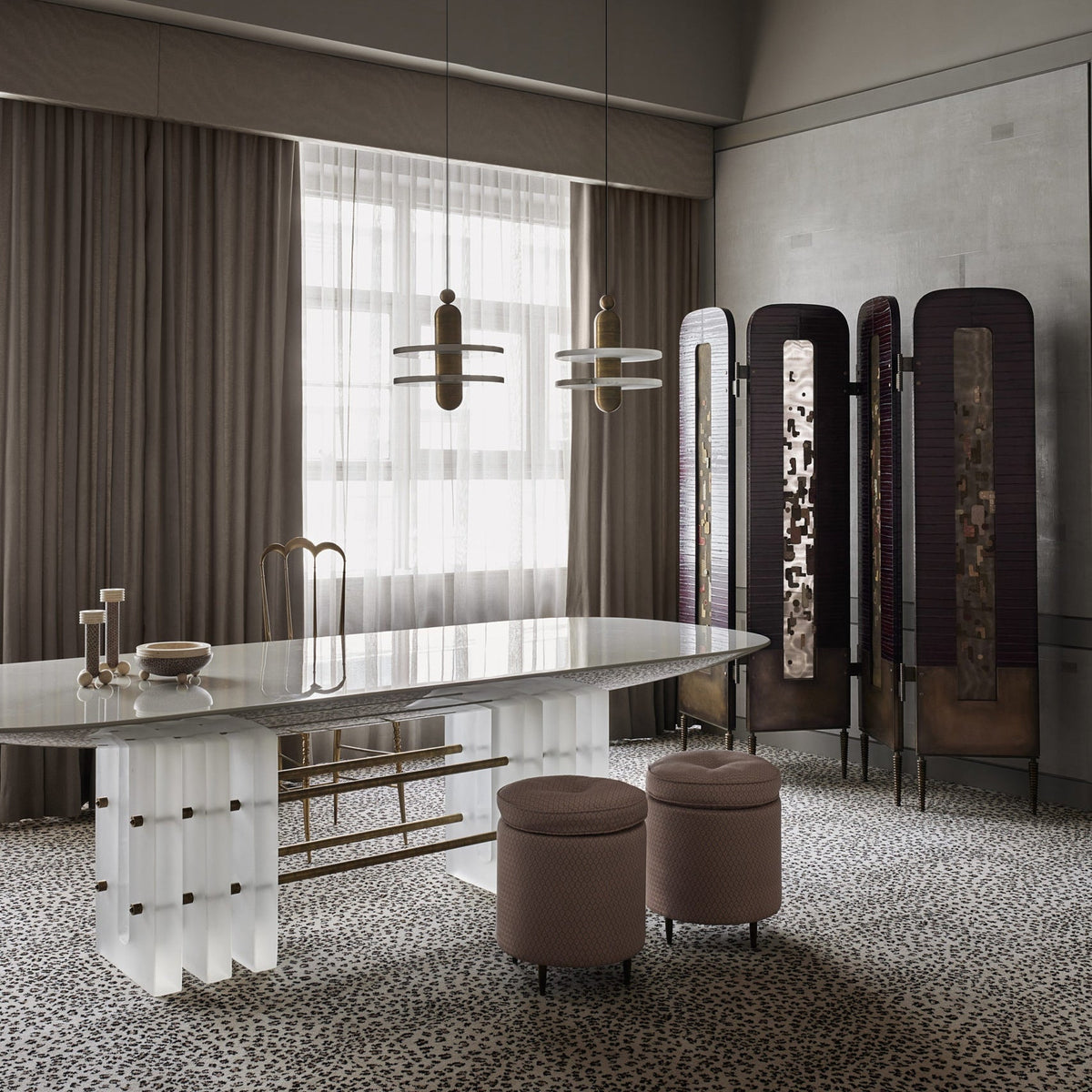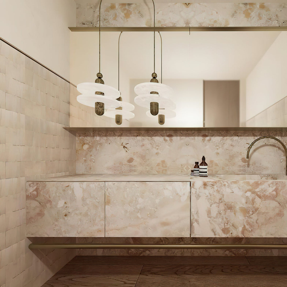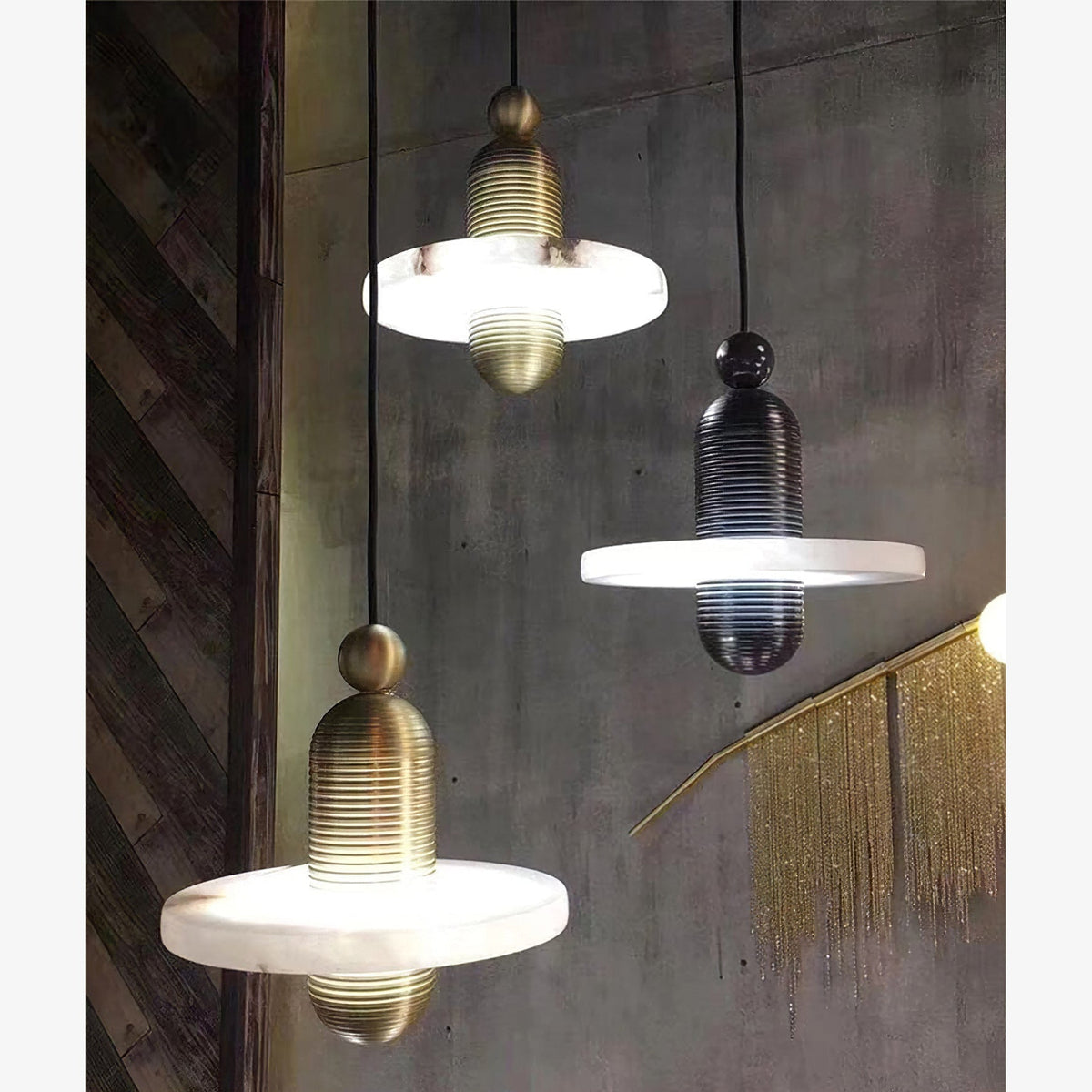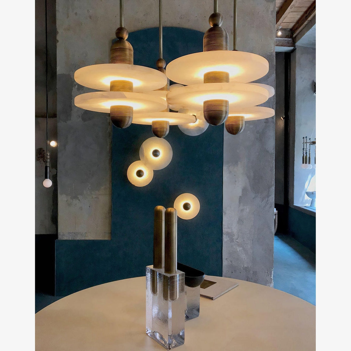 - The Median 1 Pendant Lamp is a captivating blend of ancient artistry and futuristic design. Inspired by traditional Middle Eastern jewelry, this unique piece features translucent alabaster planes dramatically intersected by a fluted brass form. A hidden light source gently illuminates the stone, casting a warm glow that subtly reveals the interplay between solid and permeable. This mesmerizing lamp is a statement piece that will add a touch of ethereal elegance to any modern interior.