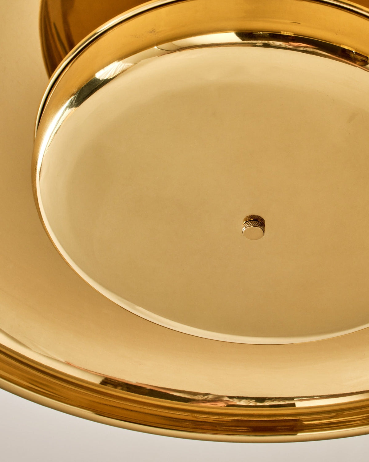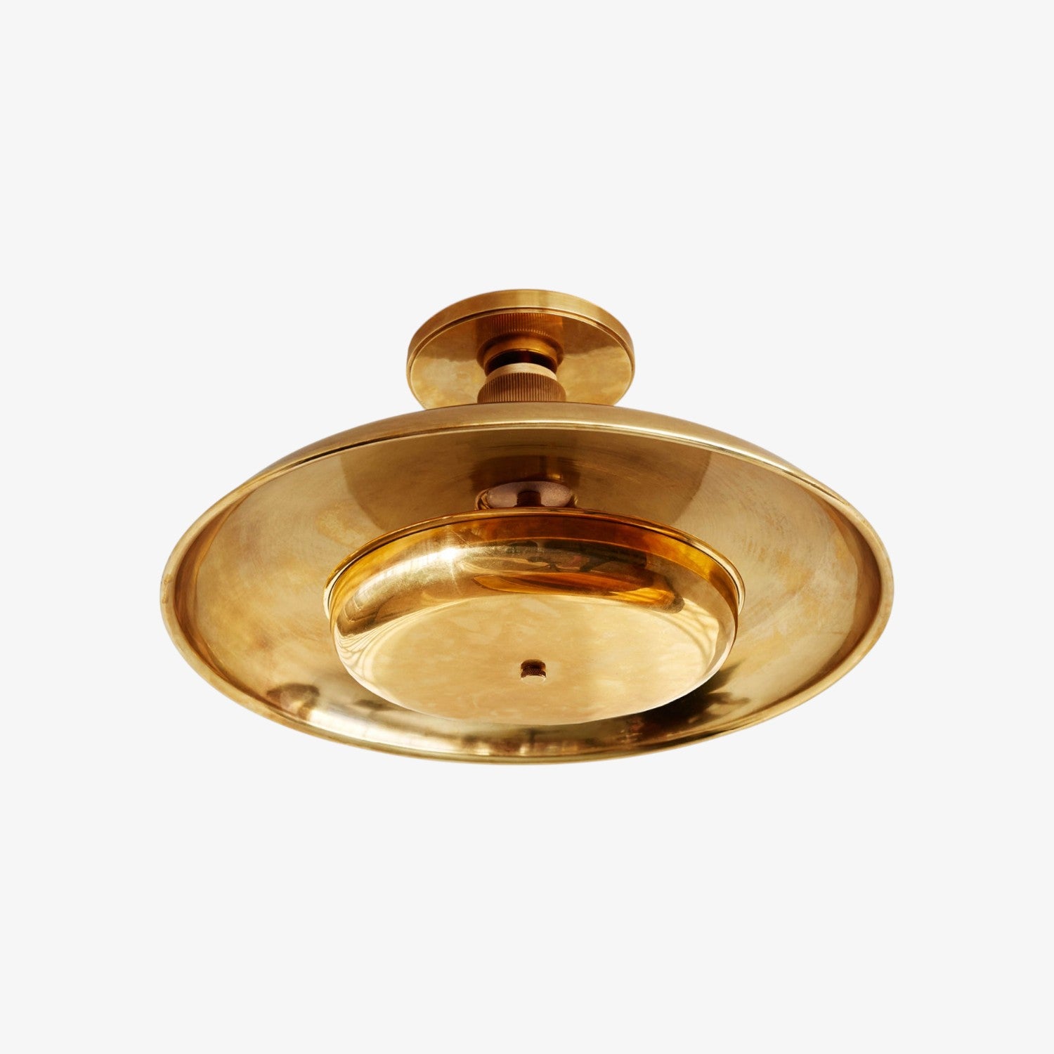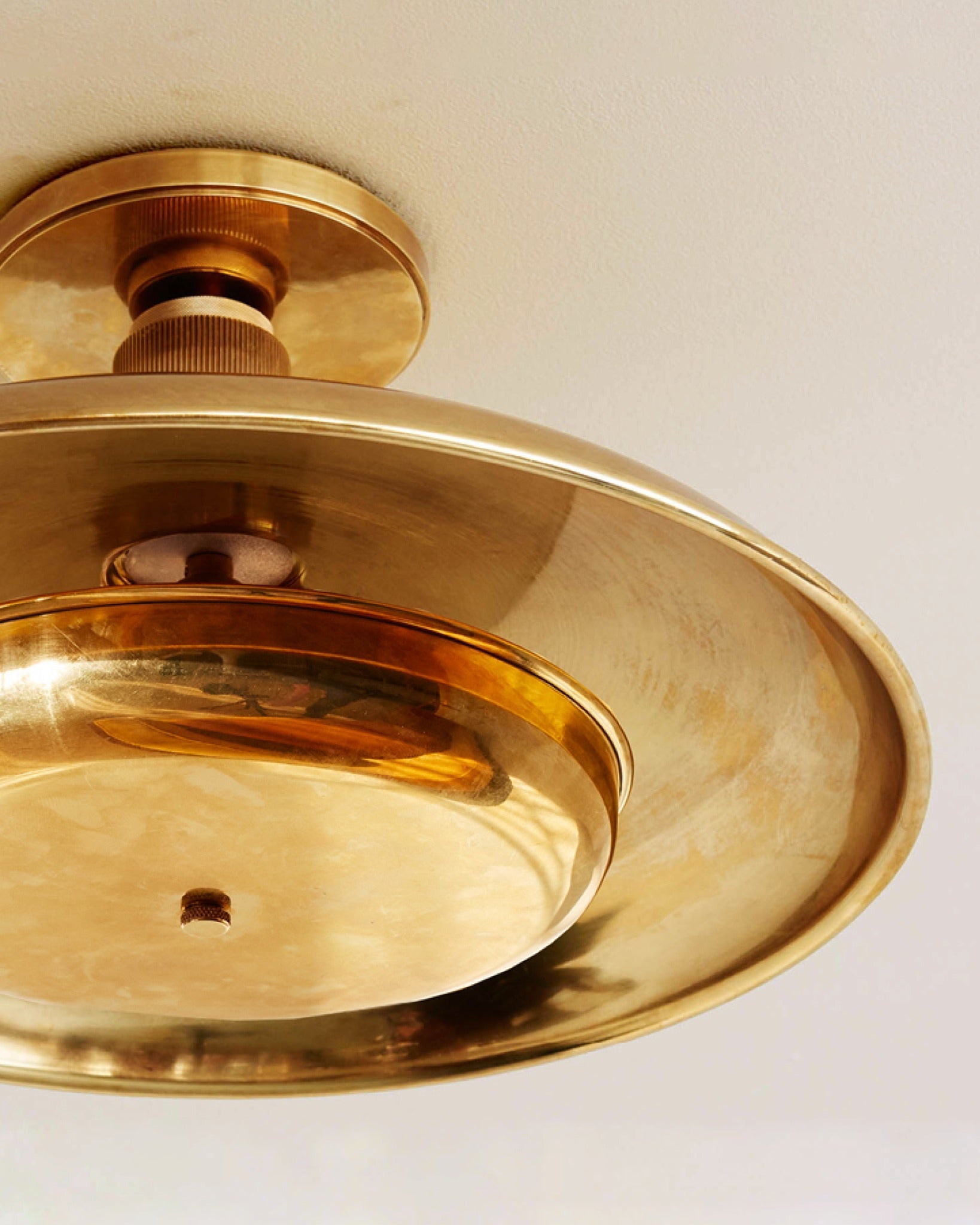 - Each Oscar Flush Mount Lamp is meticulously created, featuring a hand-spun metal shade and a hand-cast canopy made from a special brass alloy with an elevated copper content. This unique composition gives the Oscar Flush Mount Lamp a naturally warm, rich tone that adds instant depth and character to any room.