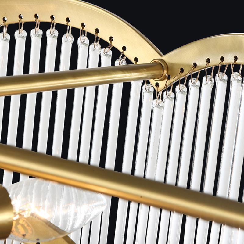 - Elevate your space with the exquisite Parish Crystal Chandelier. This stunning lighting fixture features long, cascading strips of crystals that gracefully sway, creating a mesmerizing play of light and shadow. The wavy bottom edge of the crystal strands adds a touch of organic elegance, while the top seamlessly integrates with the lamp body for a cohesive and luxurious look.