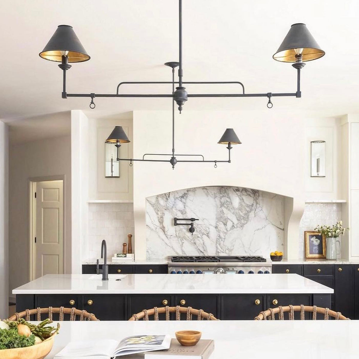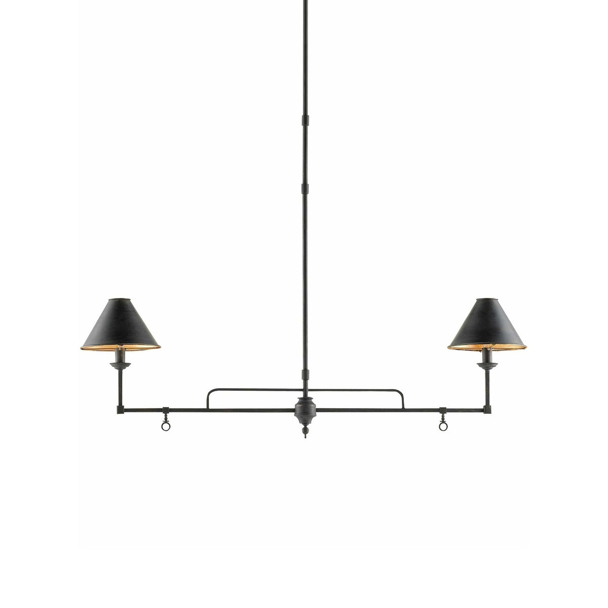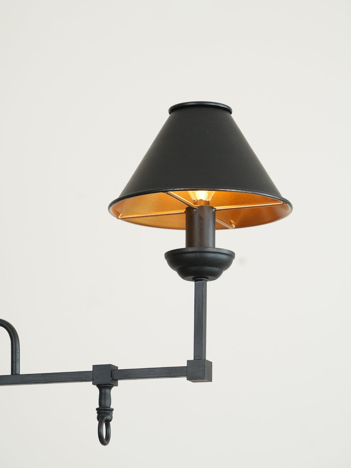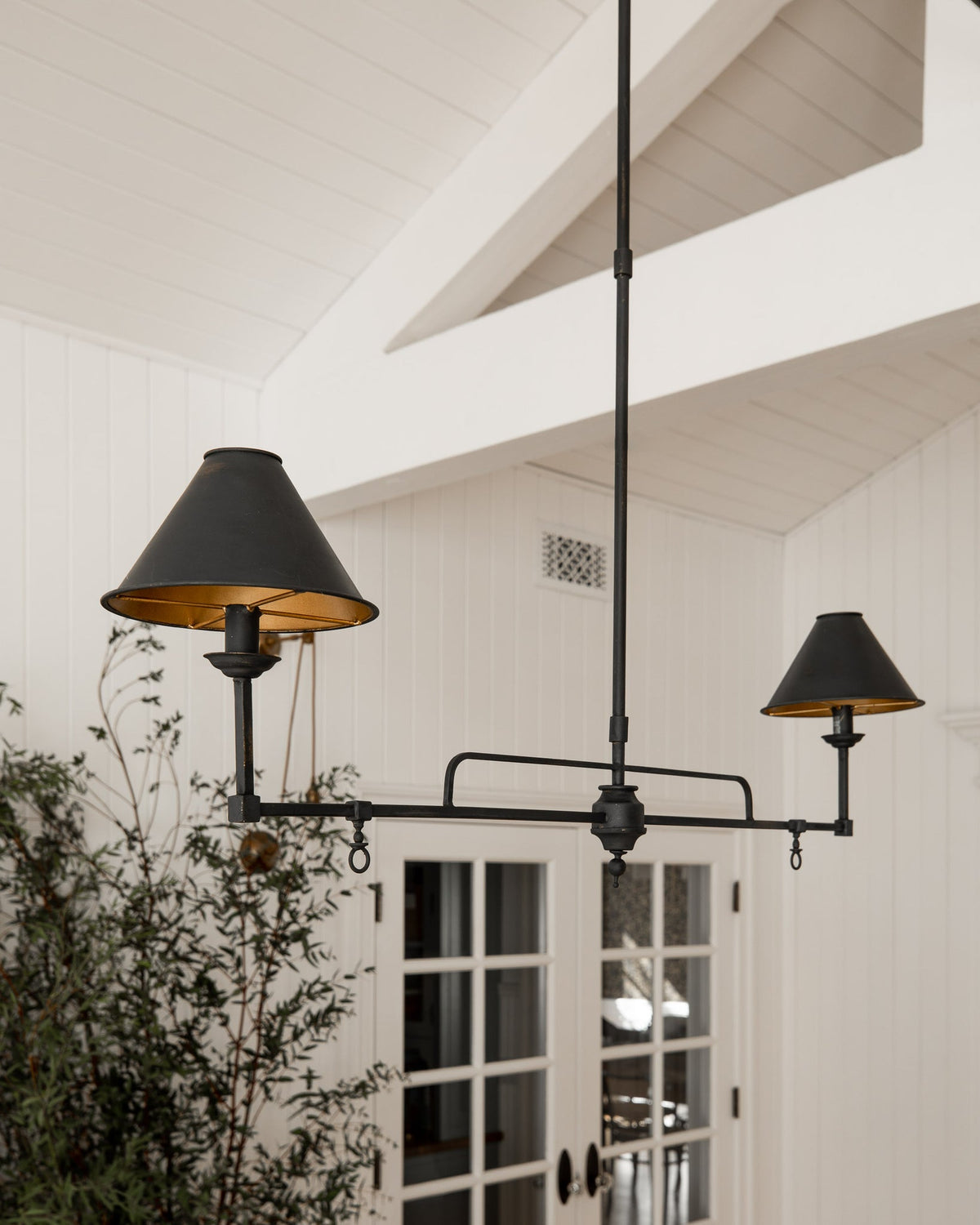- The Rhone Chandelier is a modern interpretation of the classic gas light, featuring a block-accented frame in a sophisticated French black finish. The contemporary gold leaf finish on the interiors of the two shades adds a touch of opulence to the illumination. This unique blend of traditional and contemporary elements creates a captivating and eye-catching piece that is sure to elevate any space.