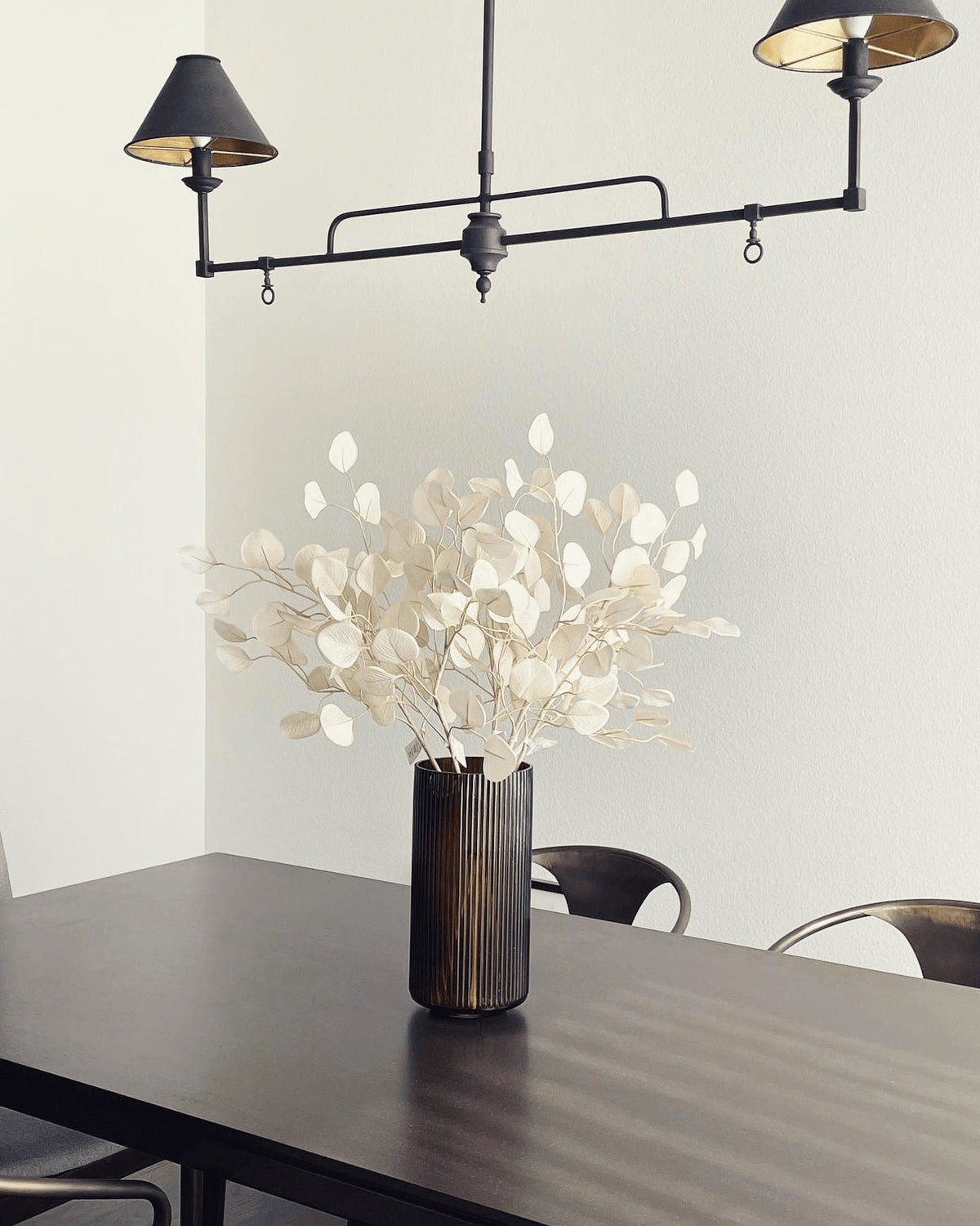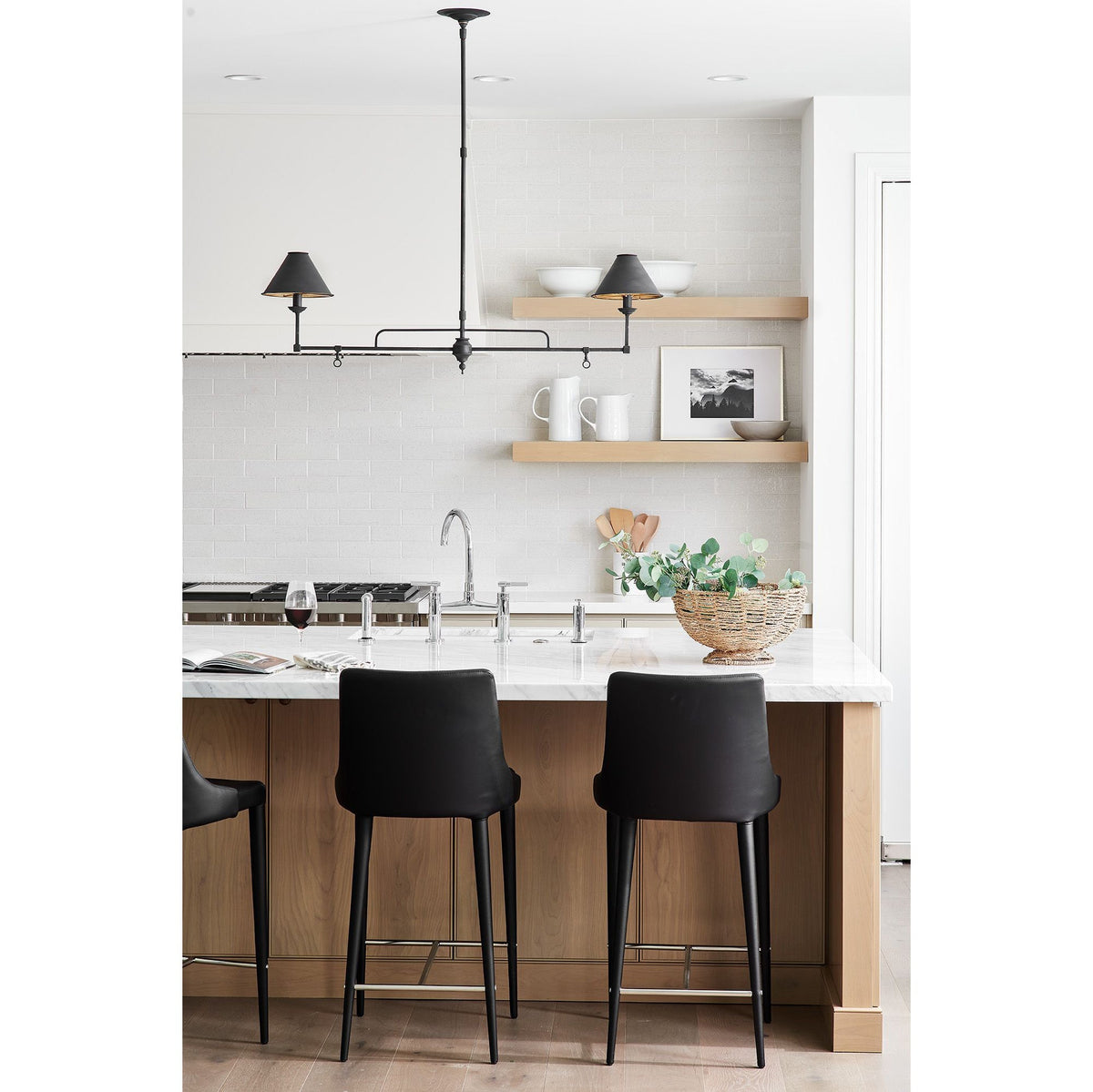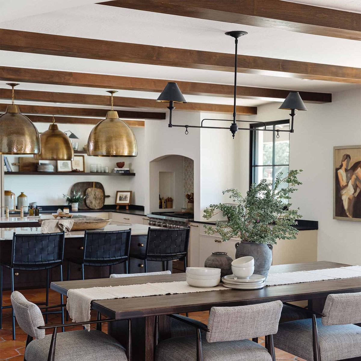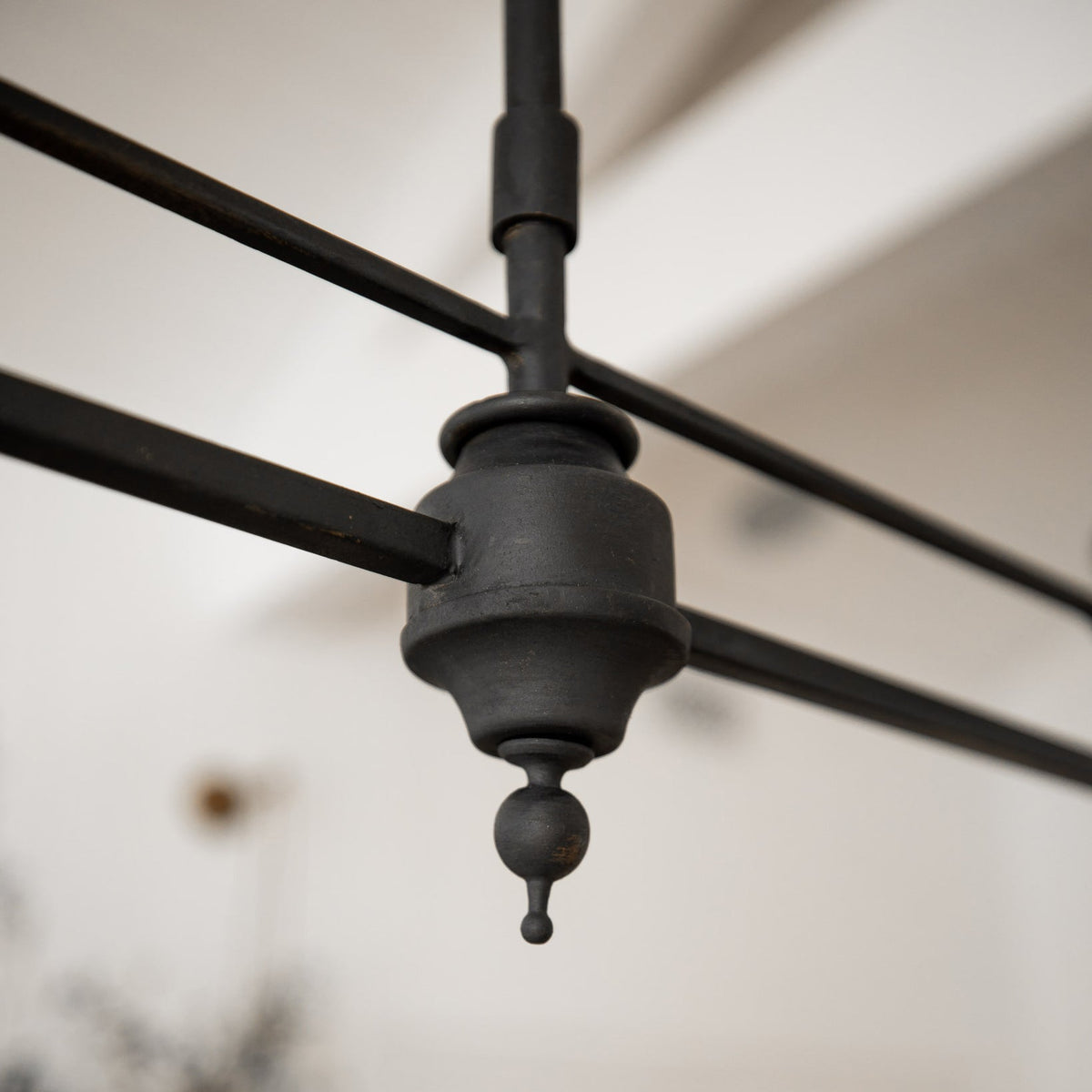 - The Rhone Chandelier is a modern interpretation of the classic gas light, featuring a block-accented frame in a sophisticated French black finish. The contemporary gold leaf finish on the interiors of the two shades adds a touch of opulence to the illumination. This unique blend of traditional and contemporary elements creates a captivating and eye-catching piece that is sure to elevate any space.