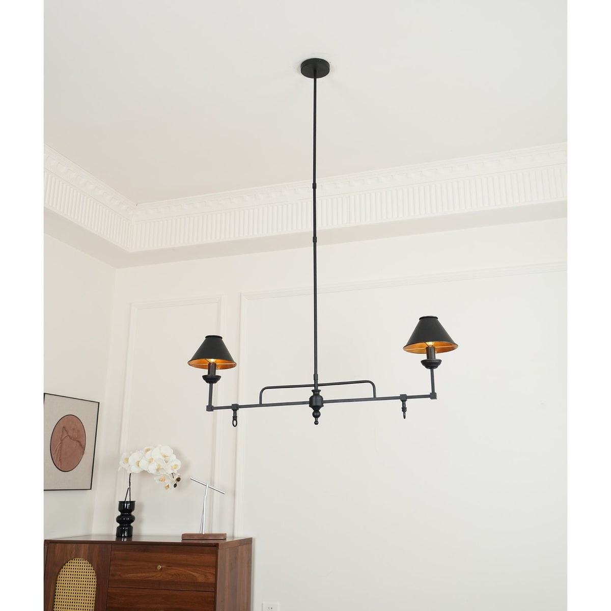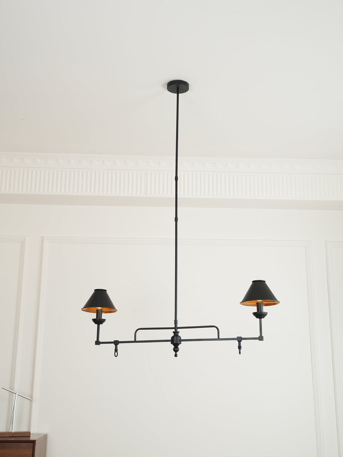Specifications1. Fixture Type: Chandeliers2. Style: Vintage 3. Body Finishes: Black 4. Shade Finishes: Black & Gold 5. Main Material: Aluminum (Shade) | Brass (Body) 6. Scenes to be Used: Indoor Only (IP20) 7. Light Source Base: E12 | E14 8. Bulb Included: Yes 9. Number of Bulbs Required: 2 10. Kelvin Range: 2700K 11. Dimmable: No 12. Remote Control: No 13. Voltage: AC 110V-240V 14. Warranty: Two Years 15. Assembly Required: Yes 16. Installation Required: Yes 17. Sloped Ceiling Compatible: Yes 18. Adjustable Length: Yes 19. Wiring: Hardwired 20. Length of Pole: 19.7 inches | 50 centimeters 21. Product Care: Wipe clean with damp cloth |