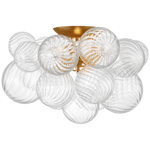 - Multiple hand-blown glass orbs, each with its own unique swirled texture, are nestled within gracefully formed iron baskets. When illuminated, light dances and sparkles through the glass, creating a mesmerizing play of light that adds a dynamic, sophisticated energy to any room.