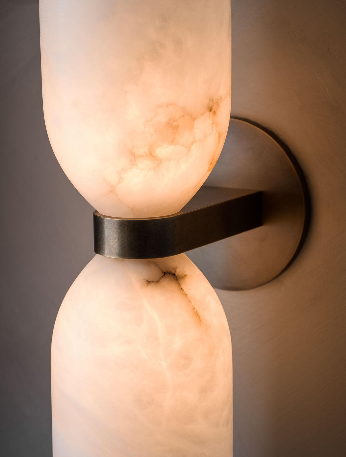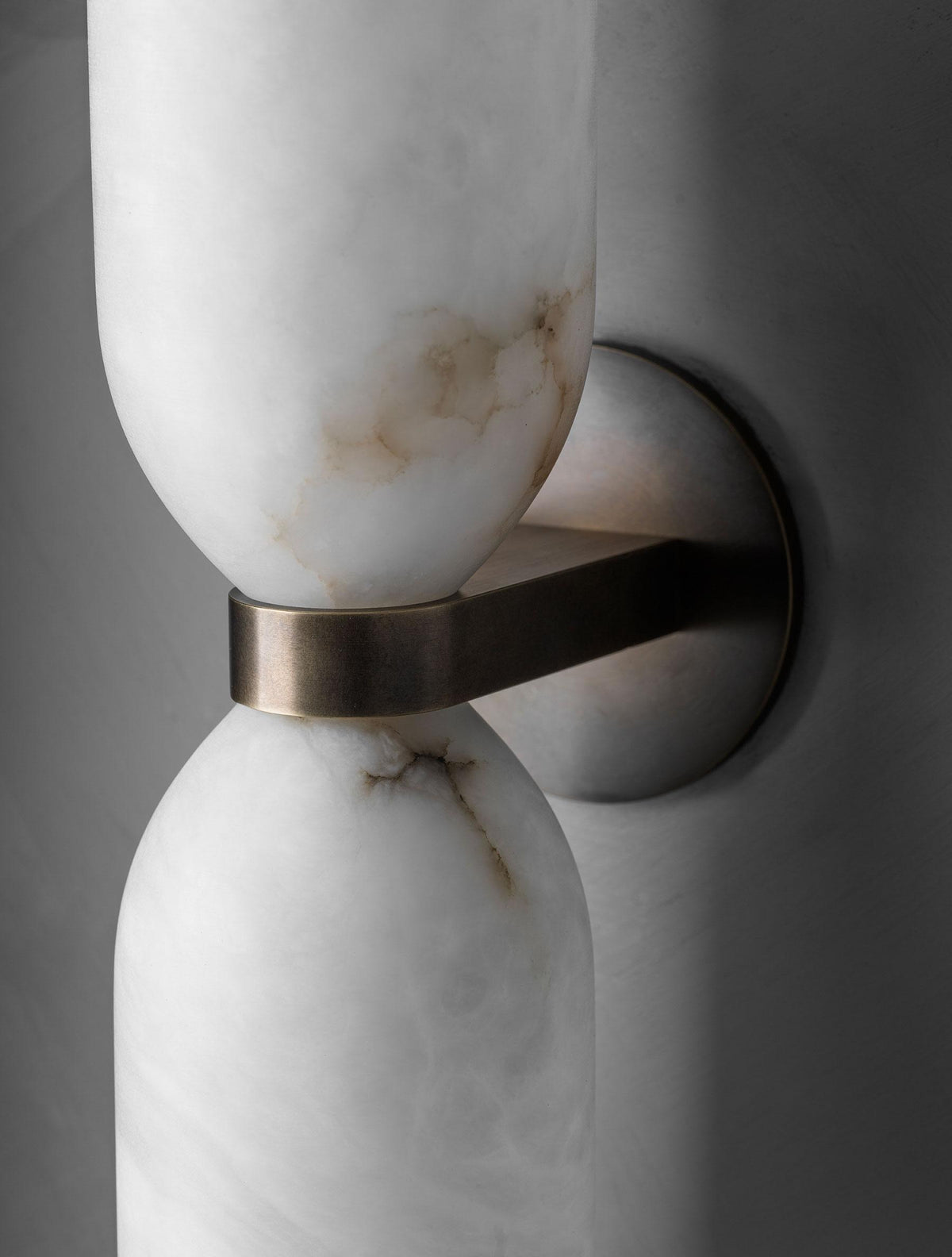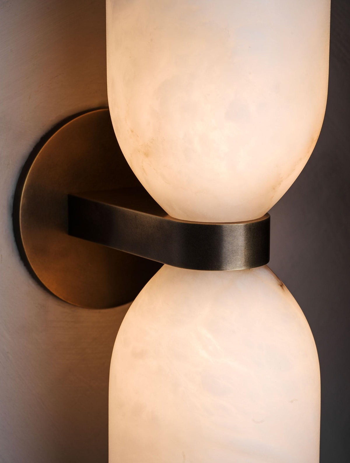 - The Tandem Sconce’s form is a study in intentional, harmonious design. The symmetrical double-column architecture provides a satisfying visual stability, while the clean, uncluttered lines ensure it feels modern and refined. The brass bracket isn’t merely a functional component; it is a design element that elegantly frames and showcases the alabaster stone, creating a beautiful dialogue between the crafted metal and the raw, natural material. This piece stands as a minimalist sculpture even when unlit.