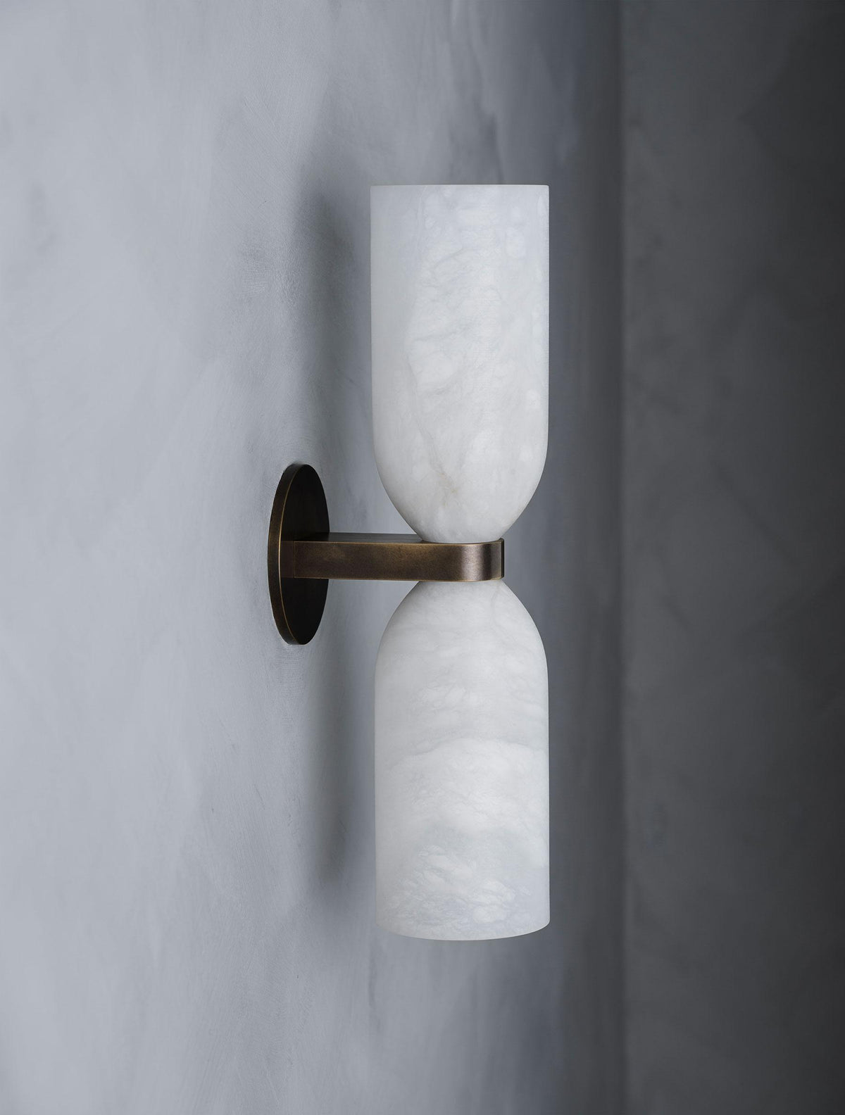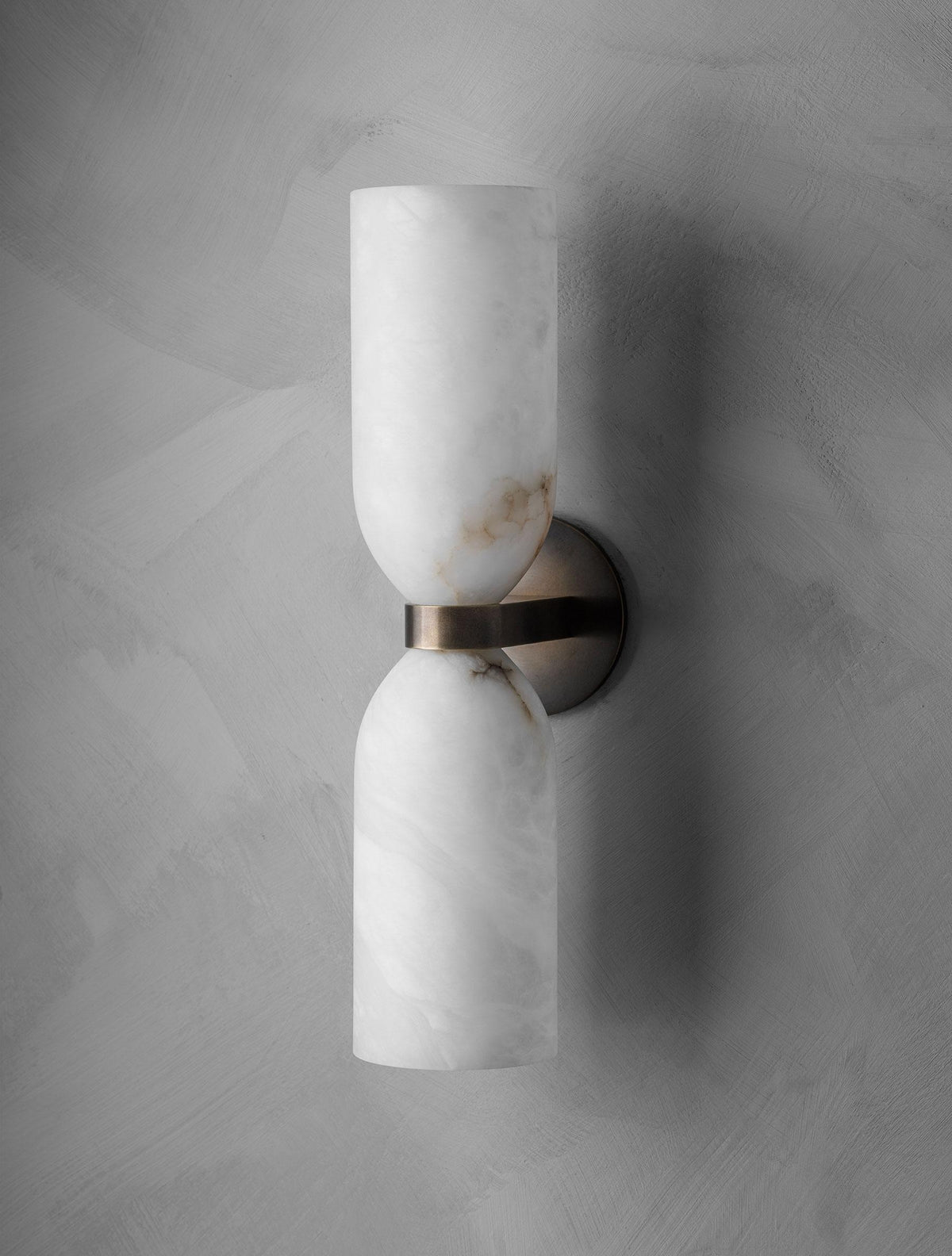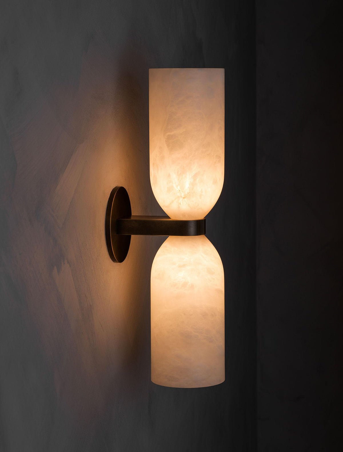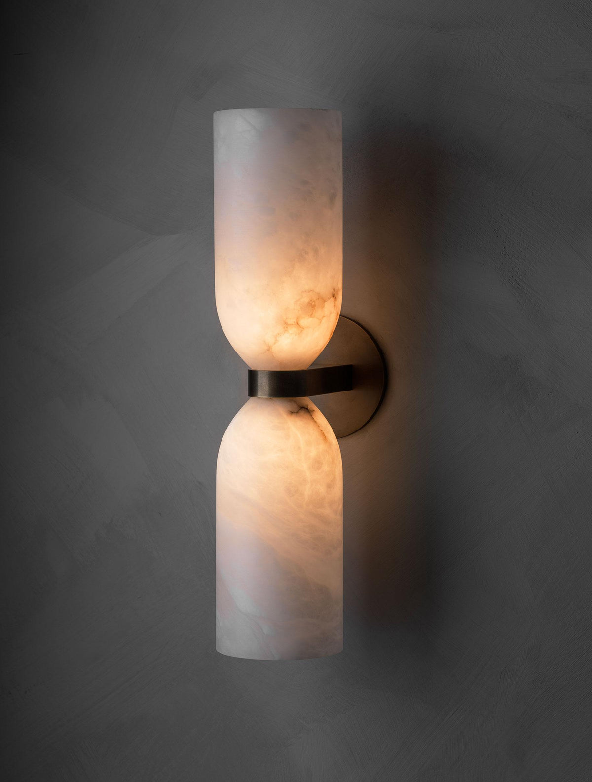 - The Tandem Sconce’s form is a study in intentional, harmonious design. The symmetrical double-column architecture provides a satisfying visual stability, while the clean, uncluttered lines ensure it feels modern and refined. The brass bracket isn’t merely a functional component; it is a design element that elegantly frames and showcases the alabaster stone, creating a beautiful dialogue between the crafted metal and the raw, natural material. This piece stands as a minimalist sculpture even when unlit.
