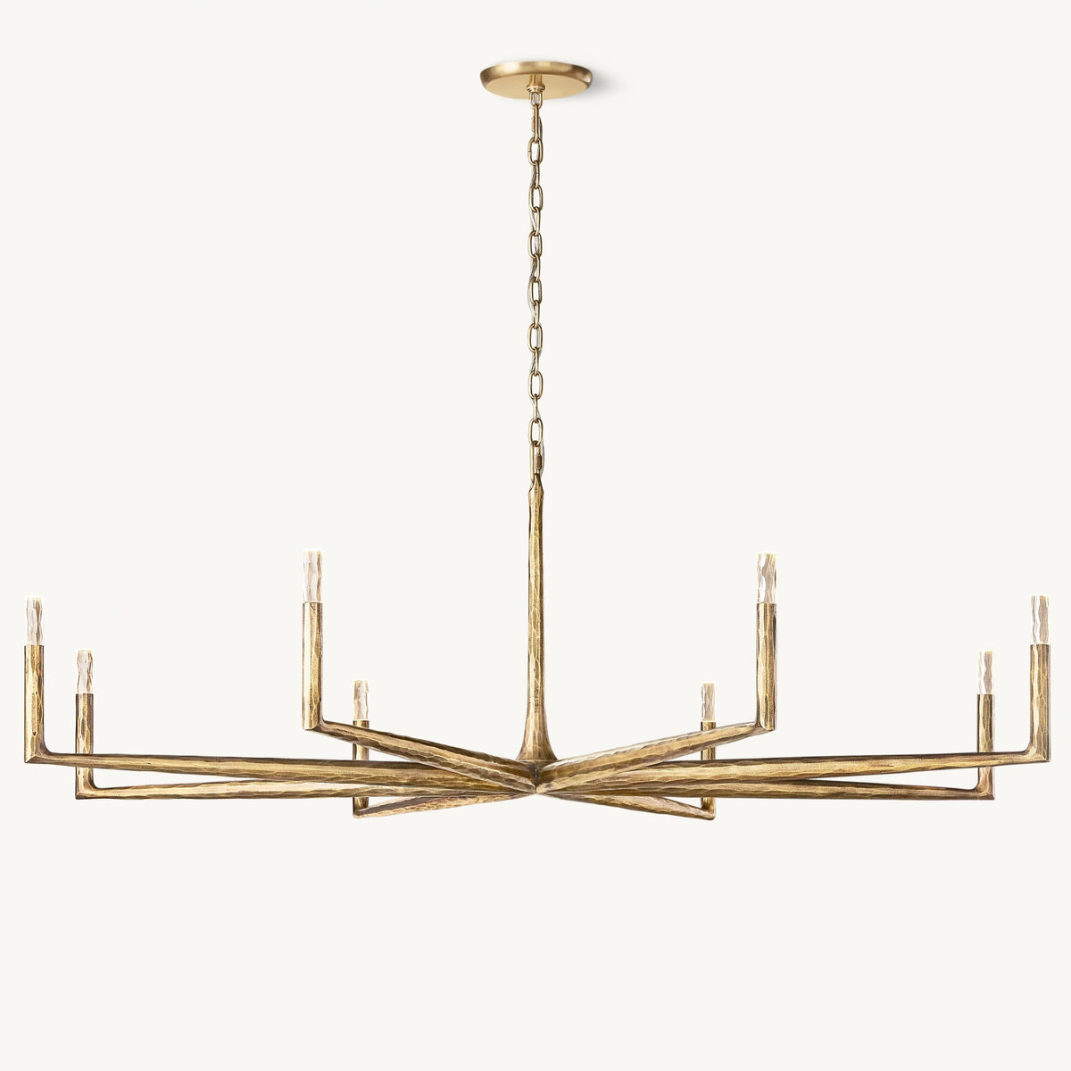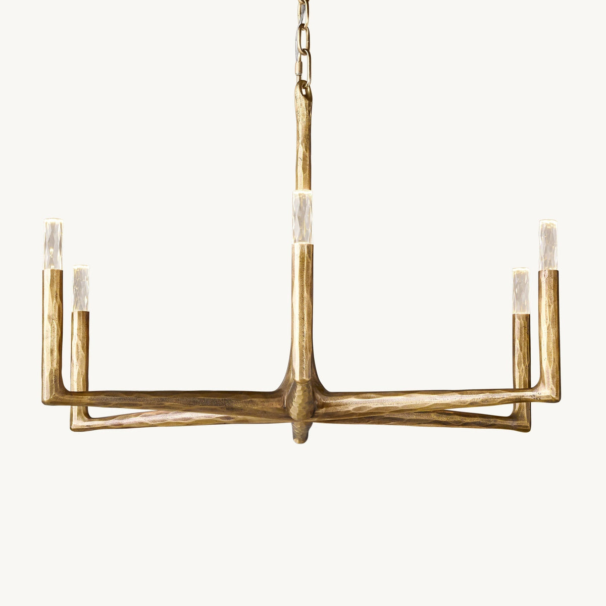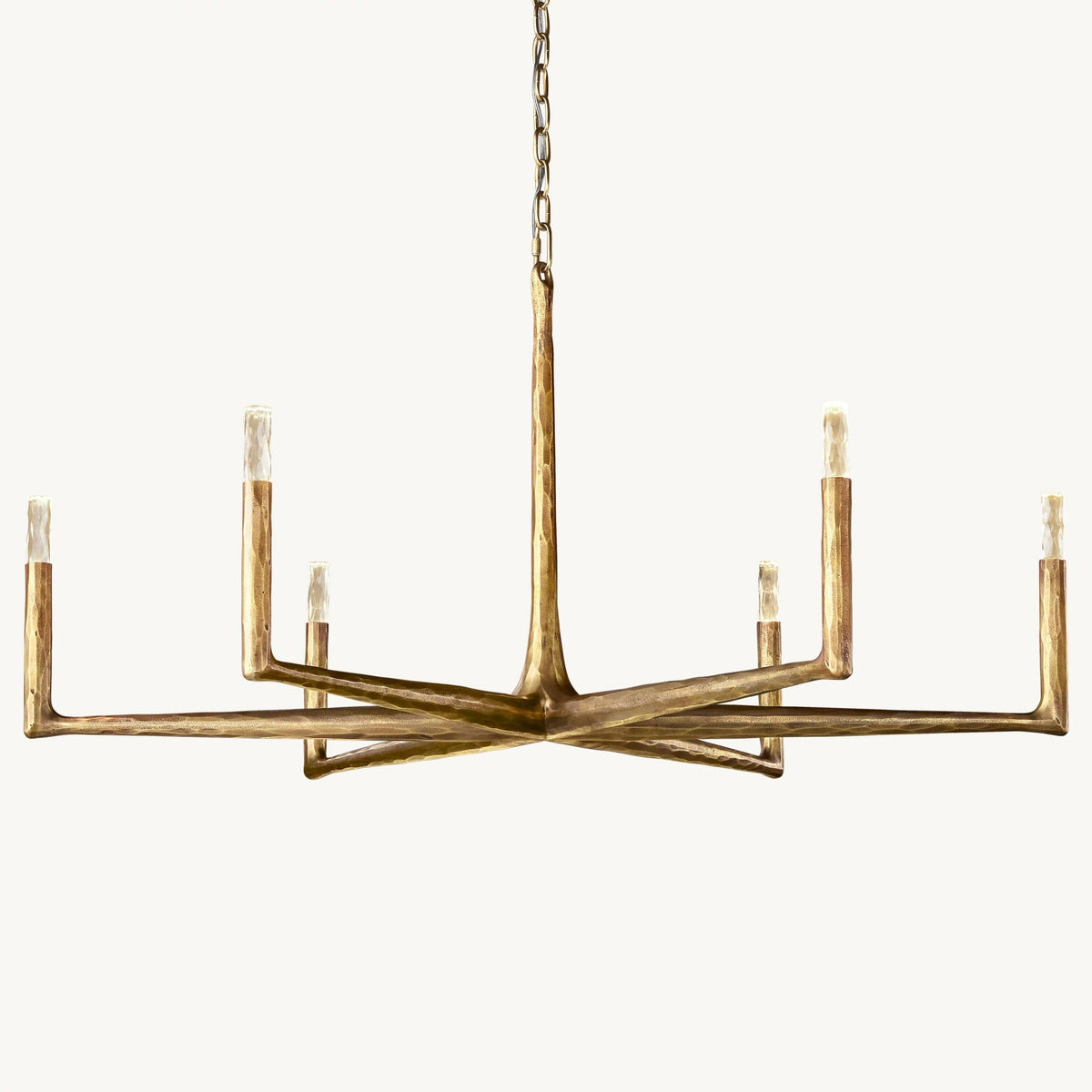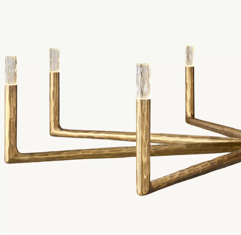 - Crafted from solid brass, each bar is meticulously hand-hammered by skilled artisans, revealing an alive, imperfect, and organic texture that contrasts beautifully with the frame's slender, tapered silhouette. This ancient fabrication process imbues the chandelier with a unique character and a sense of artisanal craftsmanship.