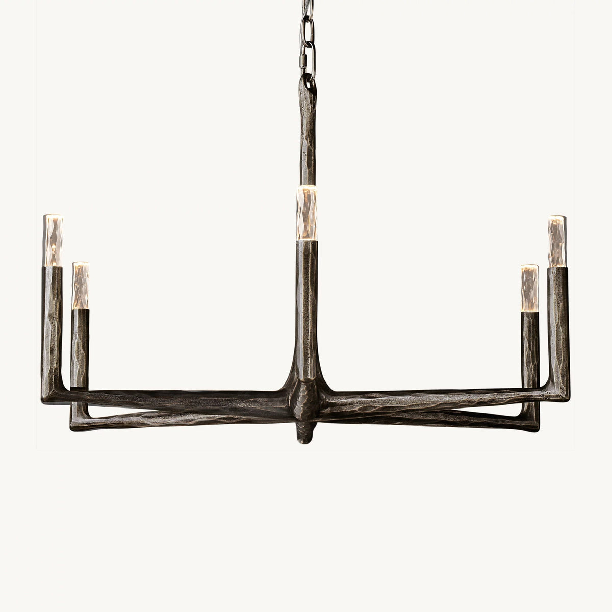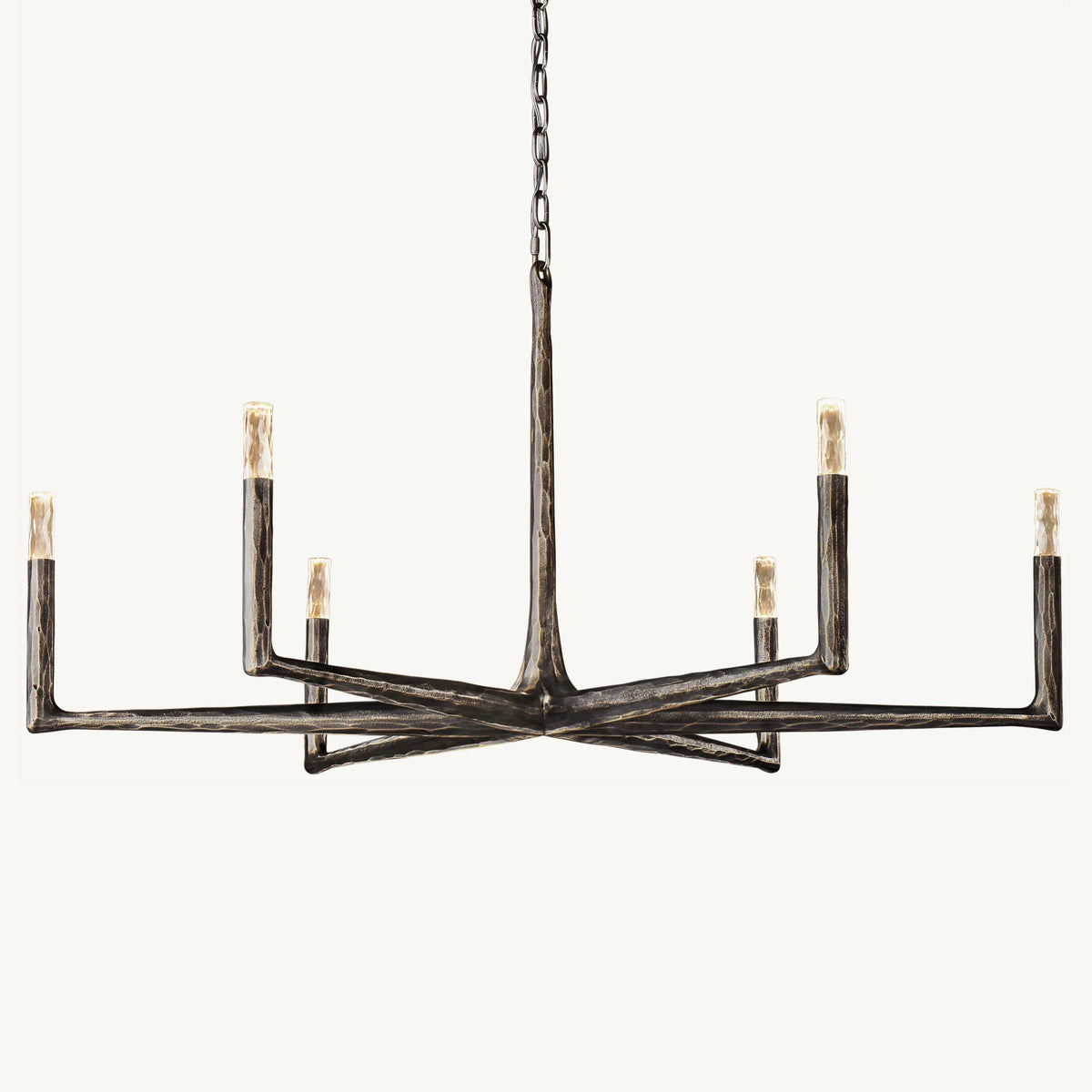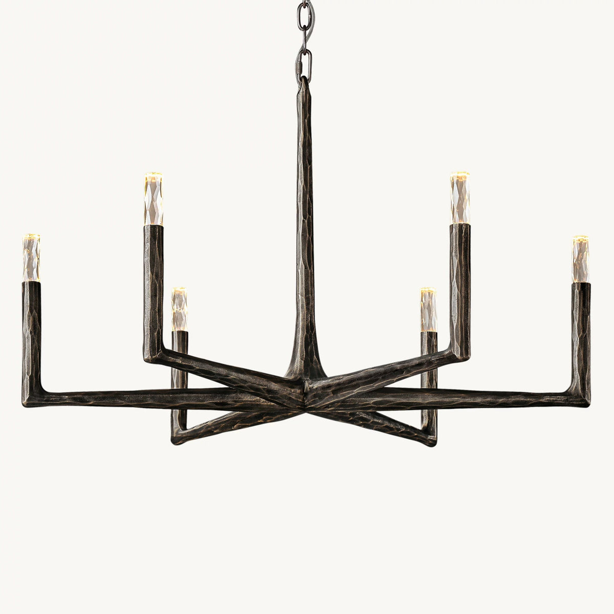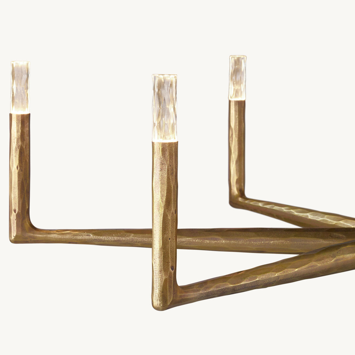 - Crafted from solid brass, each bar is meticulously hand-hammered by skilled artisans, revealing an alive, imperfect, and organic texture that contrasts beautifully with the frame's slender, tapered silhouette. This ancient fabrication process imbues the chandelier with a unique character and a sense of artisanal craftsmanship.