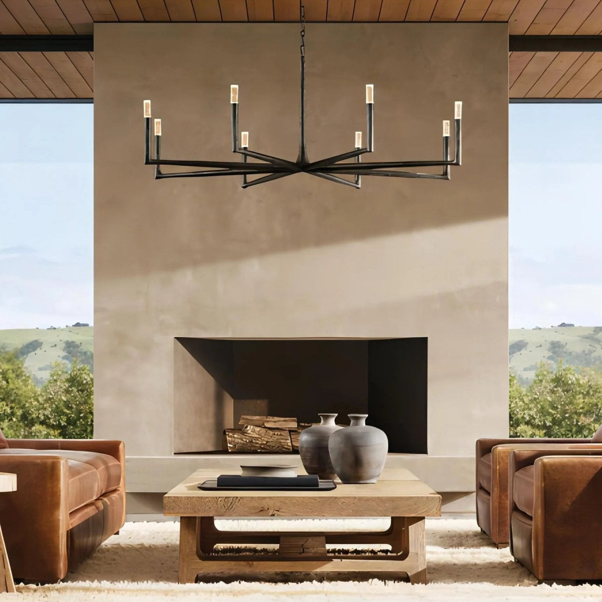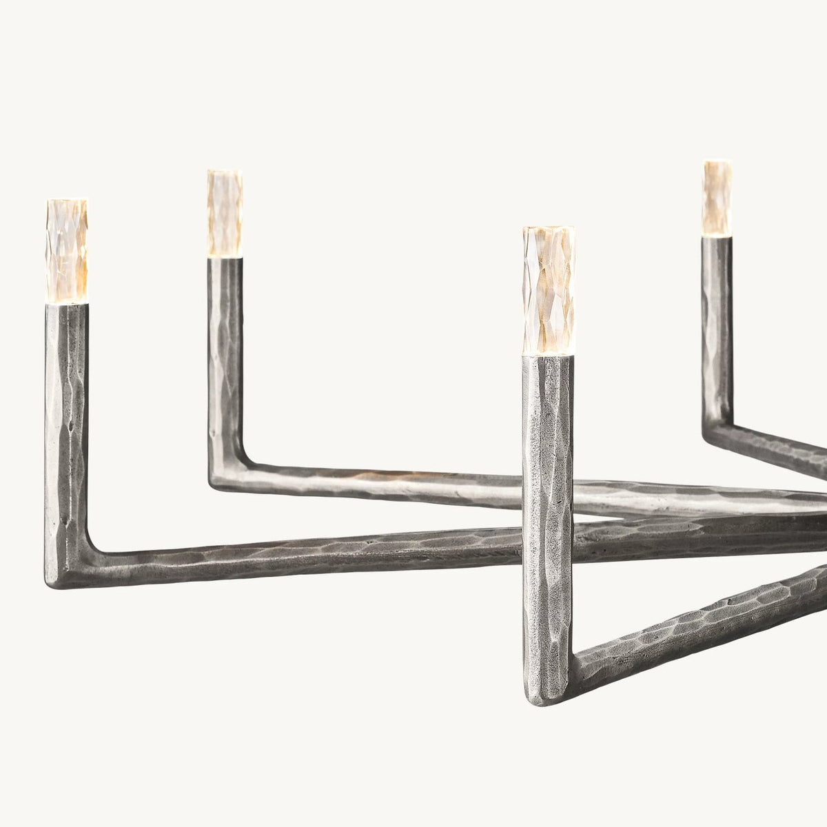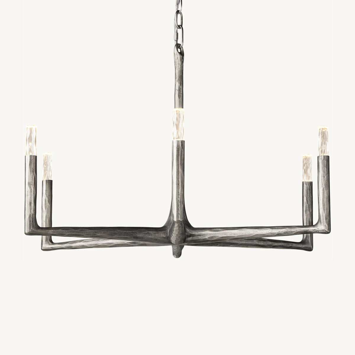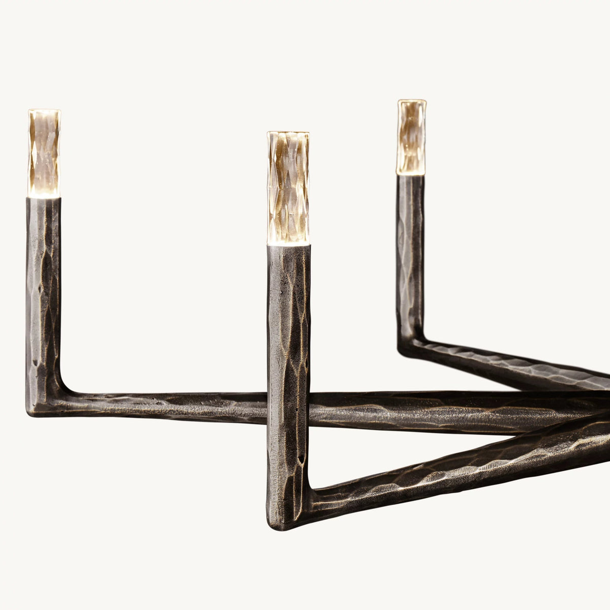 - Crafted from solid brass, each bar is meticulously hand-hammered by skilled artisans, revealing an alive, imperfect, and organic texture that contrasts beautifully with the frame's slender, tapered silhouette. This ancient fabrication process imbues the chandelier with a unique character and a sense of artisanal craftsmanship.