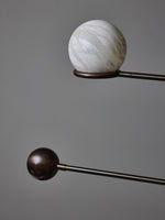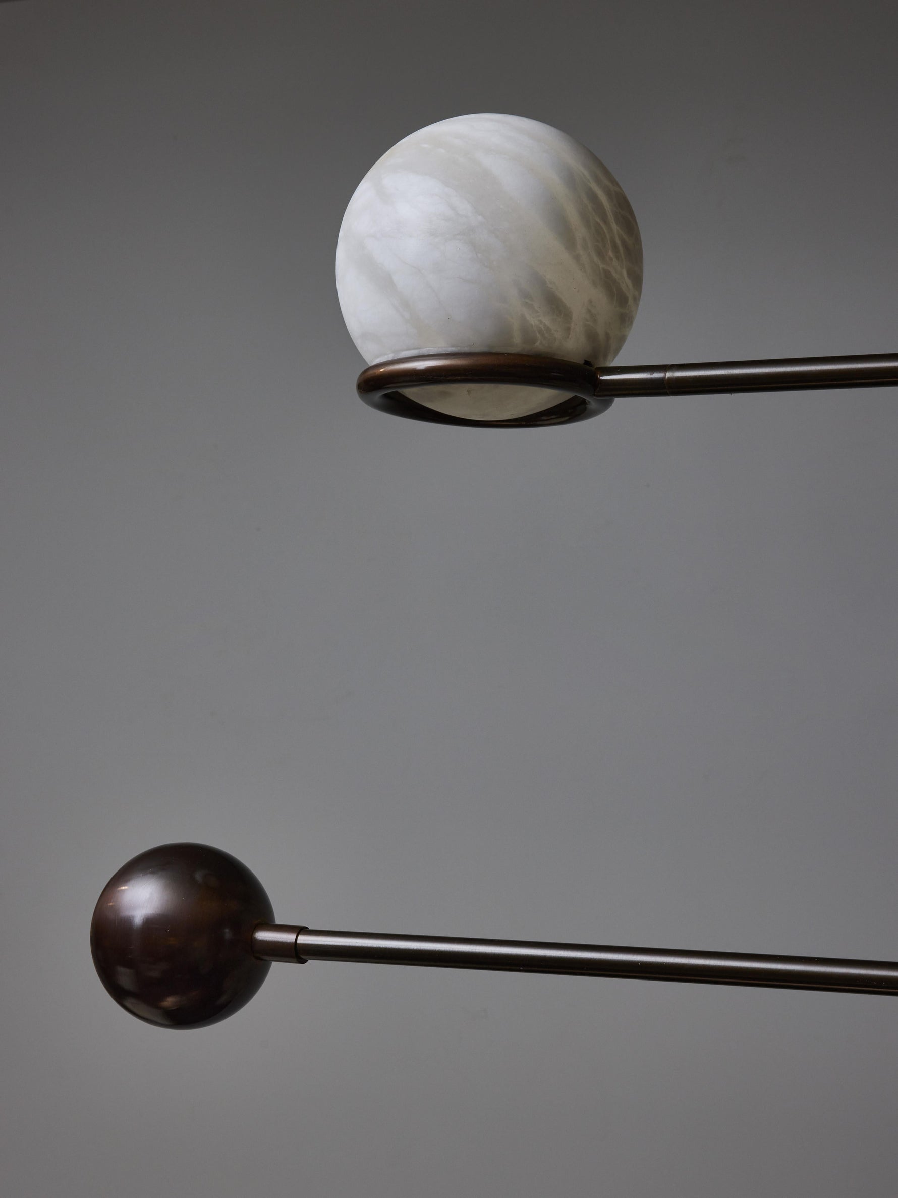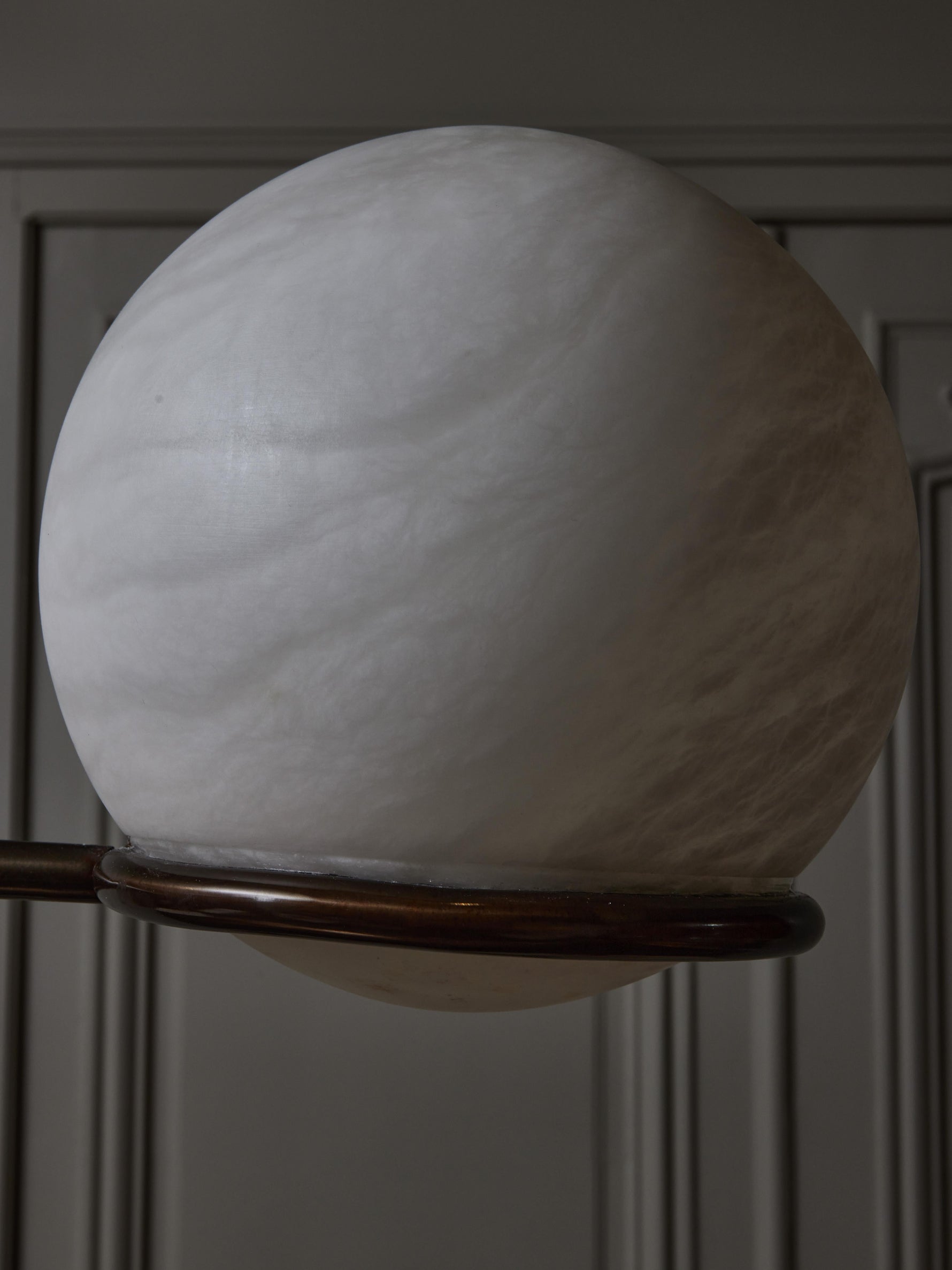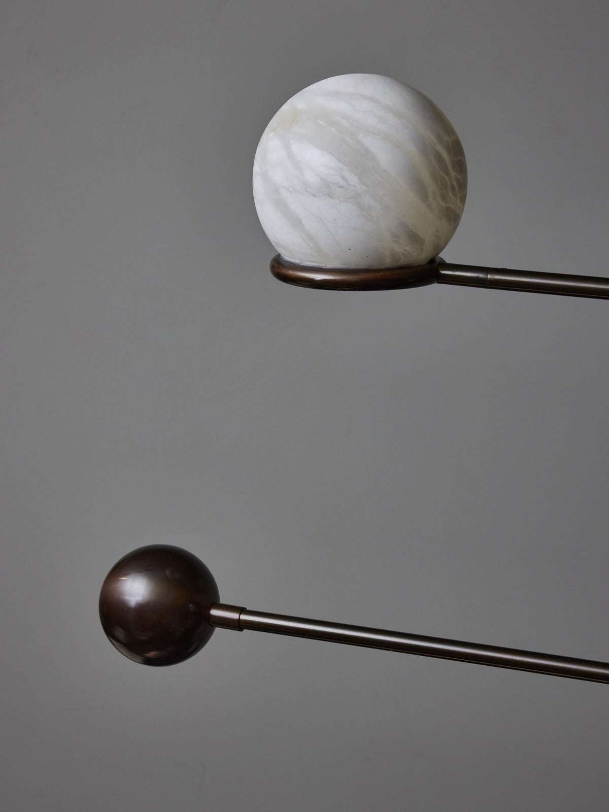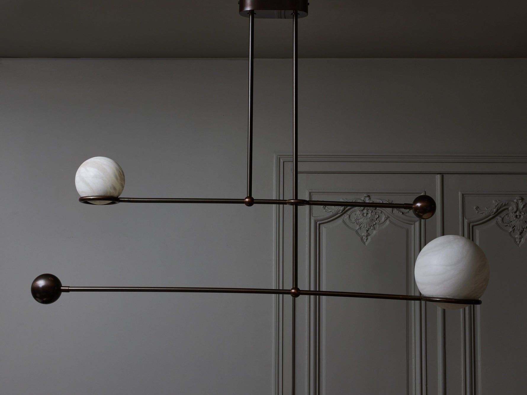 - Introduce an artful dynamic to your space with our Alabaster Double Pendulum Chandelier. This stunning piece features a gracefully arched structure in a warm light bronze brass finish, from which two solid alabaster globes are suspended. The counterbalanced pendulums allow you to manually adjust the height of each light, creating a custom, sculptural look. The milky alabaster provides a soft, diffused glow, perfect for creating an ambient and sophisticated atmosphere in any room.