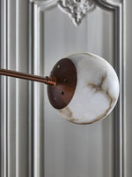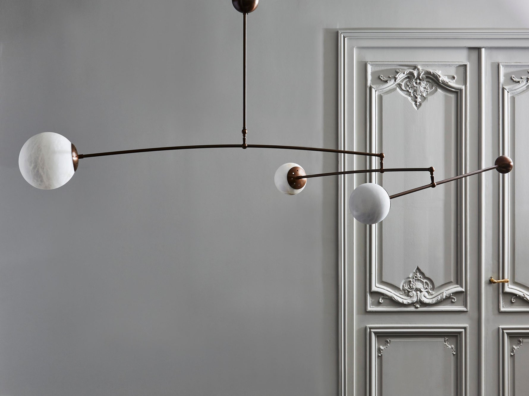 - The Alabaster Triple Mobile Chandelier handcrafted with precision, three gracefully curved arms, finished in a warm, rich patina, extend like branches to present a collection of luminous, solid alabaster globes.
