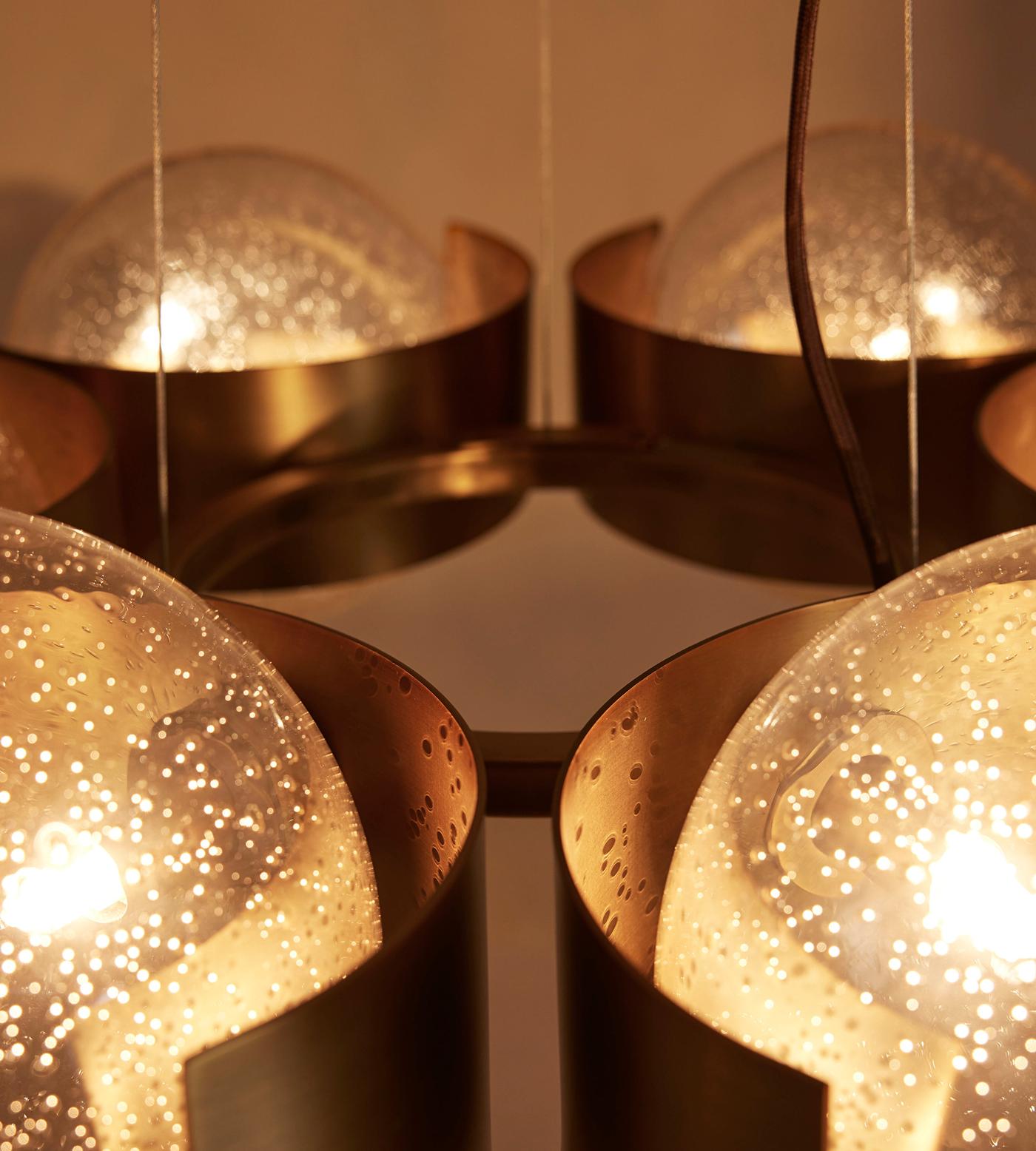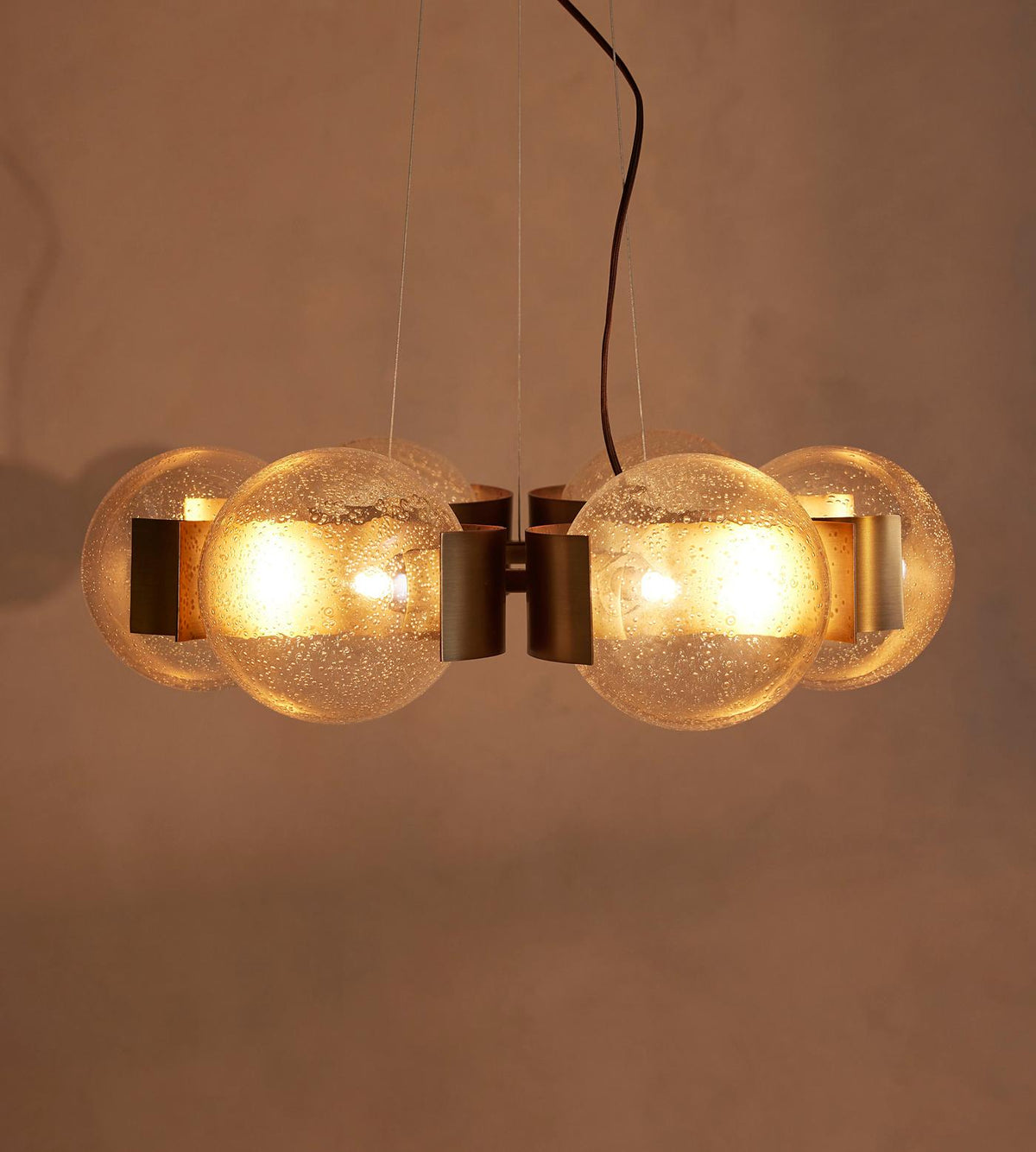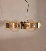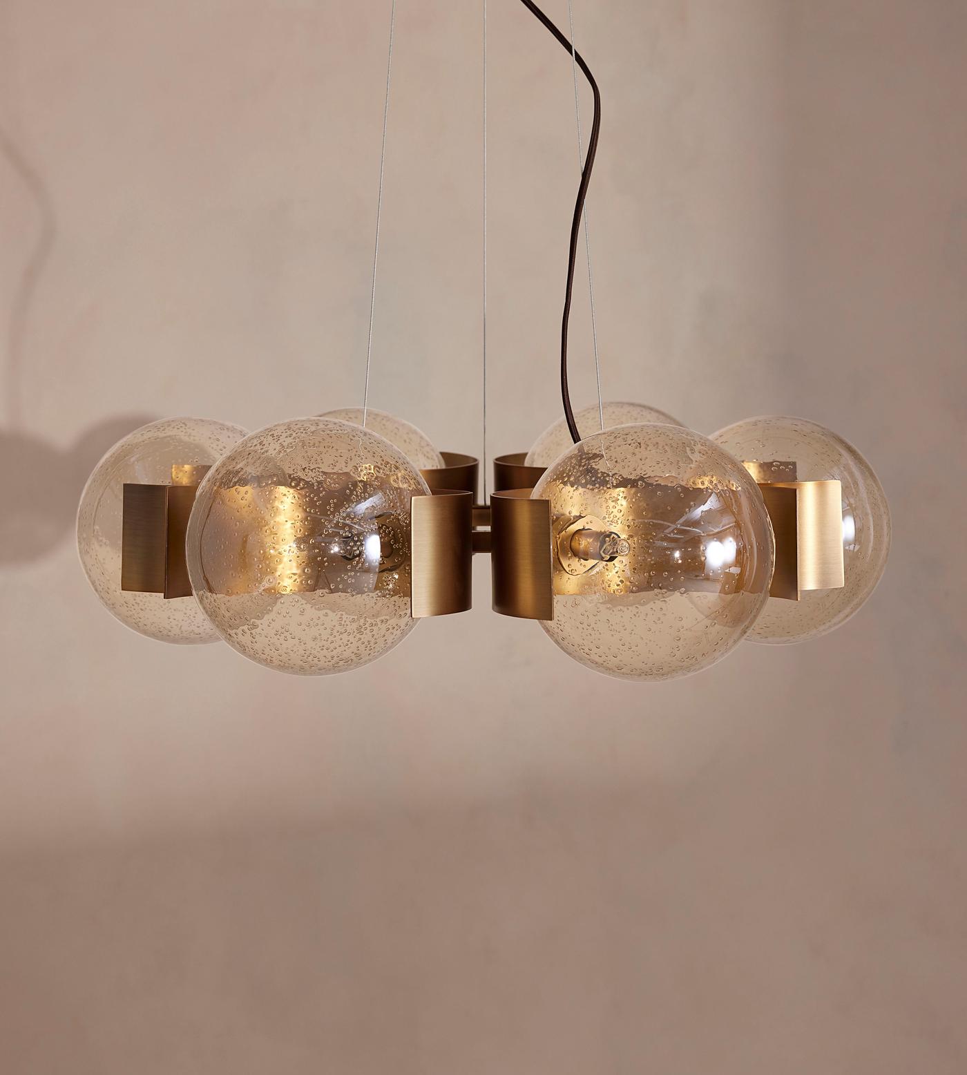 - The magic of the Allis Chandelier lies in its six bubble glass globes. This is not a flat, uniform glass, but a material with life and history woven into its very fabric. Each globe is crafted with intentional, delicate bubbles suspended within the champagne hue. When illuminated, these imperfections become features, not flaws. They act as tiny lenses, fracturing the light into a soft, dynamic glow that dances across your walls and ceiling.