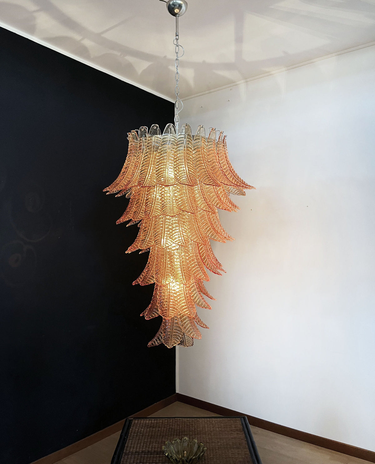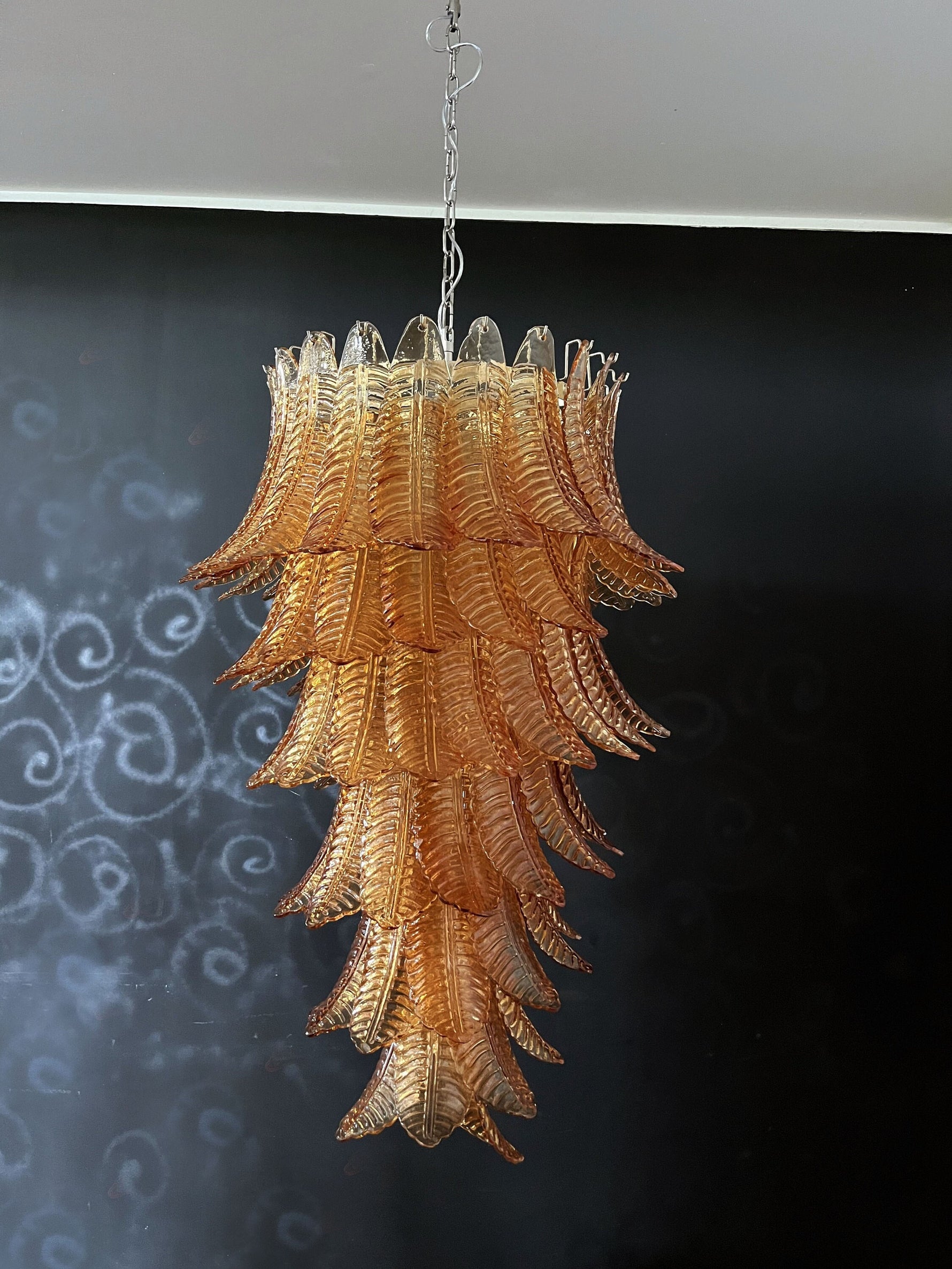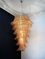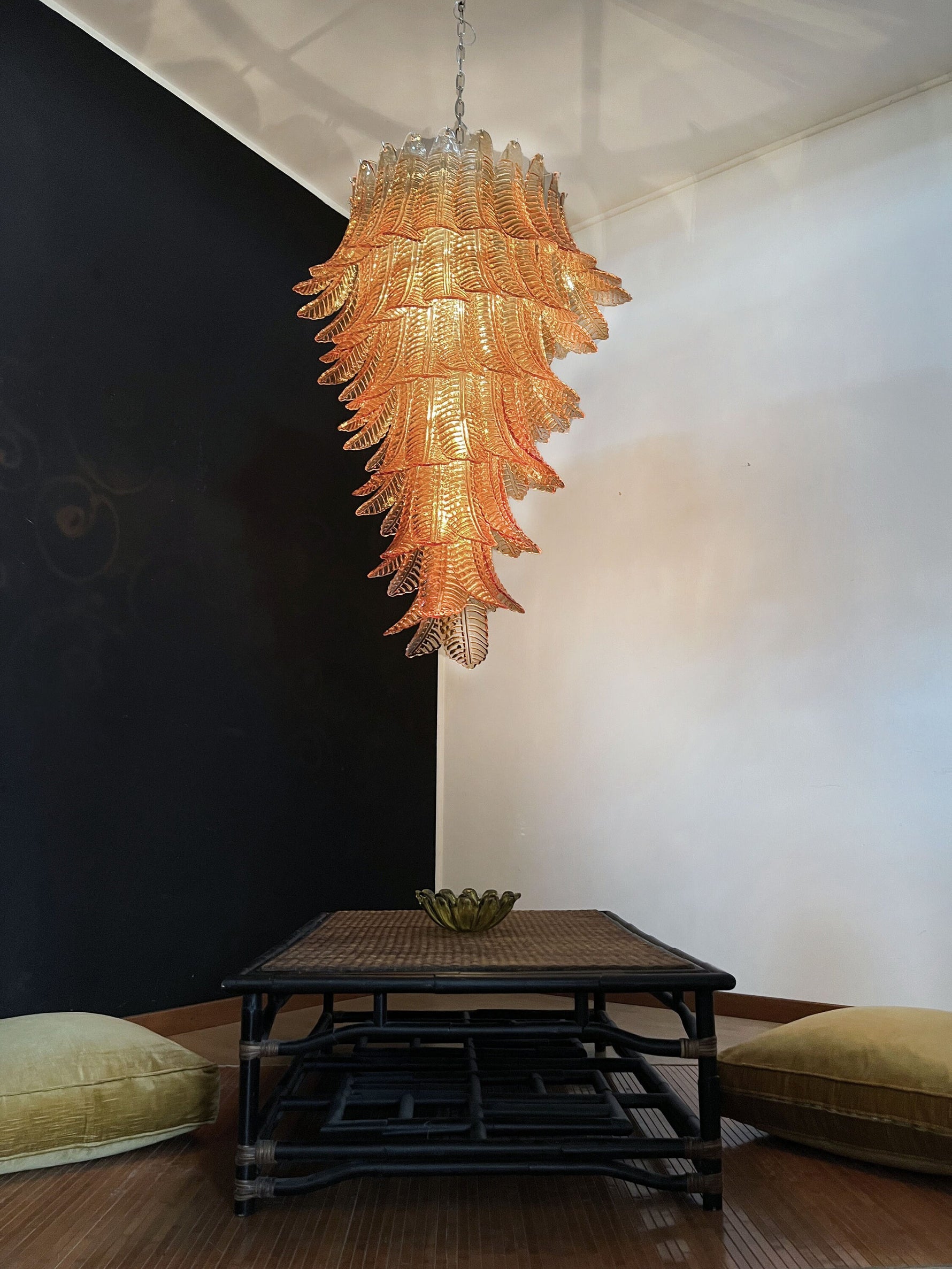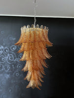 • Command attention and transform your space with this breathtakingly Cas Murano Spiral Chandelier. A true testament to timeless artistry, this magnificent fixture is composed of 83 individual, handcrafted amber glasses, each a unique work of art that captures and refracts light with a warm, golden glow.