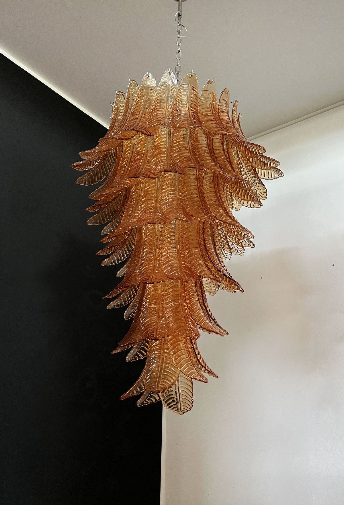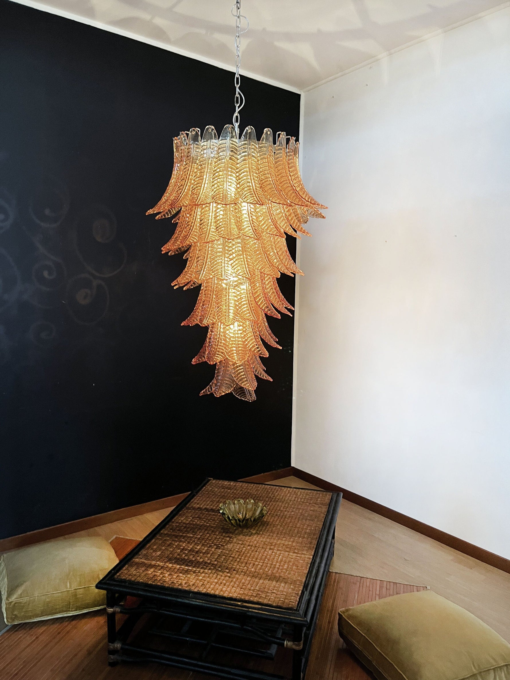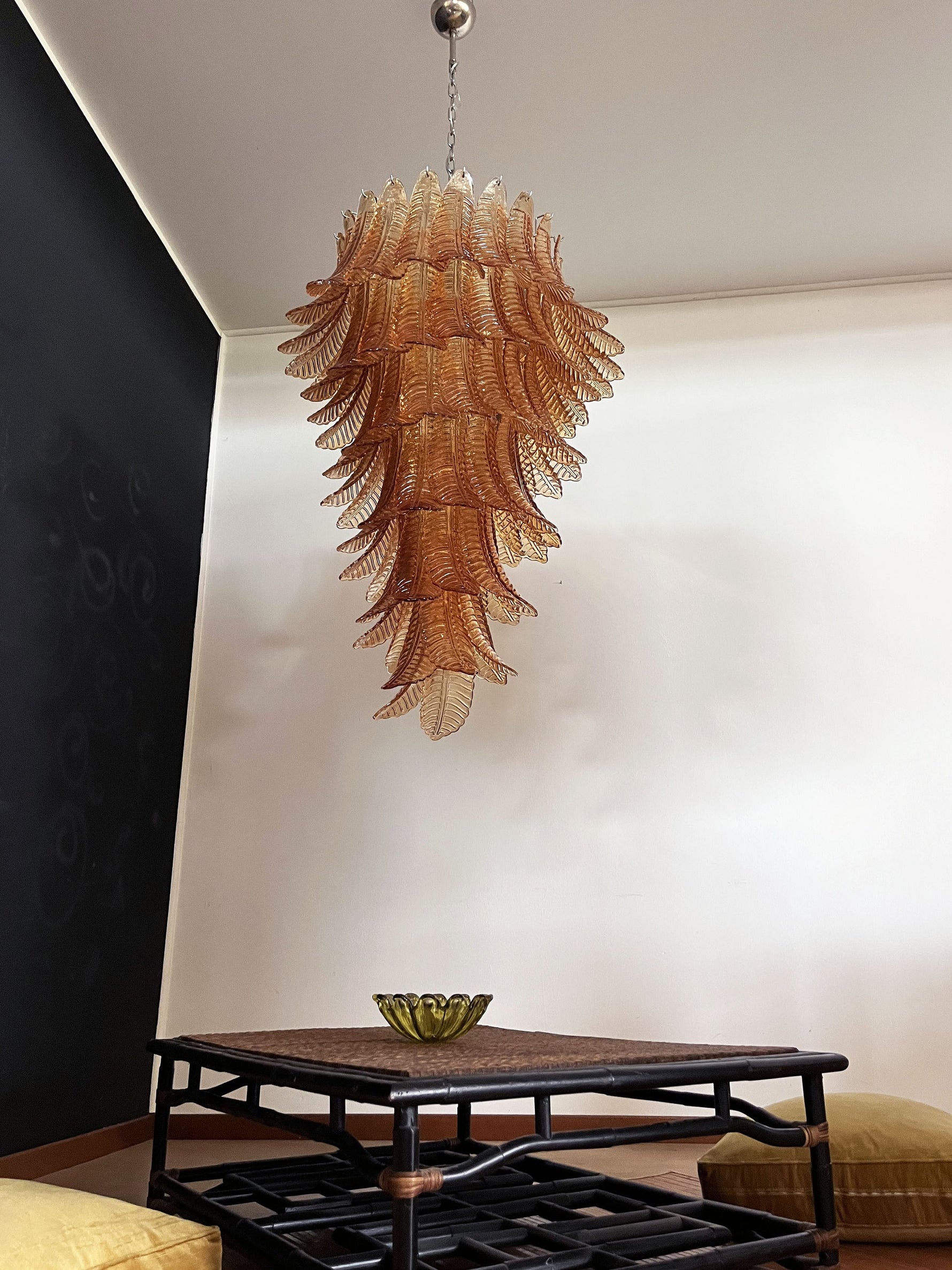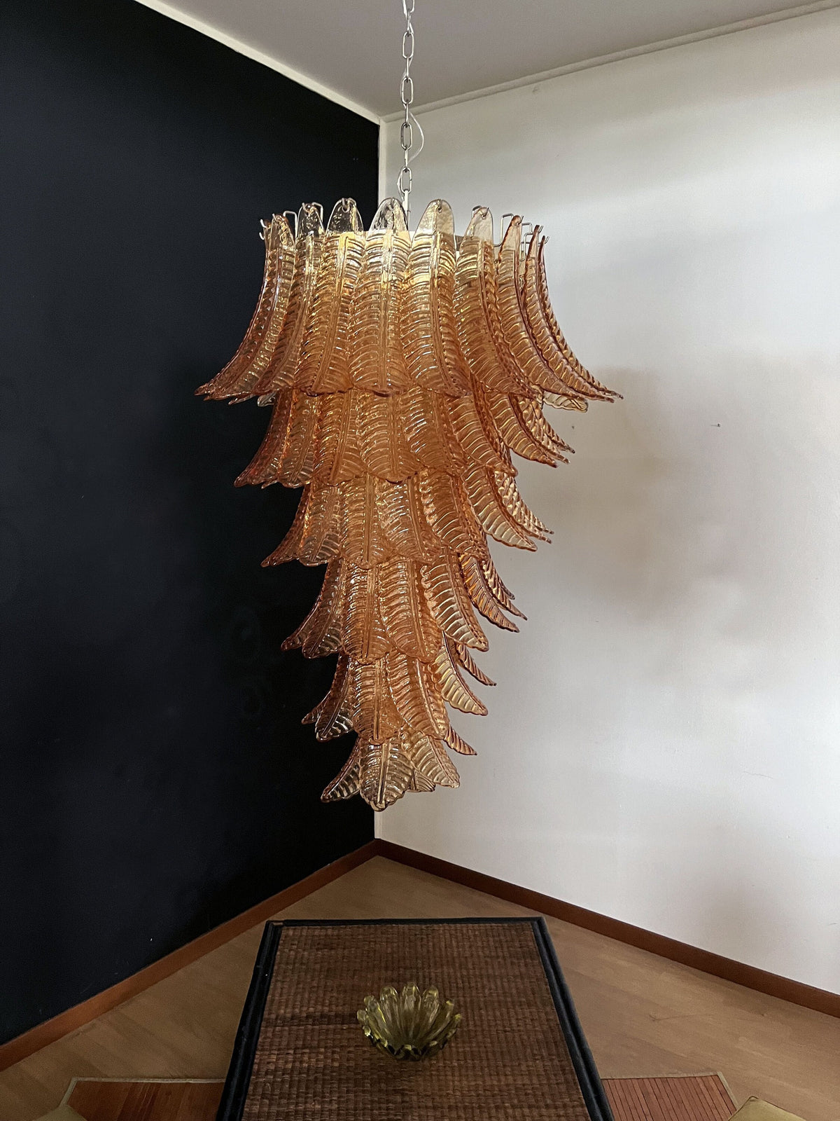 • Command attention and transform your space with this breathtakingly Cas Murano Spiral Chandelier. A true testament to timeless artistry, this magnificent fixture is composed of 83 individual, handcrafted amber glasses, each a unique work of art that captures and refracts light with a warm, golden glow.