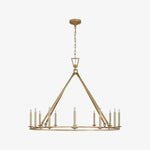 - The design philosophy of the Darlana is one of bold simplicity. Its defining feature is the grand, singular ring that floats majestically from above. This central element is anchored by a precisely engineered triangular suspension bracket, from which sturdy iron chains descend to offer both support and an industrial-chic aesthetic. The lines are impeccably clean and neat, forgoing unnecessary ornamentation to highlight the inherent beauty of its geometric shape. This creates a powerful visual statement that is both minimalist and grand, offering a rich sense of layering and dimension that changes from every viewing angle.