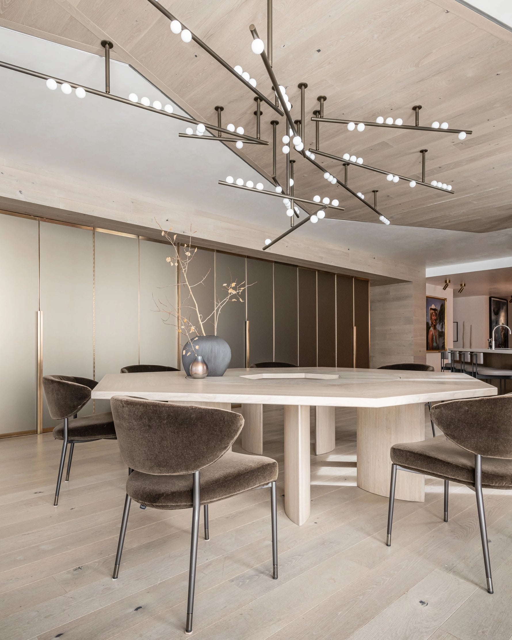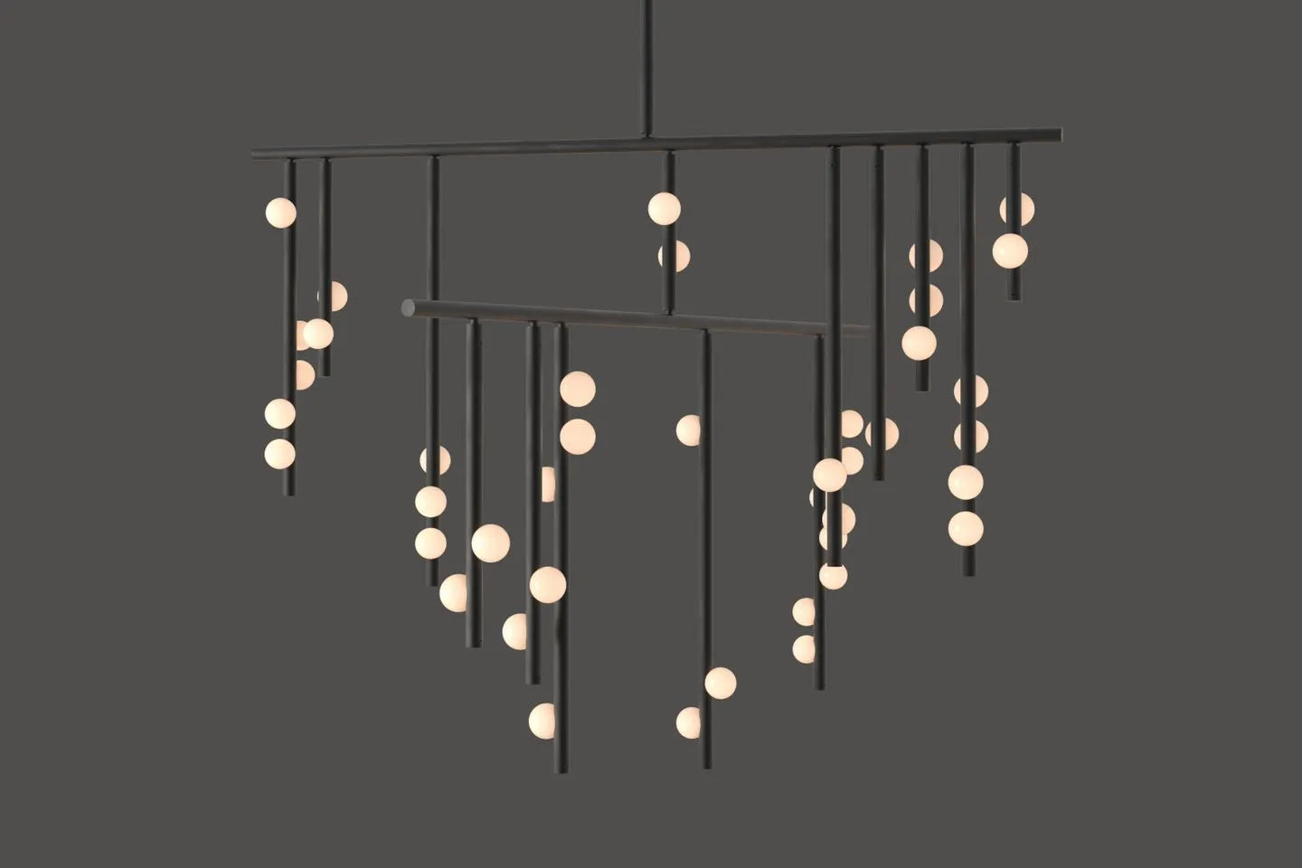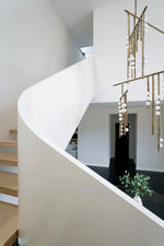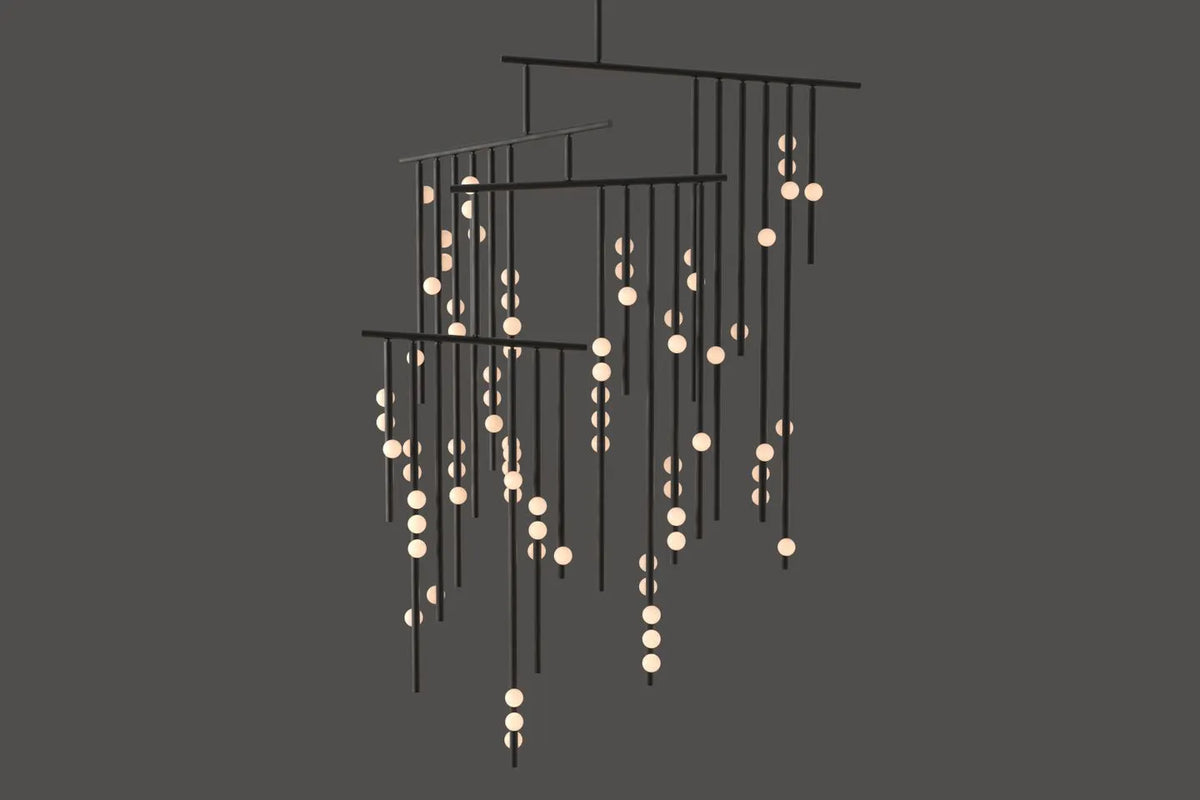 • Beneath a surface of stark angles and precise lines lies an untamed spirit. The Drop System Chandelier is an exploration of this beautiful contradiction—a fantasy of structure set free. We meticulously stripped away all excess, paring the visual vocabulary down to its pure, angular essence, only to discover a captivating, graceful energy within.
