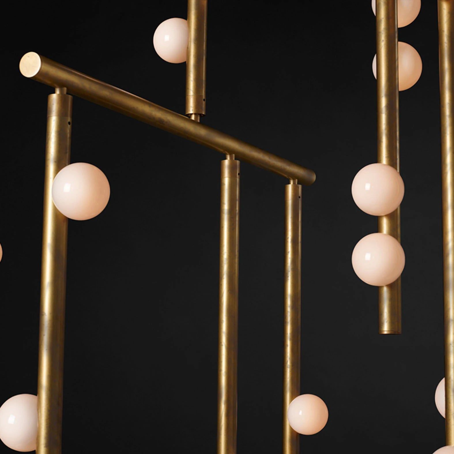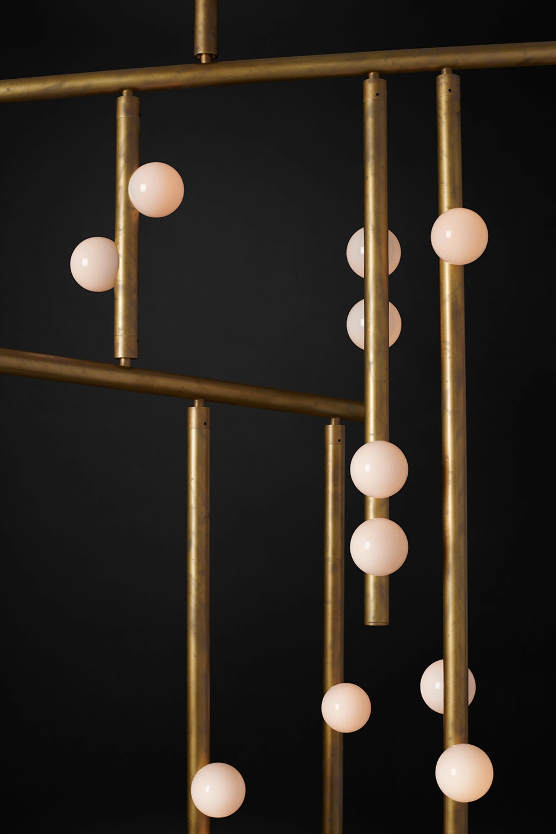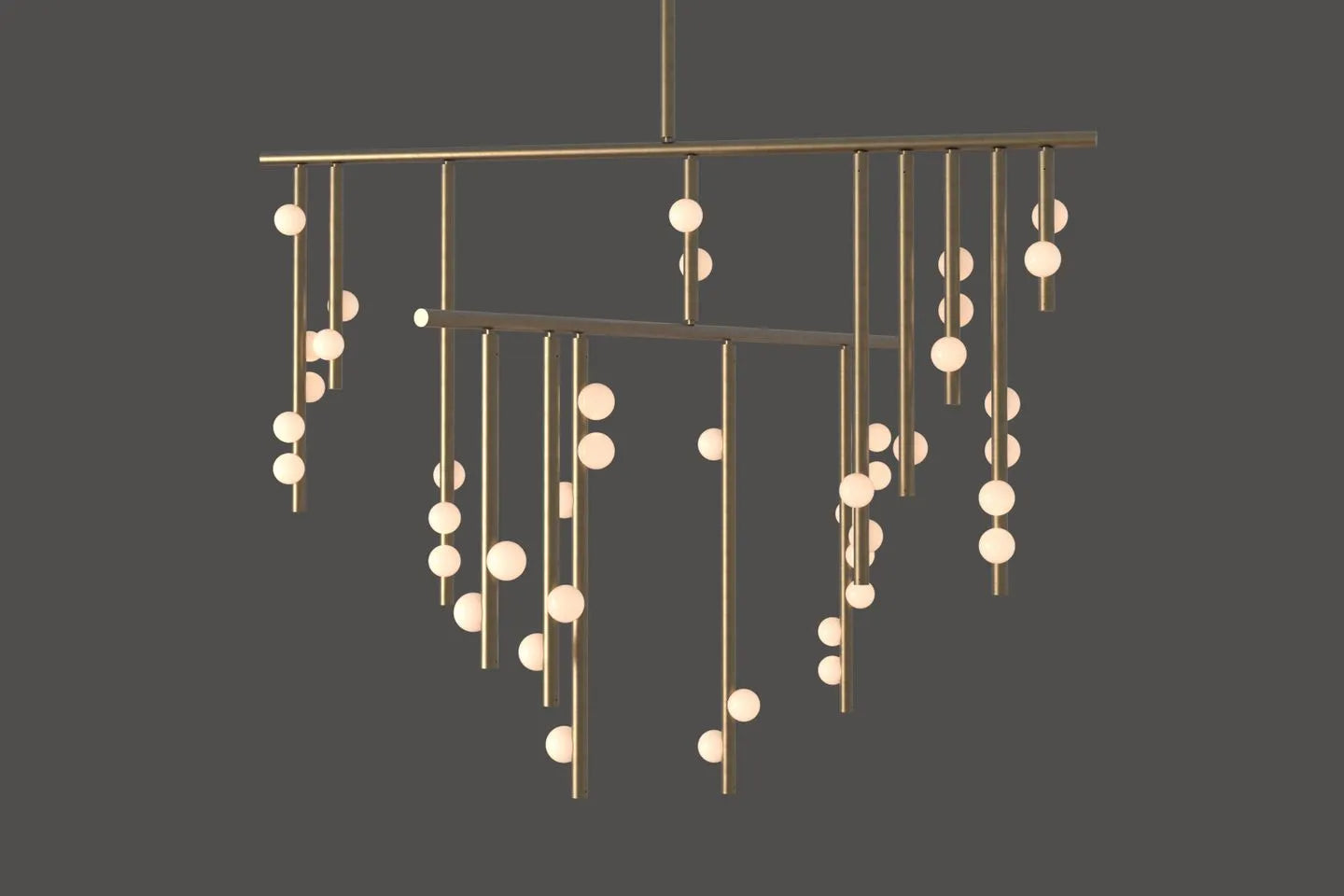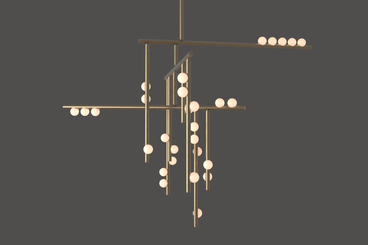 • Imagine a constellation of light, captured not in the sky, but within a framework of exquisite brass tubing. Each rod is a deliberate stroke in an abstract drawing, yet none are static. Our signature engineered joint invites the gentle, persistent force of gravity to become part of the design. With a subtle nudge of air or a soft touch, the entire composition responds, each tube dipping and dangling into a new, gracefully asymmetric arrangement. It is a living sculpture, its form forever fluid and evolving.