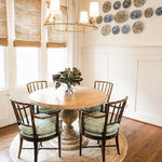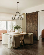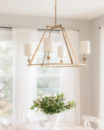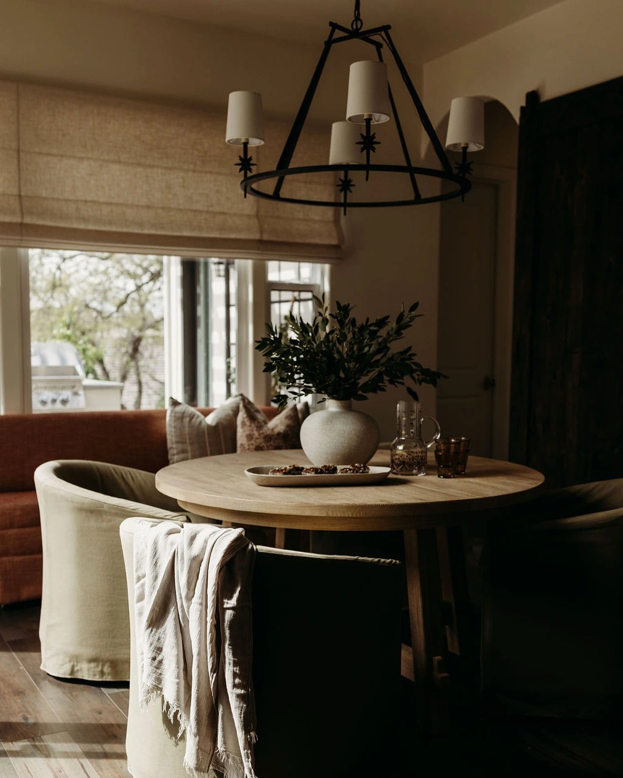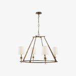 - Bask in the warm, celestial glow of the Etoile Chandelier, a fixture where modern geometry dances with playful artistry. This is not merely a source of light; it is a conversation piece, a sculptural installation that transforms the very atmosphere of a room. Designed for those who appreciate the beauty of contrast, the Etoile masterfully balances bold, graphic ironwork with the soft, organic charm of textural linen shades. It is at once a statement of refined glamour and an invitation to relax, making it the perfect centerpiece for a home that values both design and comfort.