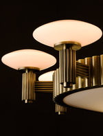 - Experience the magic of nine distinct lighting points. Eight gracefully ribbed arms curve upwards, casting a soft, ambient glow across your ceiling to create an atmosphere of warmth and grandeur. At its heart, a ninth light is suspended beneath a elegant slumped glass dome, providing a gentle, focused downlight perfect for highlighting a dining table or seating area below.