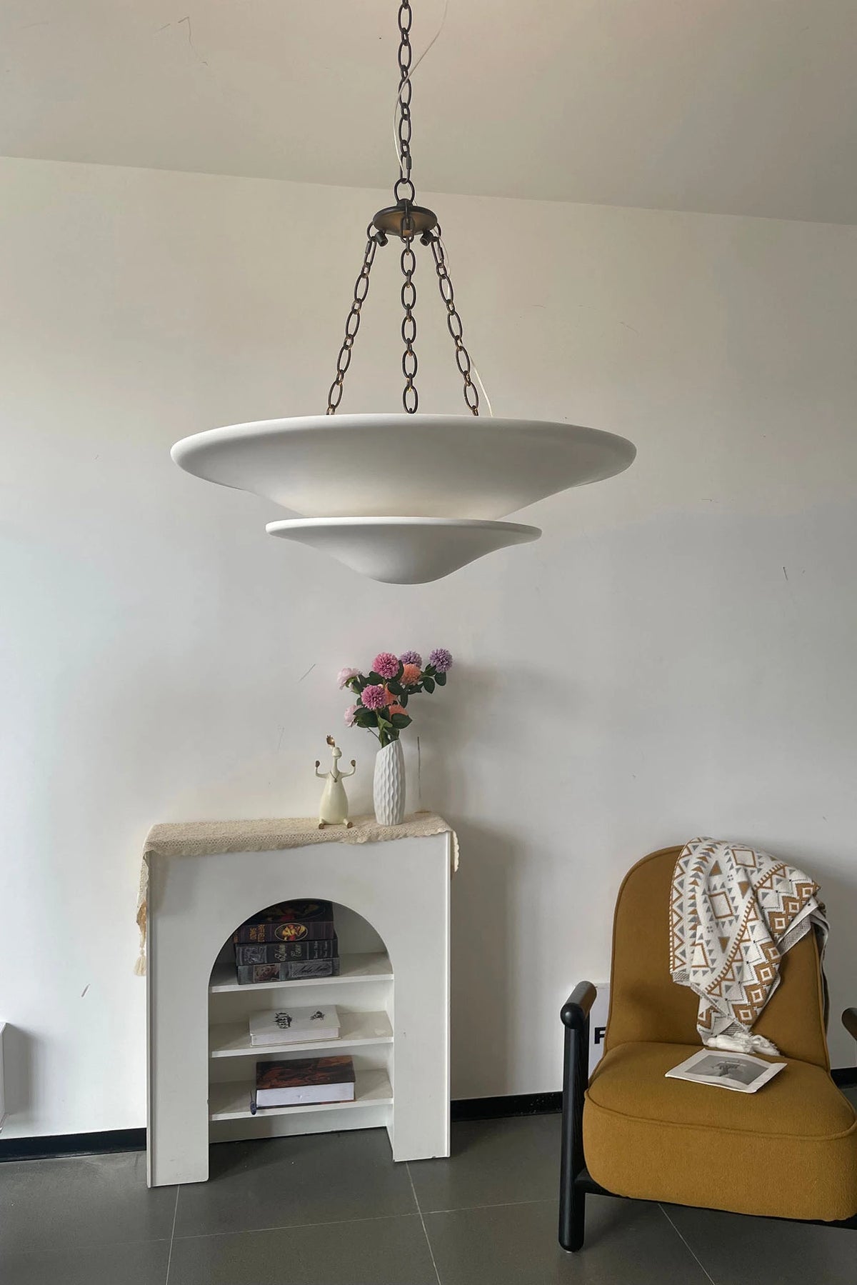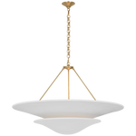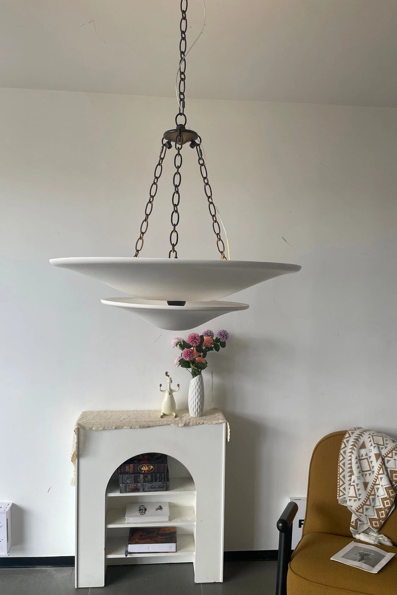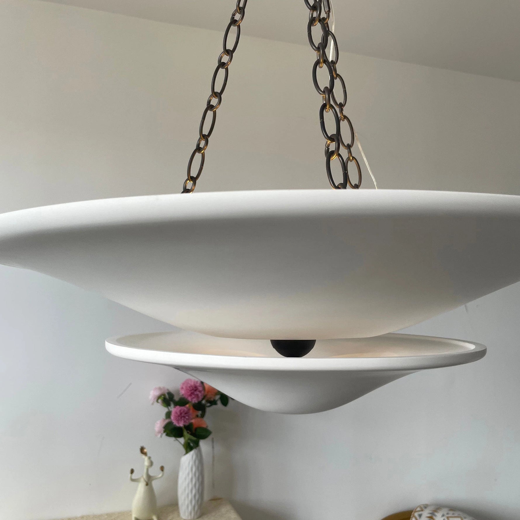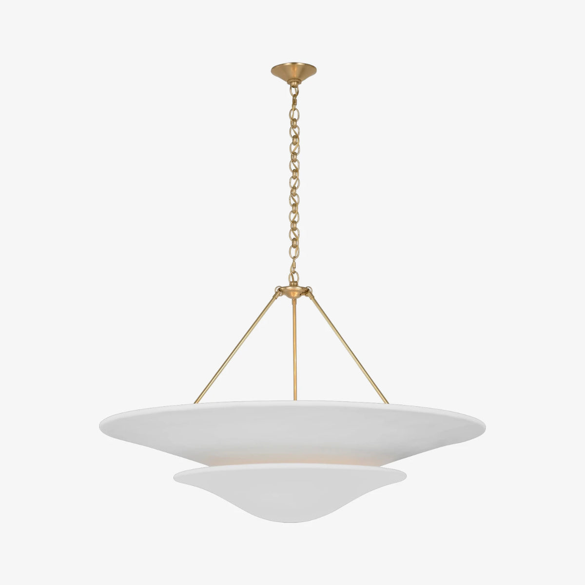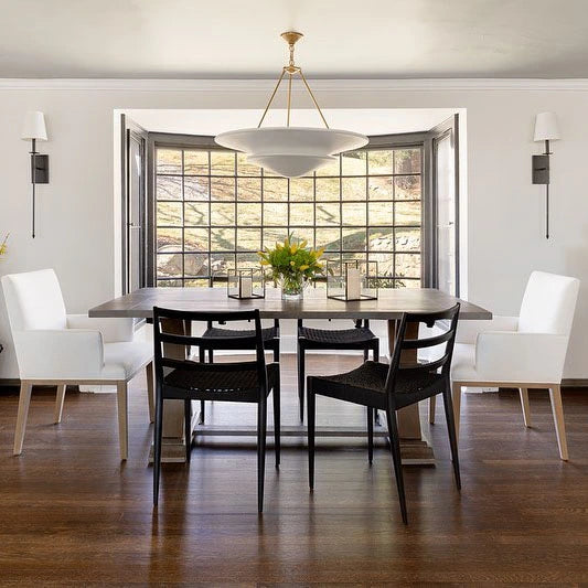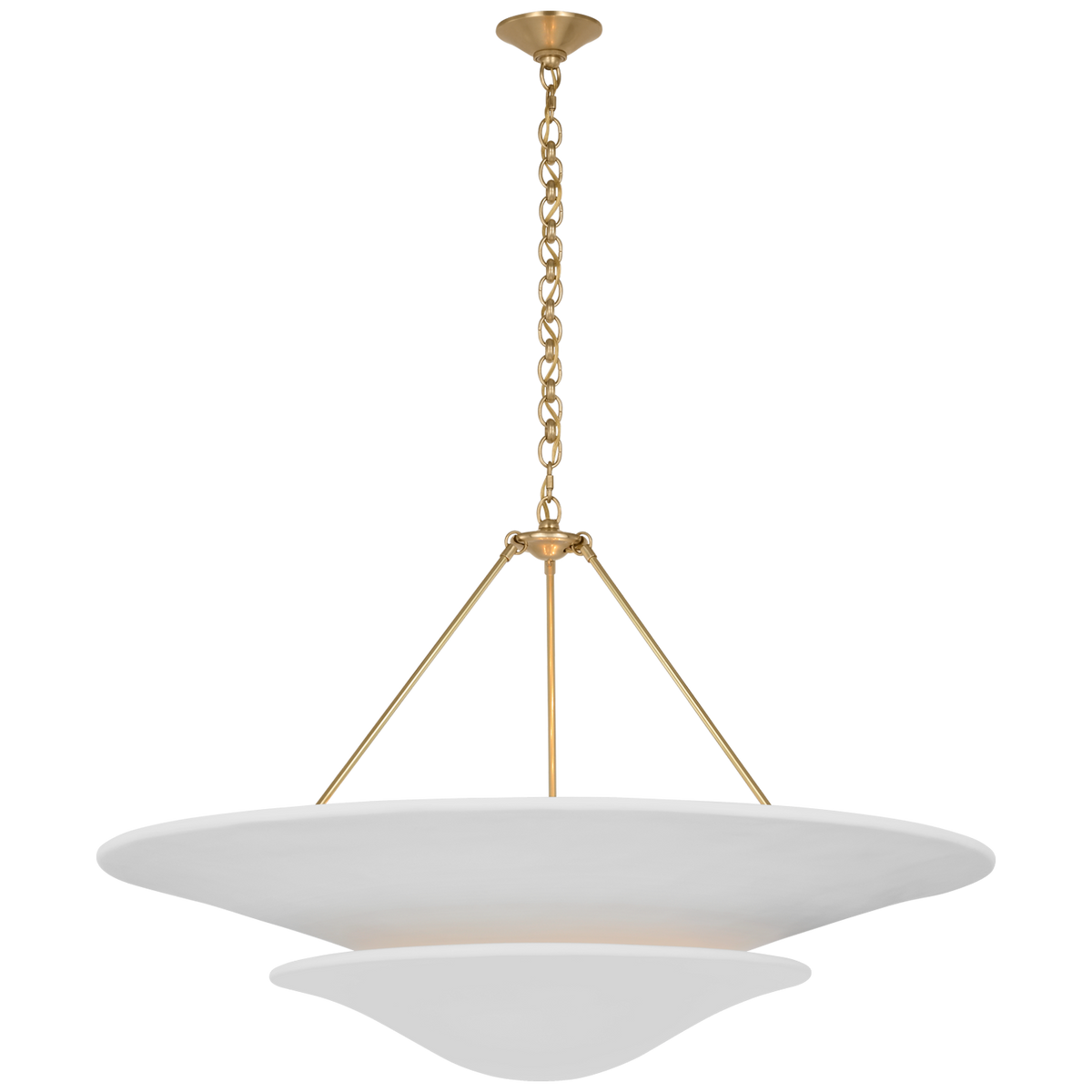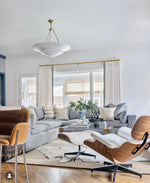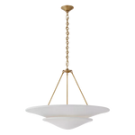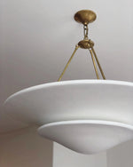 • Illuminate your space with timeless elegance. The Mollino Chandelier is a masterclass in balanced design, artfully blending the warm, vintage charm of brass with the soft, modern simplicity of plaster. This stunning piece is more than just a light source; it's a statement of refined taste and a focal point for any room.