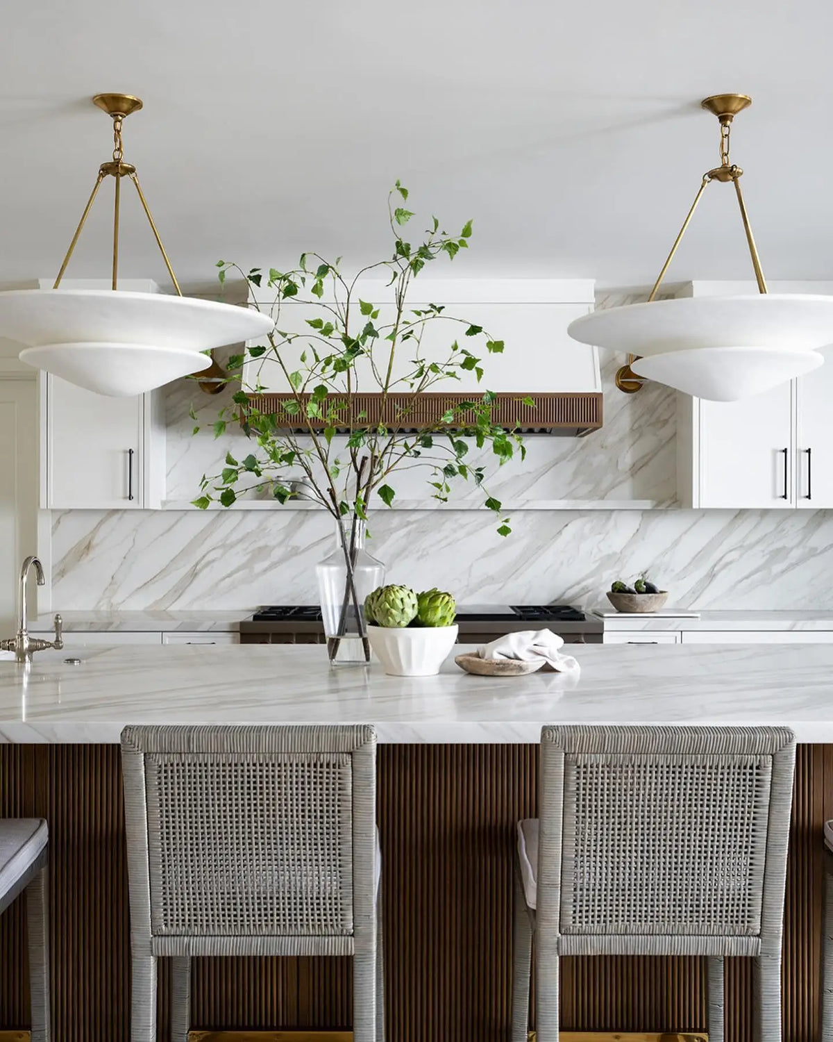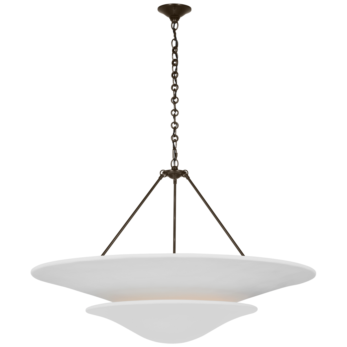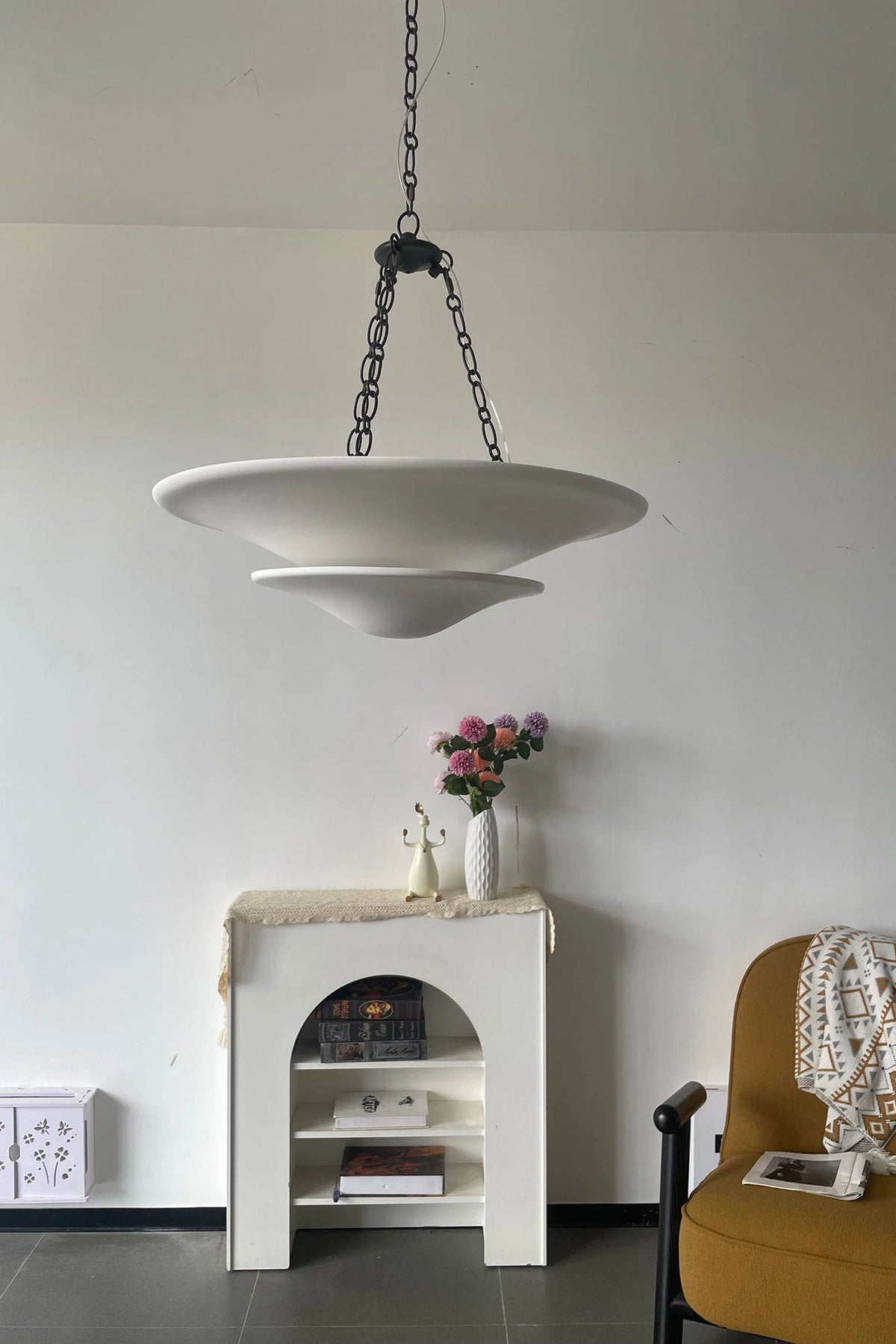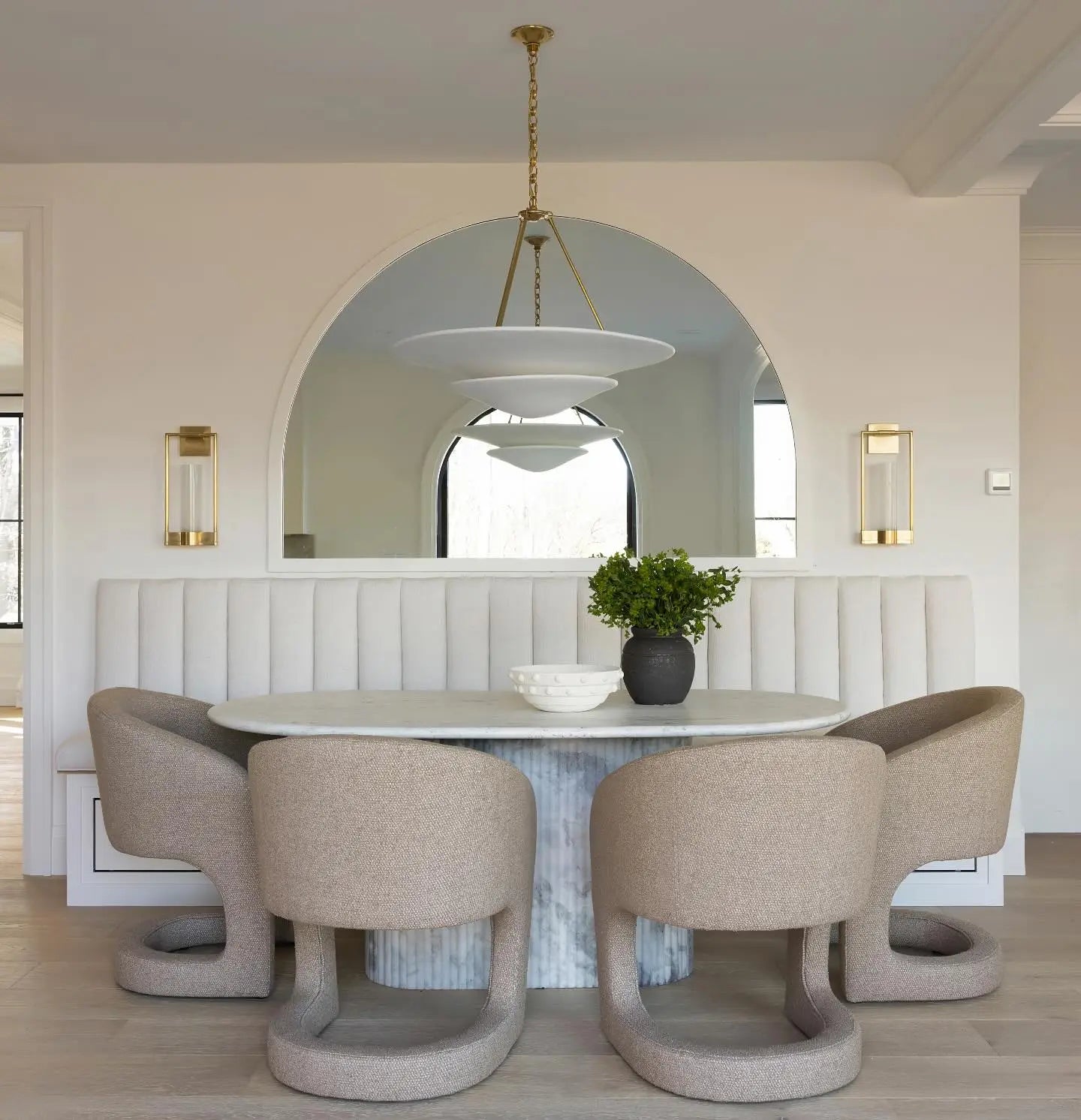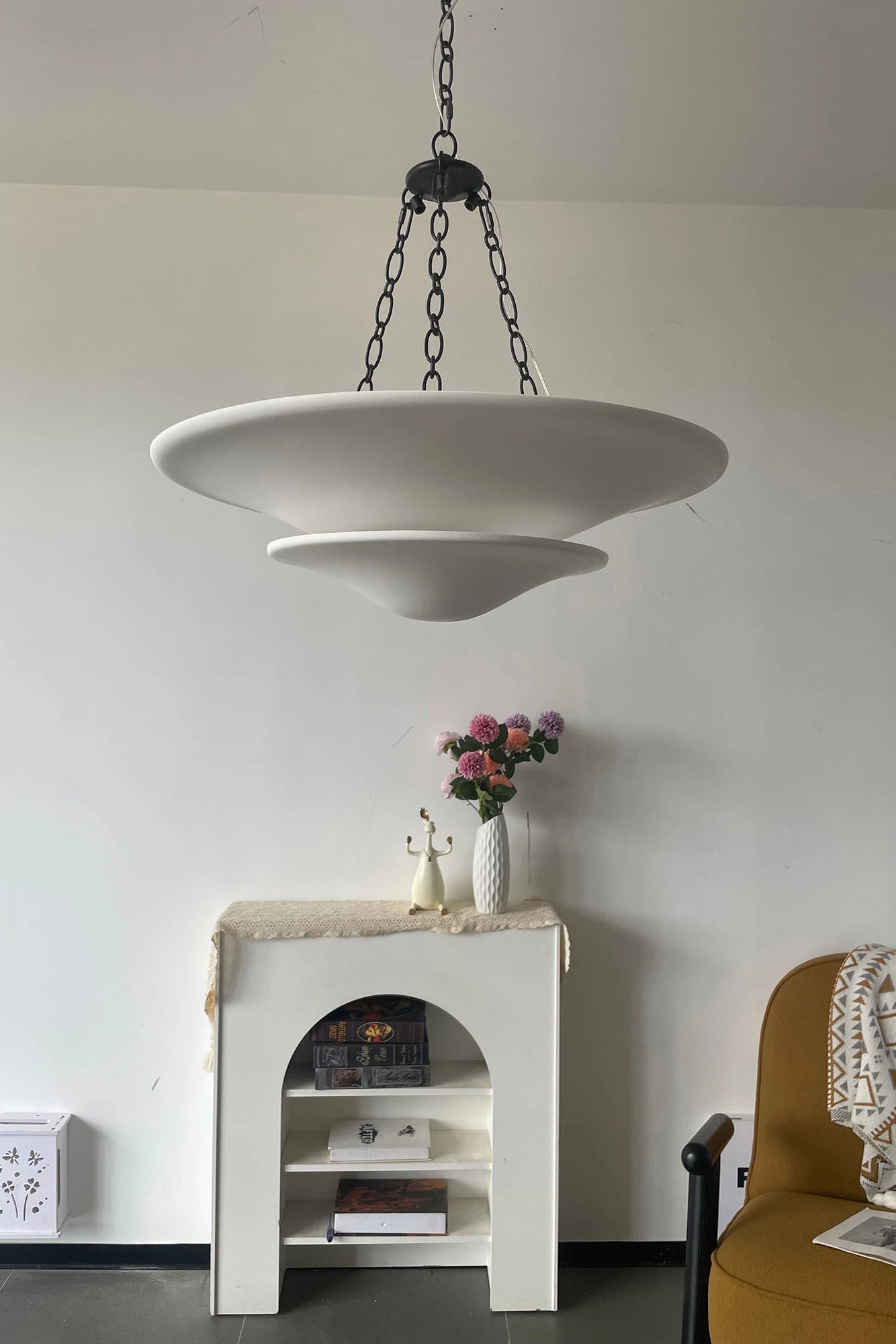 • Illuminate your space with timeless elegance. The Mollino Chandelier is a masterclass in balanced design, artfully blending the warm, vintage charm of brass with the soft, modern simplicity of plaster. This stunning piece is more than just a light source; it's a statement of refined taste and a focal point for any room.