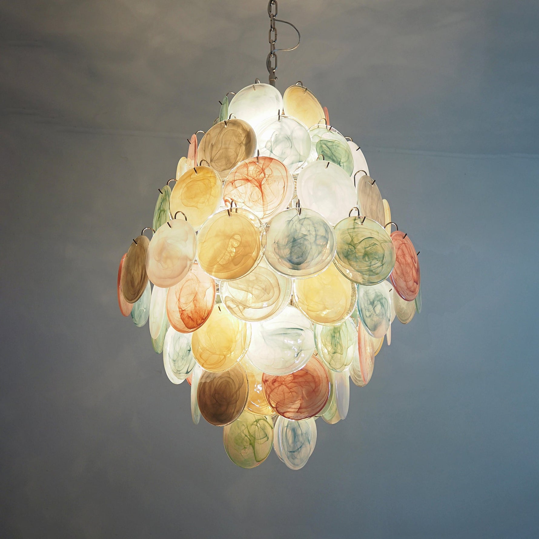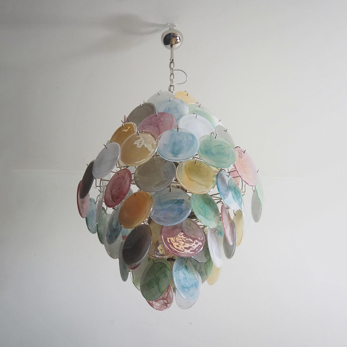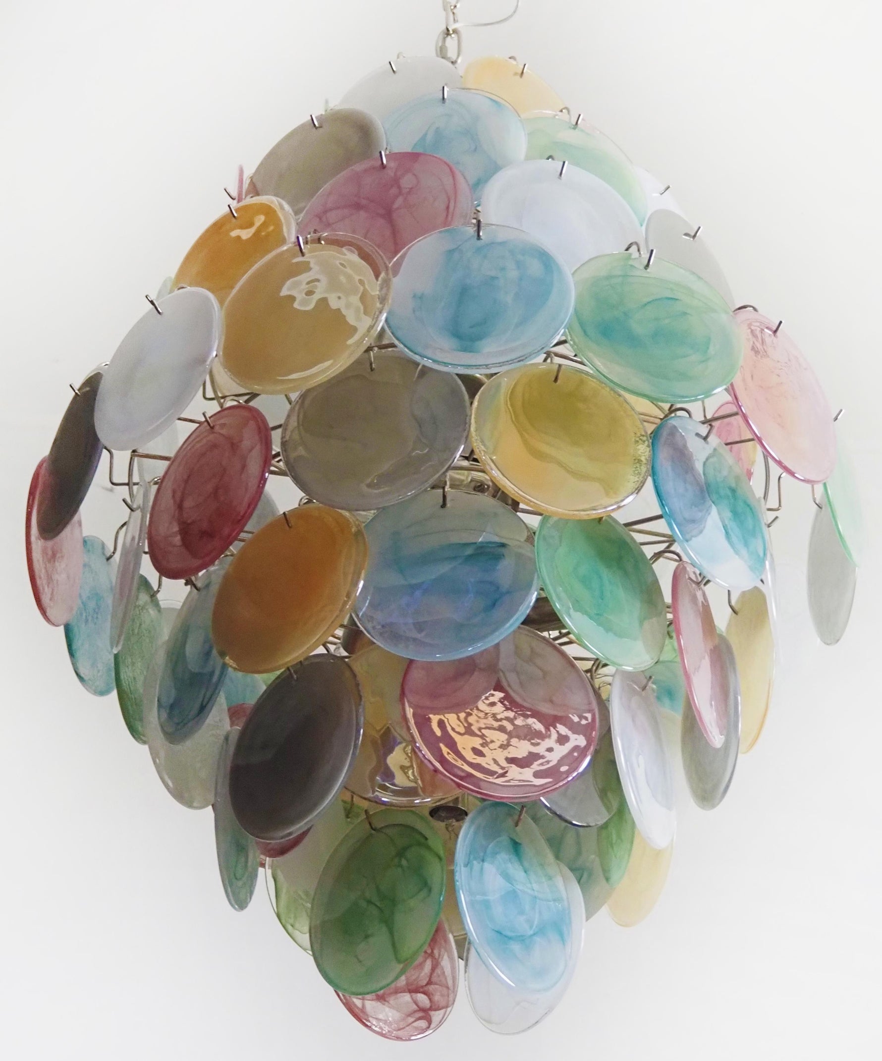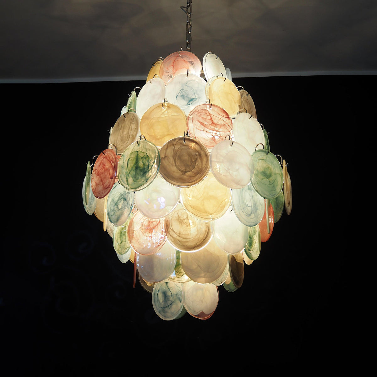 - When darkness falls, the true magic begins. As the internal light source illuminates, a warm and diffuse radiance filters through the multitude of colored, textured disks. The light is softened and tinted, casting a kaleidoscope of gentle, ambient color across your walls and ceiling. The effect is a profoundly warm and artistic atmosphere, evoking the feeling of a sun-drenched stained-glass window or a sophisticated modern art installation. Murano Disc Chandelier Arlecchino 87 provides perfect ambient lighting for dining, relaxing, or entertaining, eliminating all harshness and inviting a sense of calm and wonder.