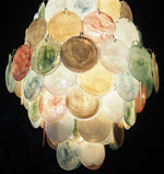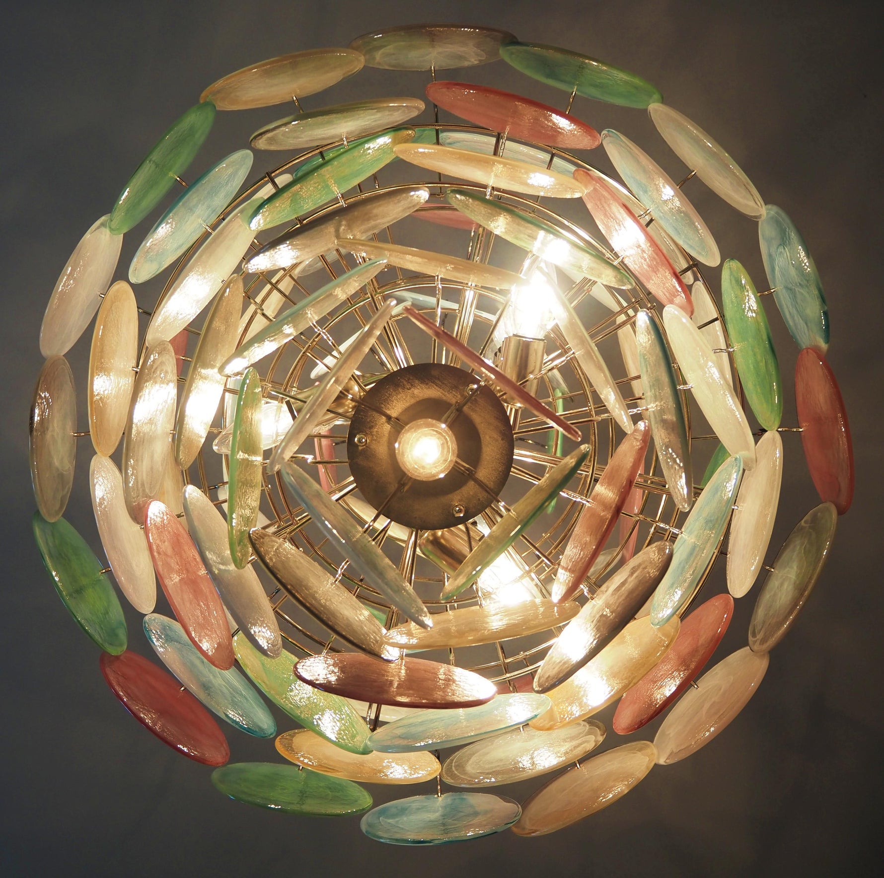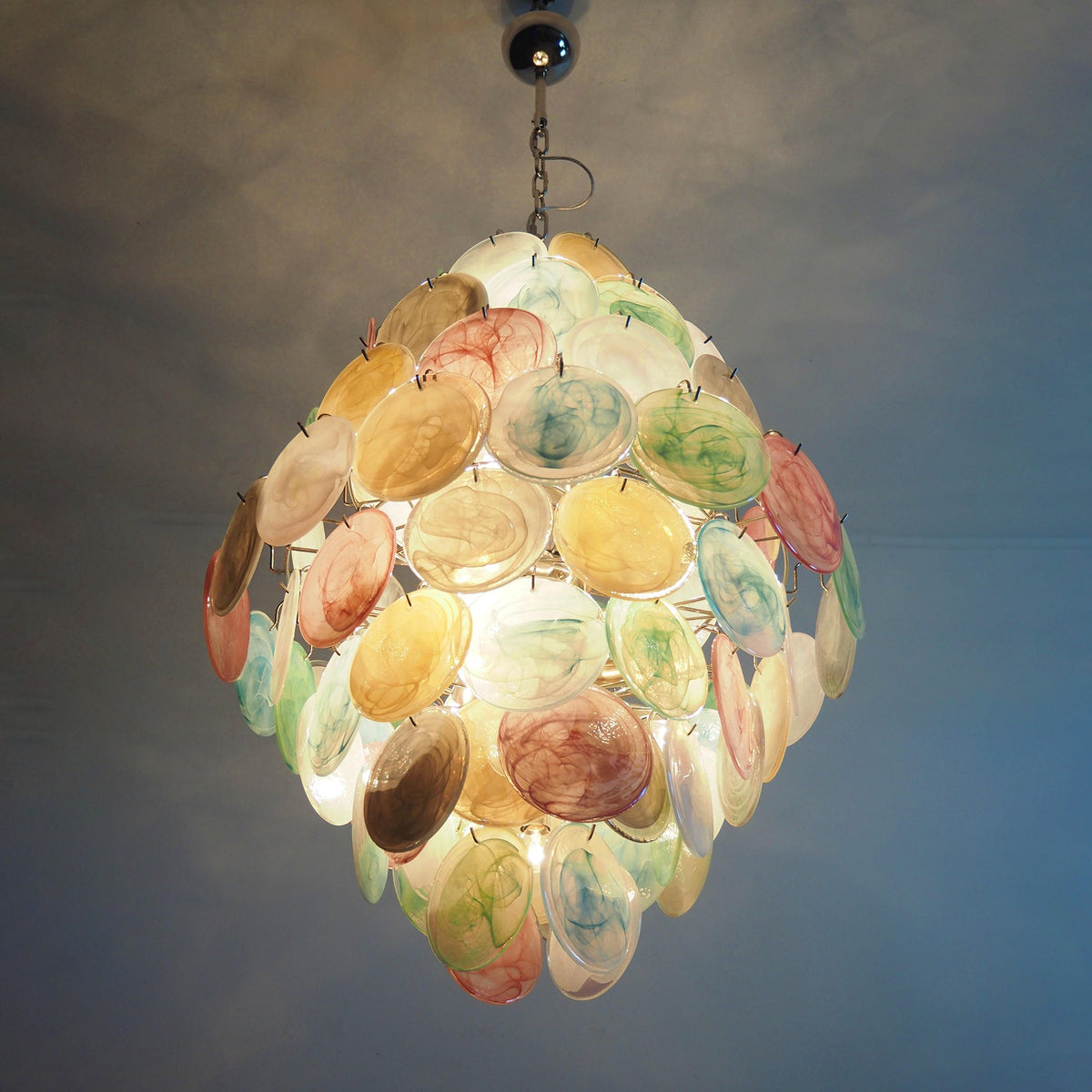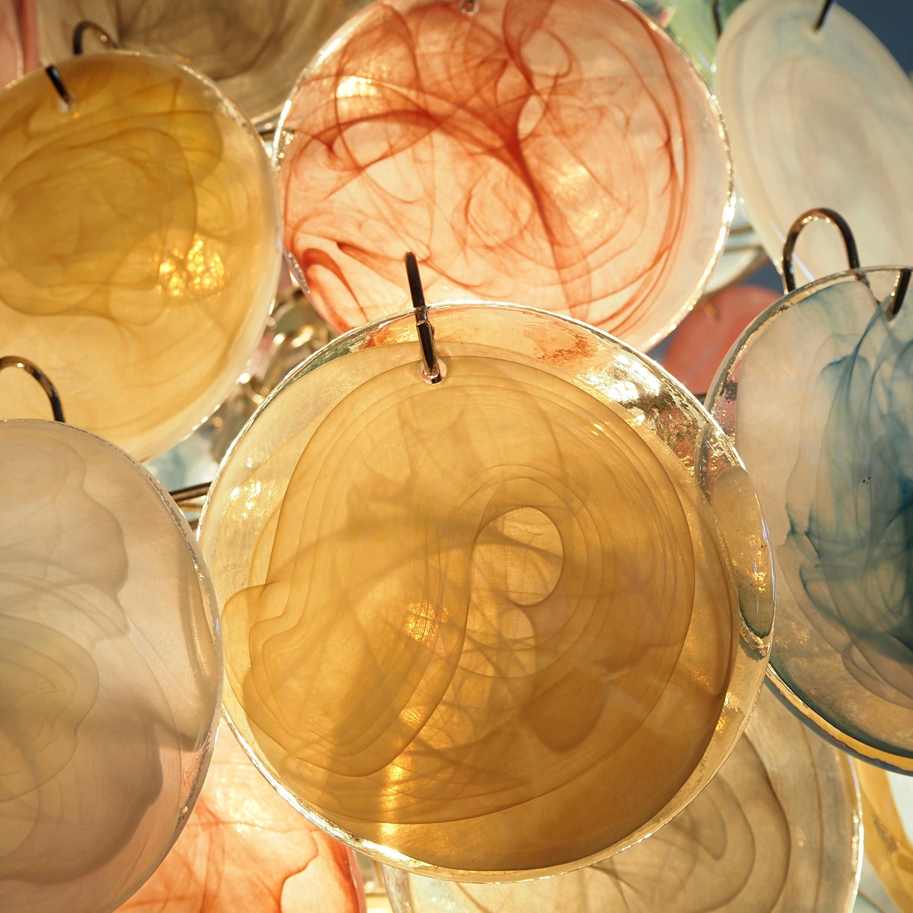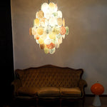 - When darkness falls, the true magic begins. As the internal light source illuminates, a warm and diffuse radiance filters through the multitude of colored, textured disks. The light is softened and tinted, casting a kaleidoscope of gentle, ambient color across your walls and ceiling. The effect is a profoundly warm and artistic atmosphere, evoking the feeling of a sun-drenched stained-glass window or a sophisticated modern art installation. Murano Disc Chandelier Arlecchino 87 provides perfect ambient lighting for dining, relaxing, or entertaining, eliminating all harshness and inviting a sense of calm and wonder.