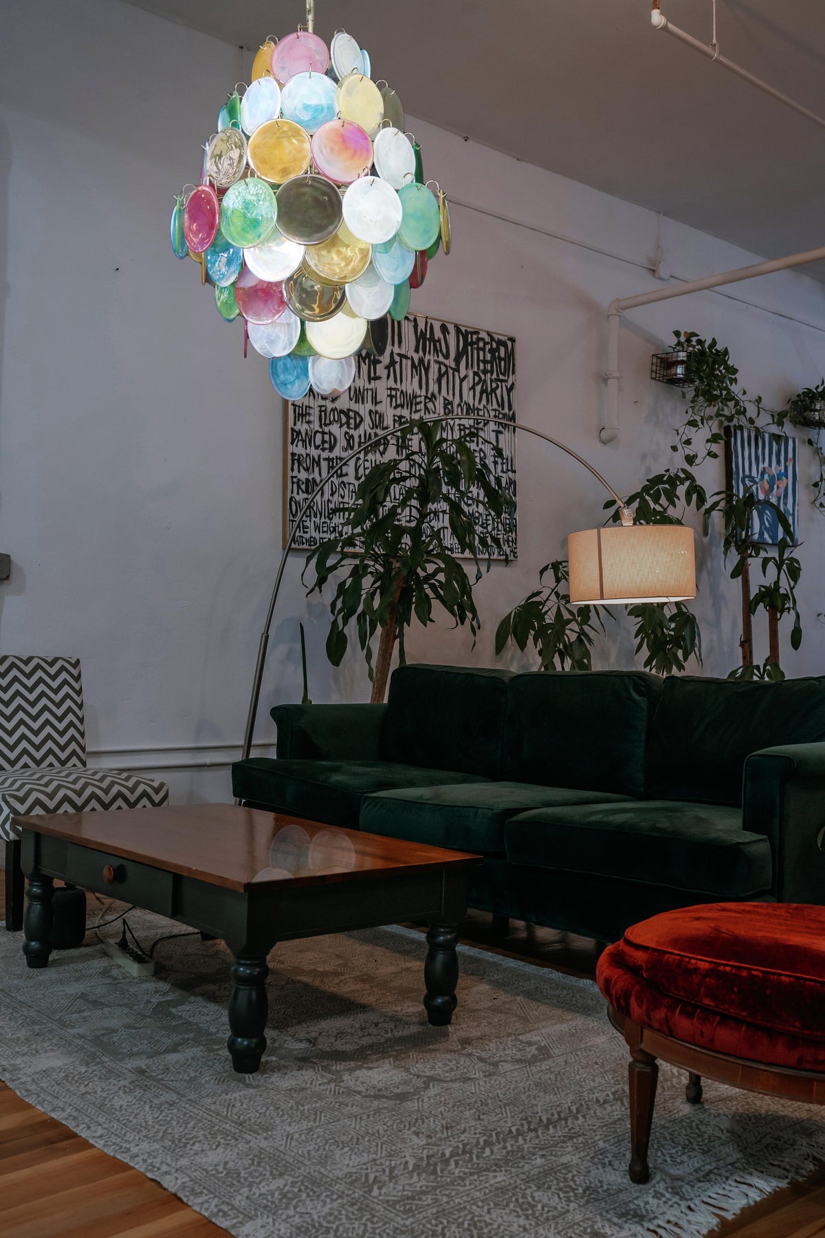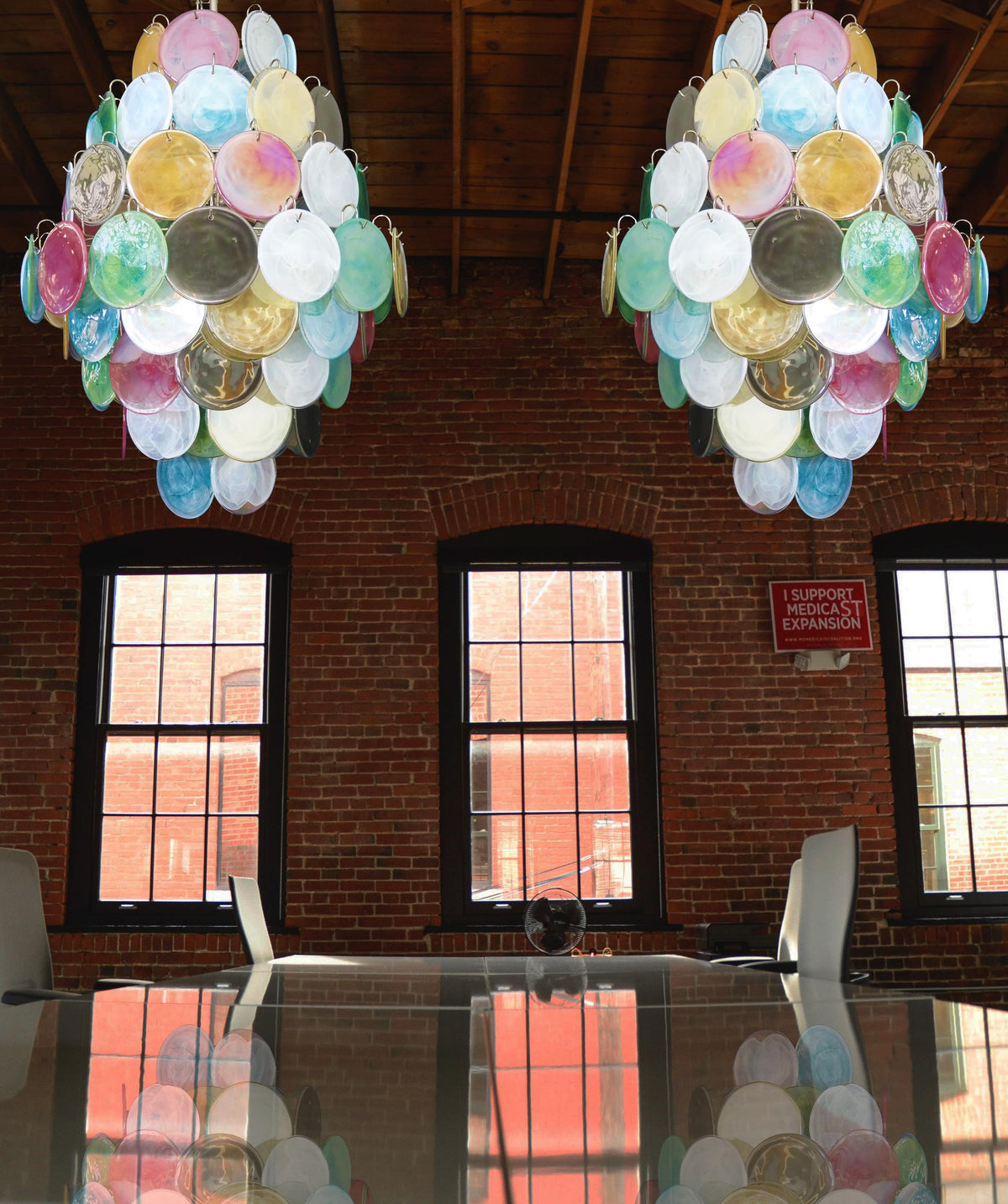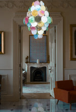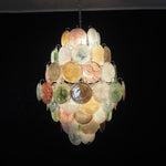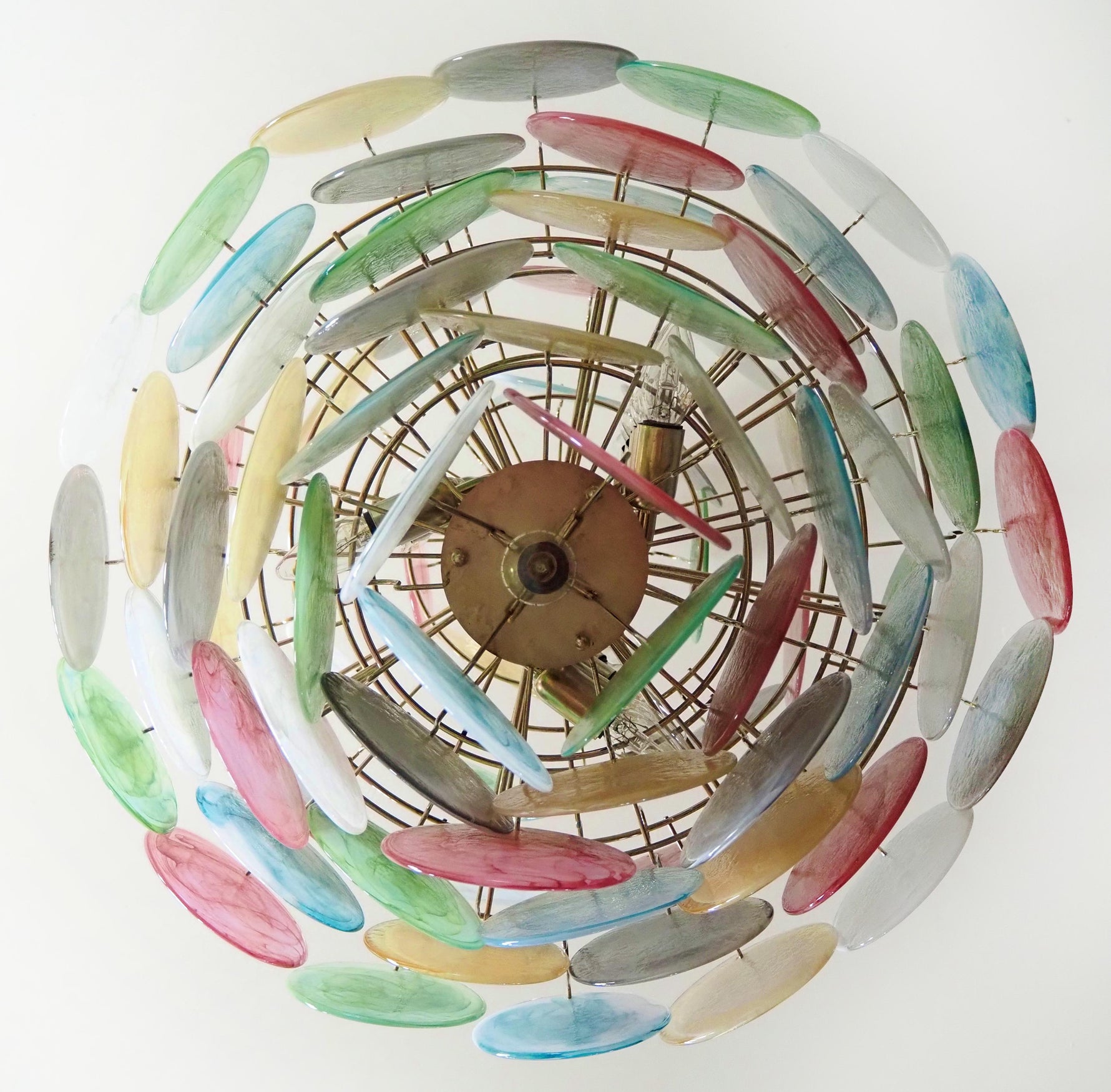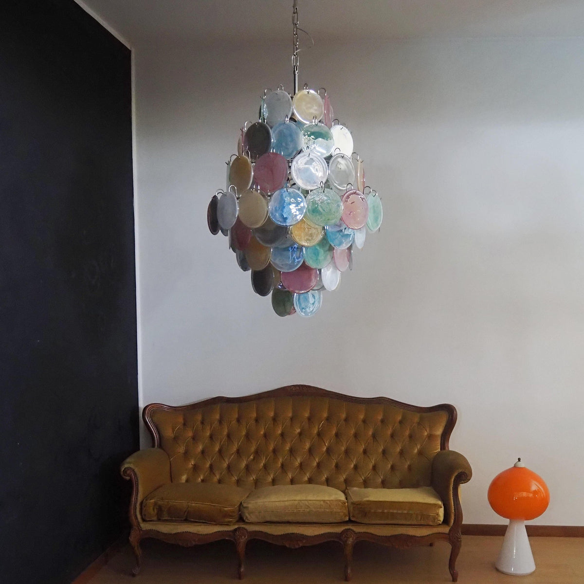 - When darkness falls, the true magic begins. As the internal light source illuminates, a warm and diffuse radiance filters through the multitude of colored, textured disks. The light is softened and tinted, casting a kaleidoscope of gentle, ambient color across your walls and ceiling. The effect is a profoundly warm and artistic atmosphere, evoking the feeling of a sun-drenched stained-glass window or a sophisticated modern art installation. Murano Disc Chandelier Arlecchino 87 provides perfect ambient lighting for dining, relaxing, or entertaining, eliminating all harshness and inviting a sense of calm and wonder.