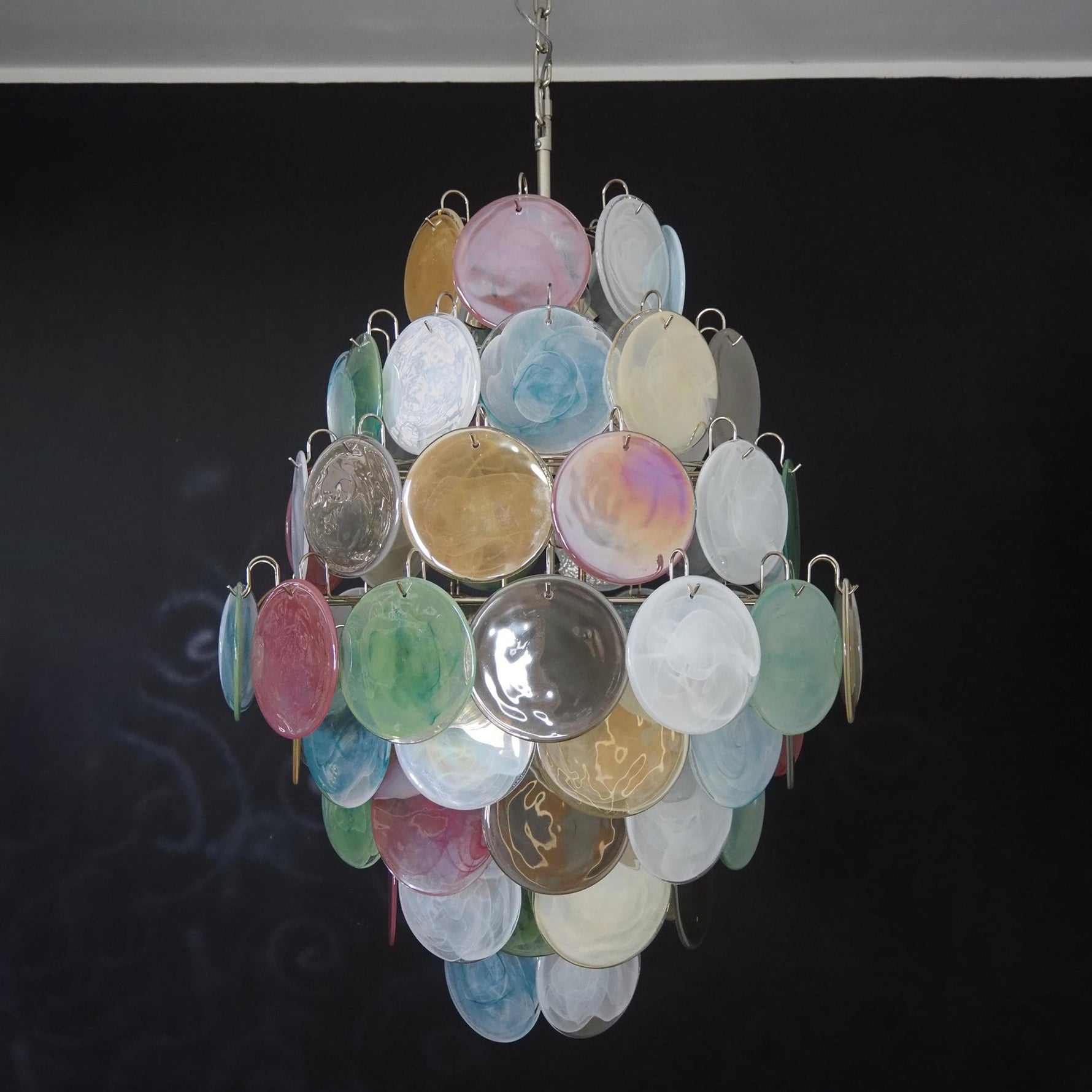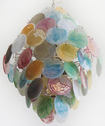 - Drawing inspiration from the centuries-old glassmaking traditions of Murano, Italy, each Murano Disc Chandelier Arlecchino 87 features an exquisite collection of hand-finished glass discs. These are not simple pieces of glass; each one is a unique canvas, boasting a deep, smoky texture and a subtle, variegated hue that captures and plays with light in its own way. The palette is a harmonious symphony of soft, pastel tones—think of the gentle blush of a setting sun, the soft warmth of primrose yellow, the tranquil whisper of seafoam green, and the serene depth of dusty blue. These colors are layered and intertwined, creating a vibrant yet soothing visual tapestry.
