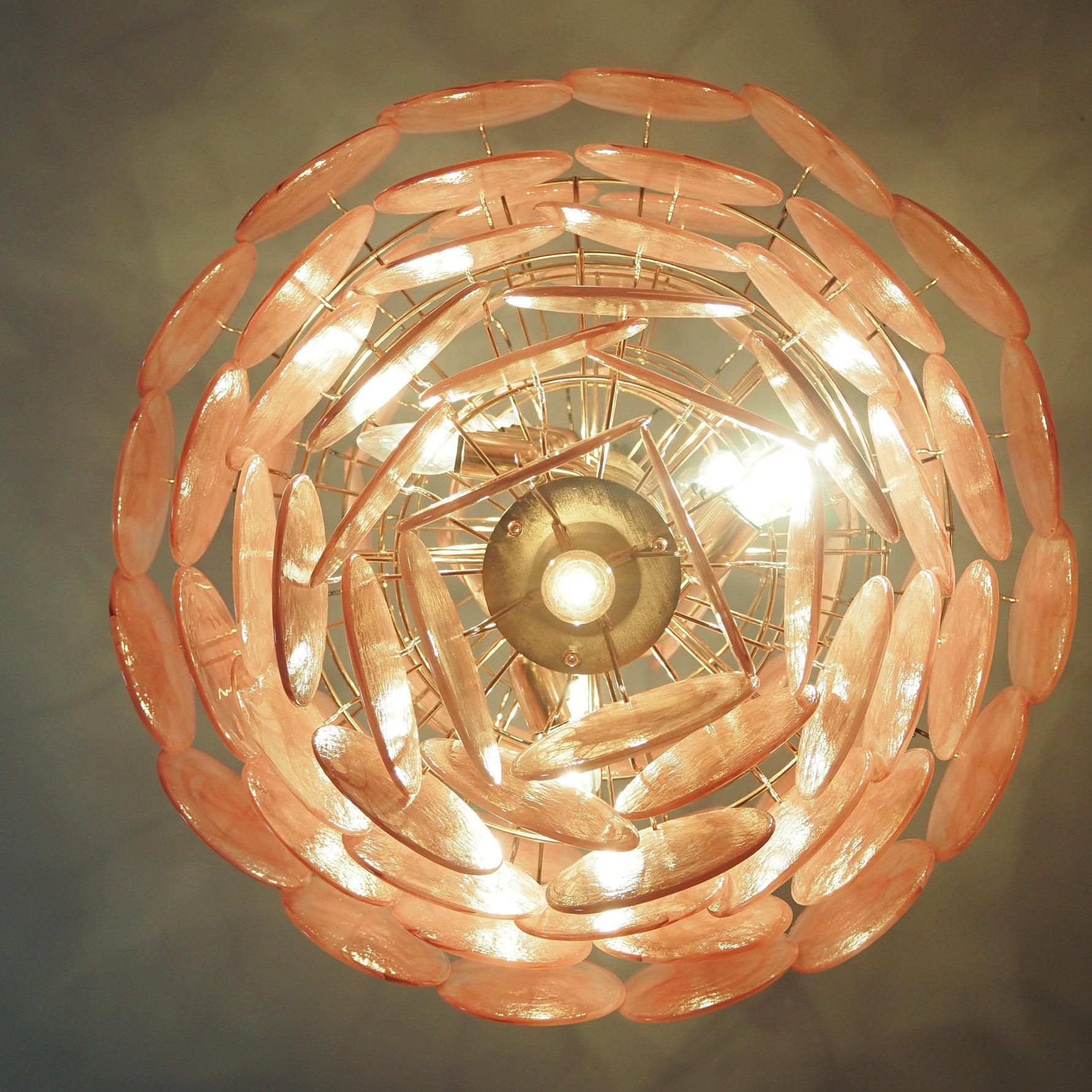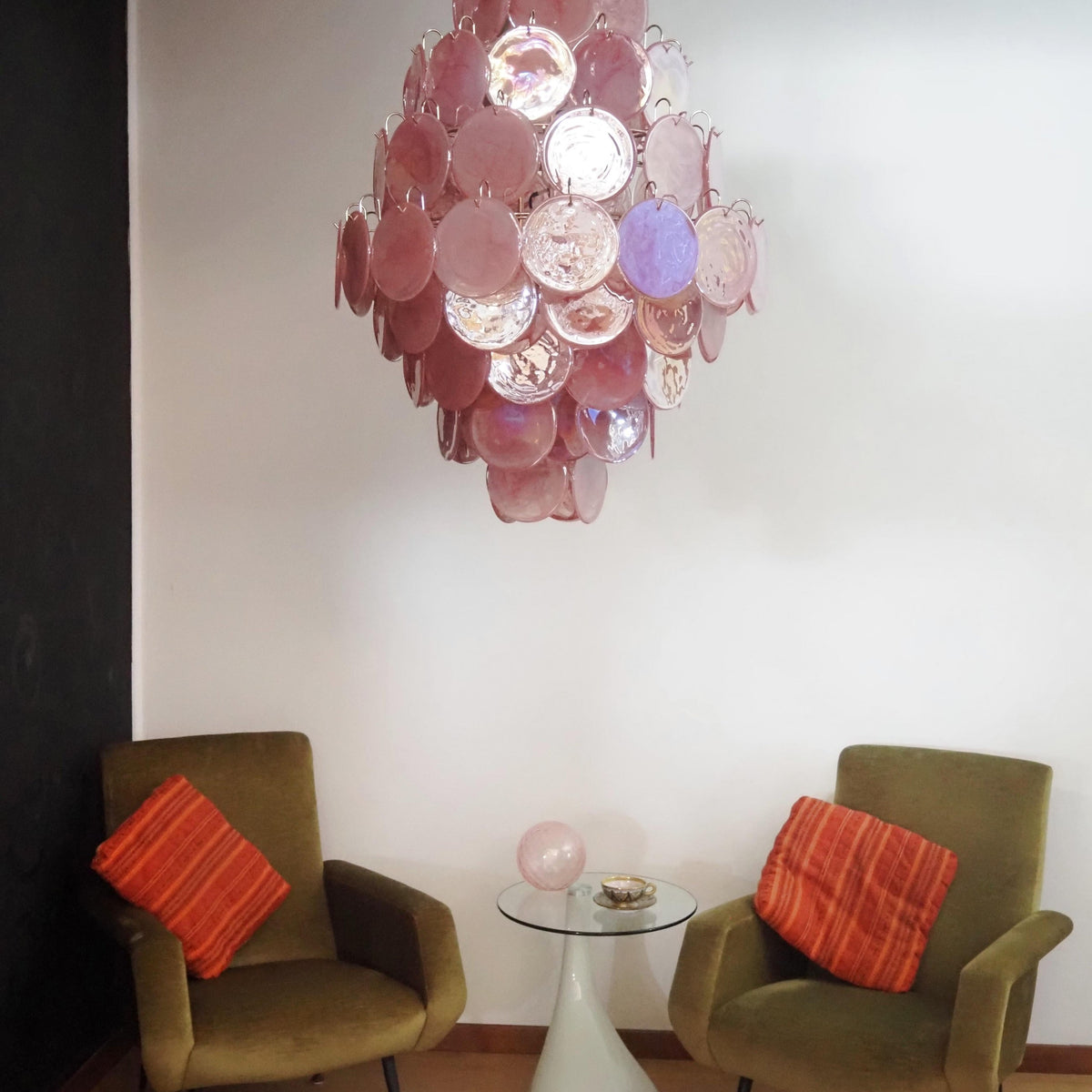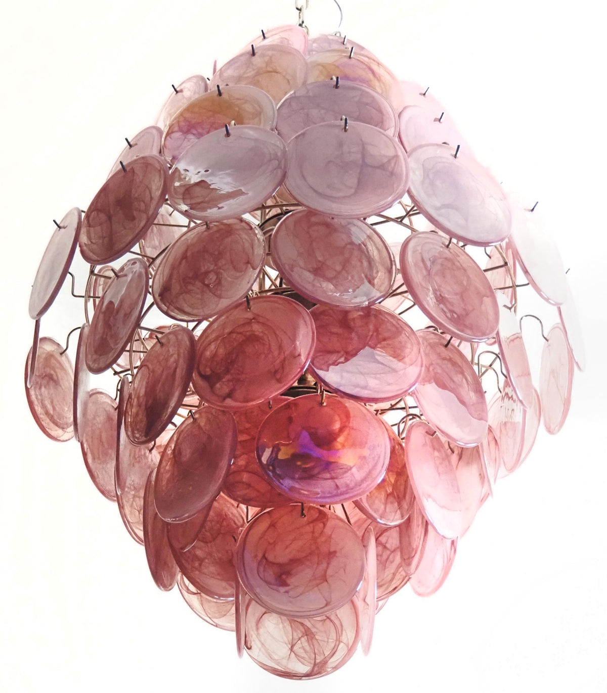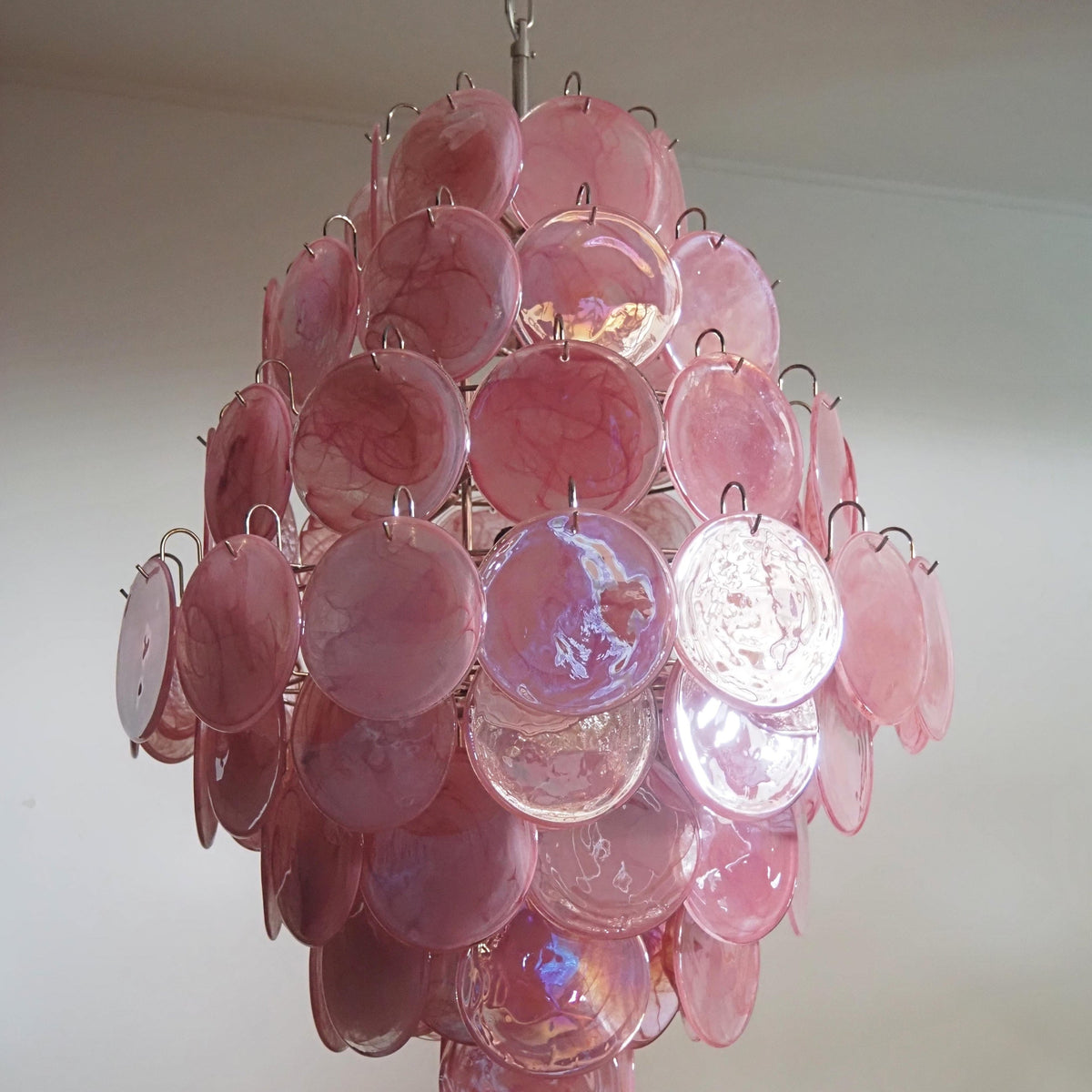 - Transform any room into a breathtaking sanctuary with the Murano Pink Disc Chandelier 87. This stunning piece is more than just a light fixture; it's a captivating work of art, designed to become the heart of your home's decor. Inspired by the legendary glassmaking of Murano, it brings a touch of Italian artistry and romantic charm to your interior.