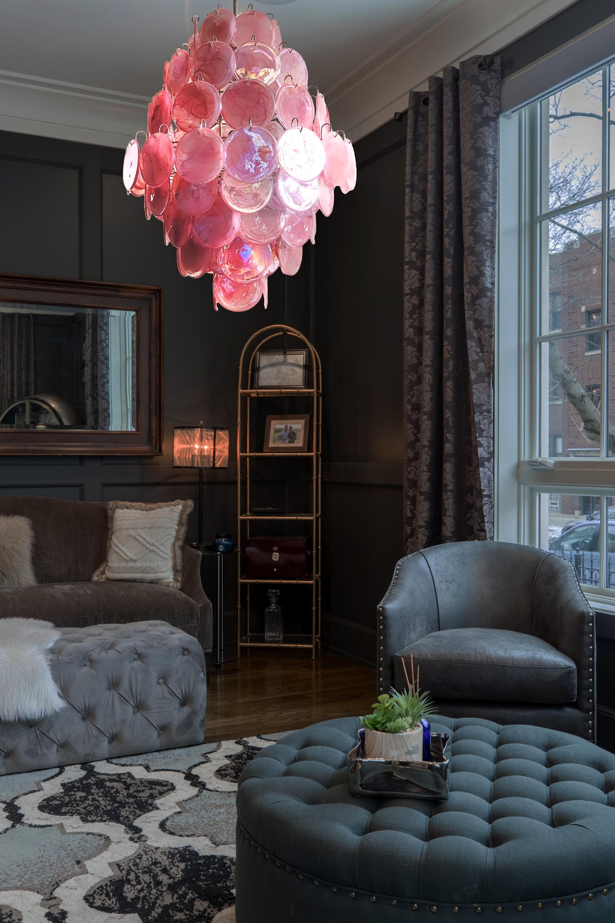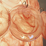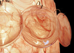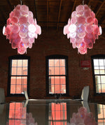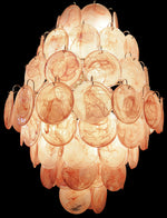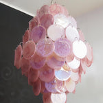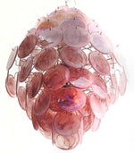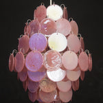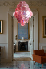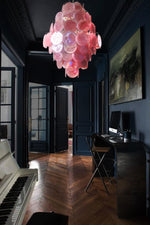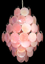- Crafted with an artistic eye for detail, the Murano Pink Disc Chandelier 87 features a collection of hand-blown pink glass disks, each with a unique, soft-smudge texture. The discs are arranged in a beautiful, organic cluster, showcasing a mesmerizing gradient of color that flows from the softest blush to a deep rose and hints of luxurious plum. This vibrant yet gentle color palette ensures the piece is both a statement and a harmonizing element in your space.