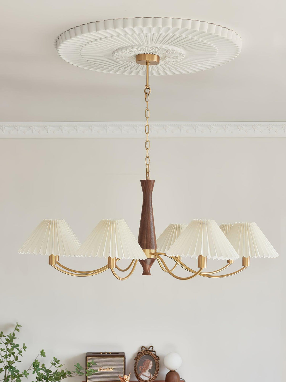 - The body of Sensel Chandelier is made of walnut and brass for great texture. The shade made of fabric will continue the vintage vibe, and a different number of lamp heads are available to illuminate different areas.